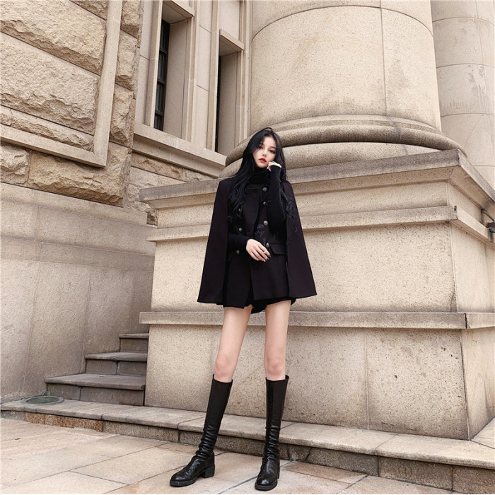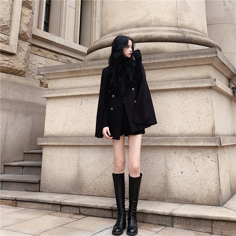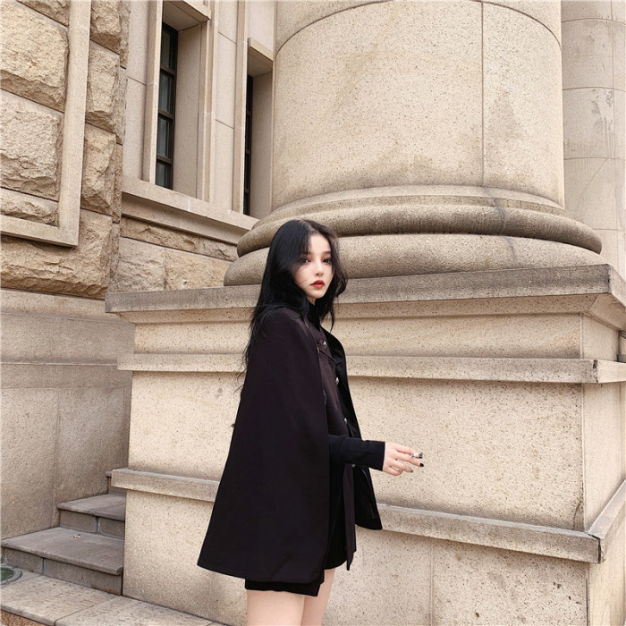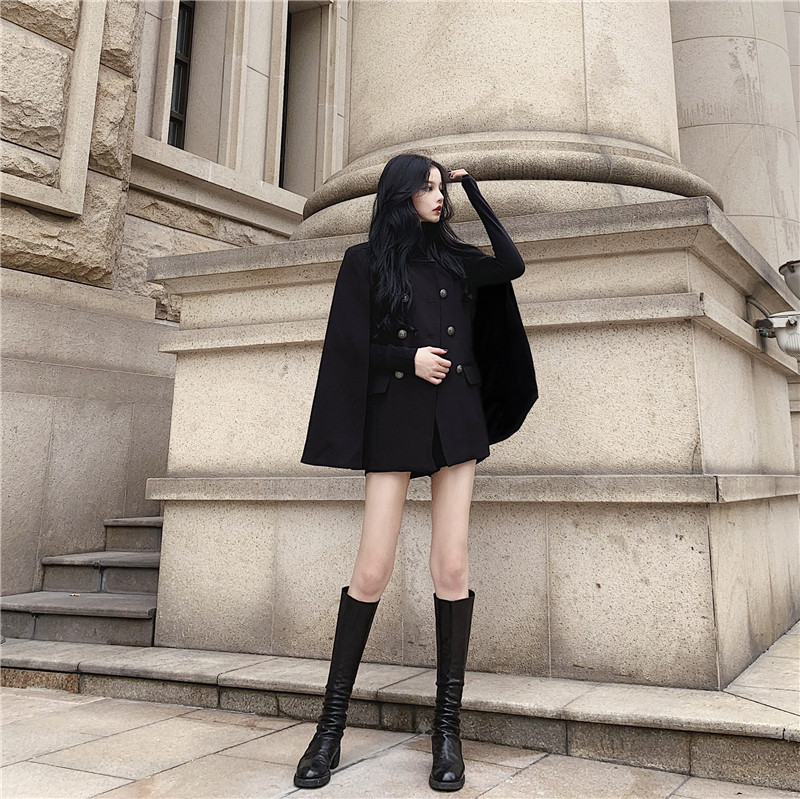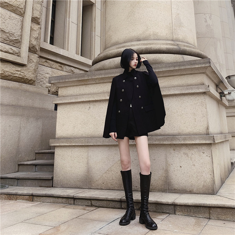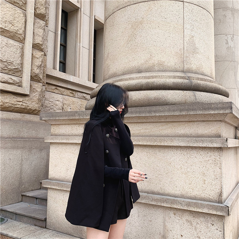 黑色毛呢外套女2023韓版流行加厚娃娃領a字鬭篷赫本小個子呢大衣