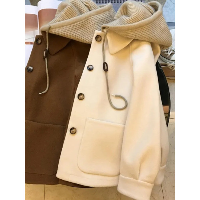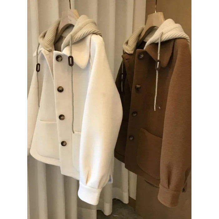 高級感拼接針織連帽毛呢大衣女胖mm大碼300斤加厚假兩件棉服外套