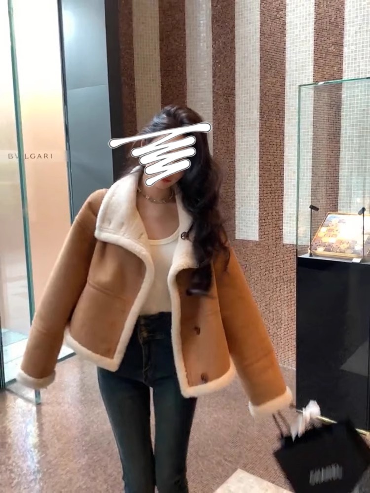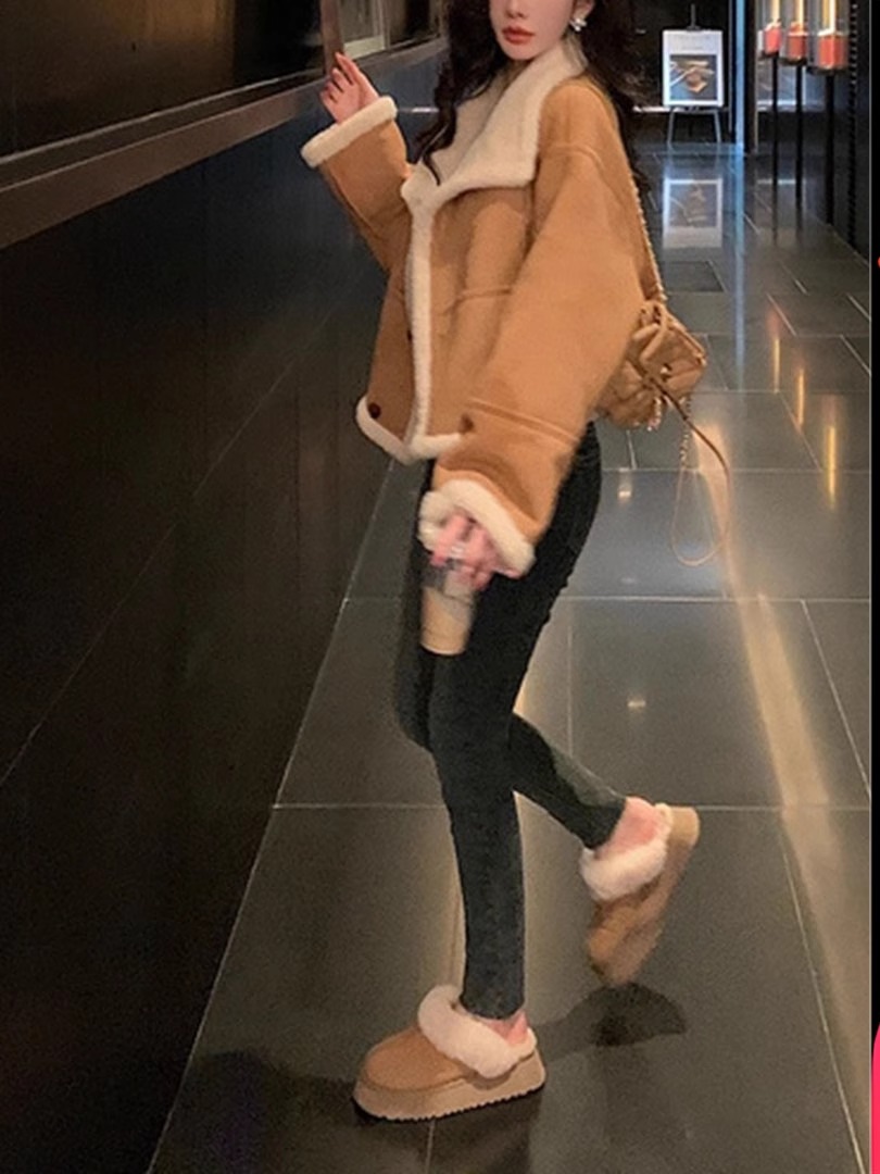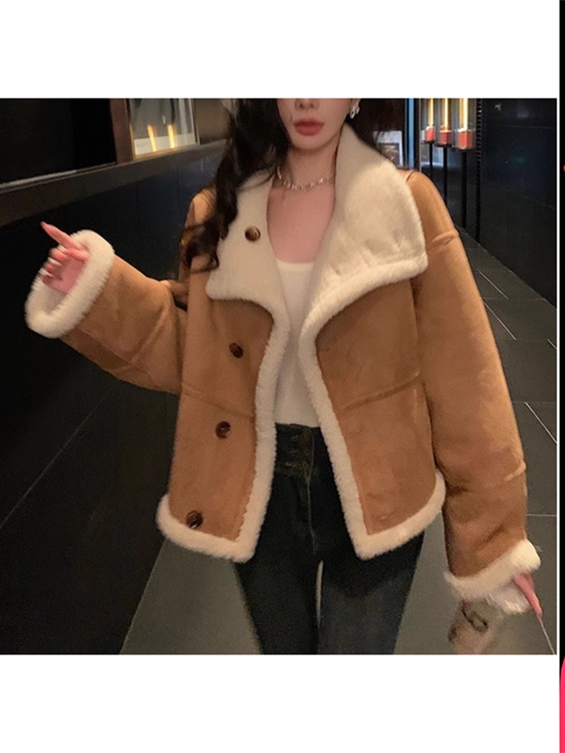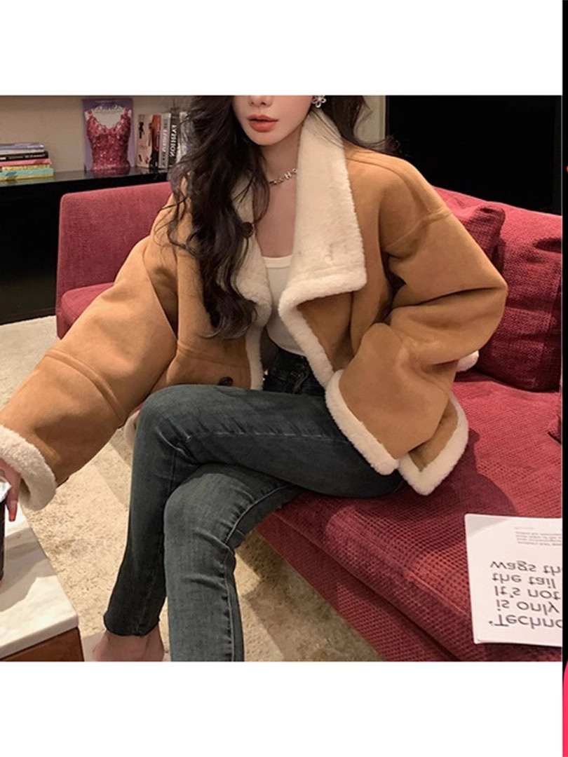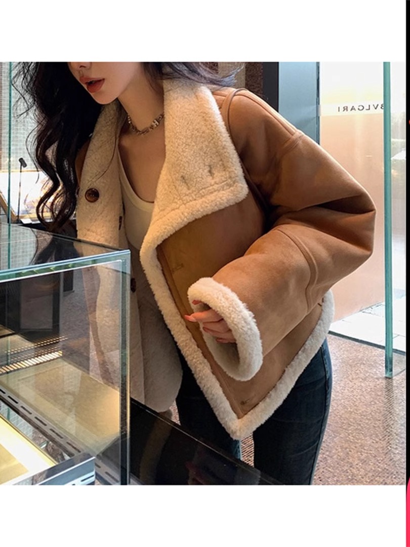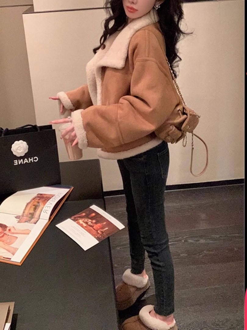 麂皮絨皮毛一體羊羔毛翻領外套女秋冬小個子短款加厚夾克上衣棉服