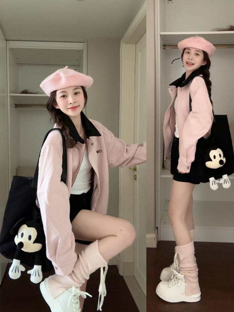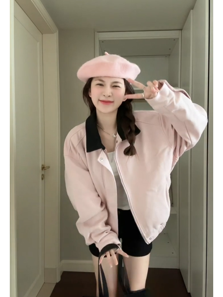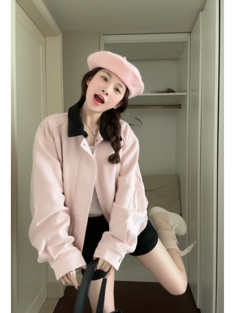 韓系粉色麂皮小香風外套女春秋2025新款美式短款小衆夾克翻領上衣