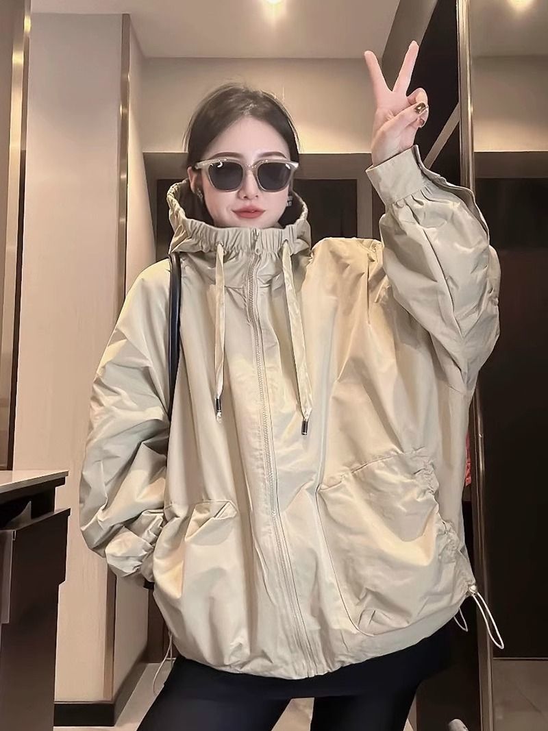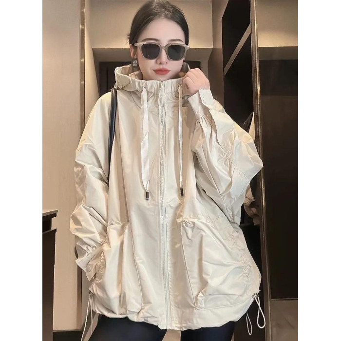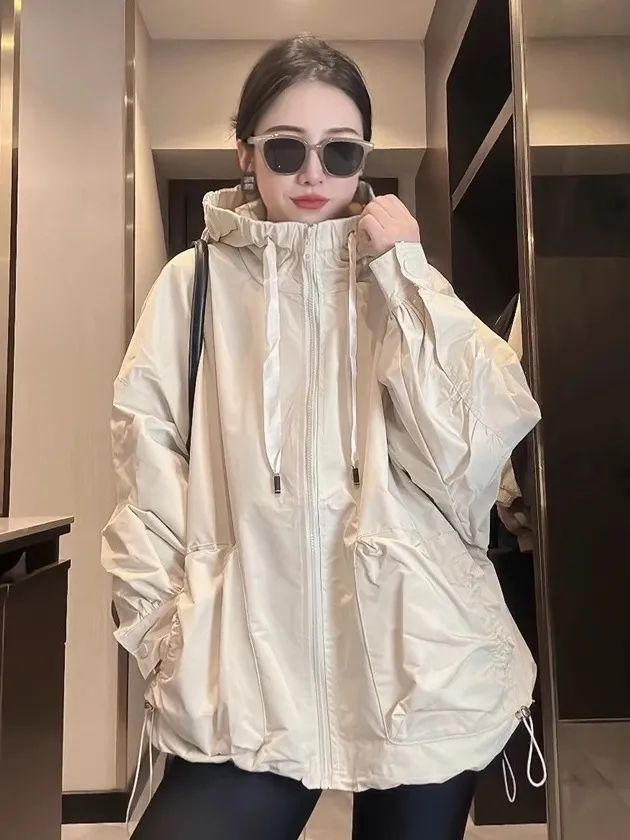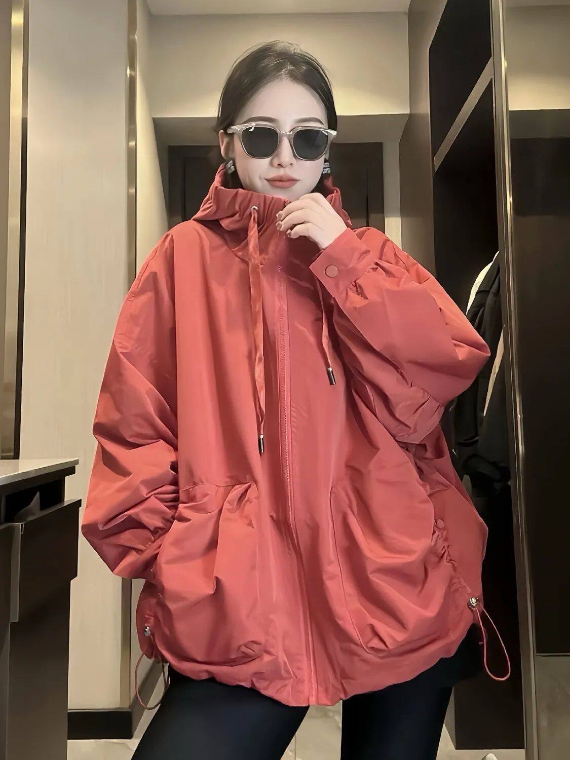 大碼胖mm300斤休閒沖鋒衣外套女春秋款寬松中長款抽繩連帽風衣潮2