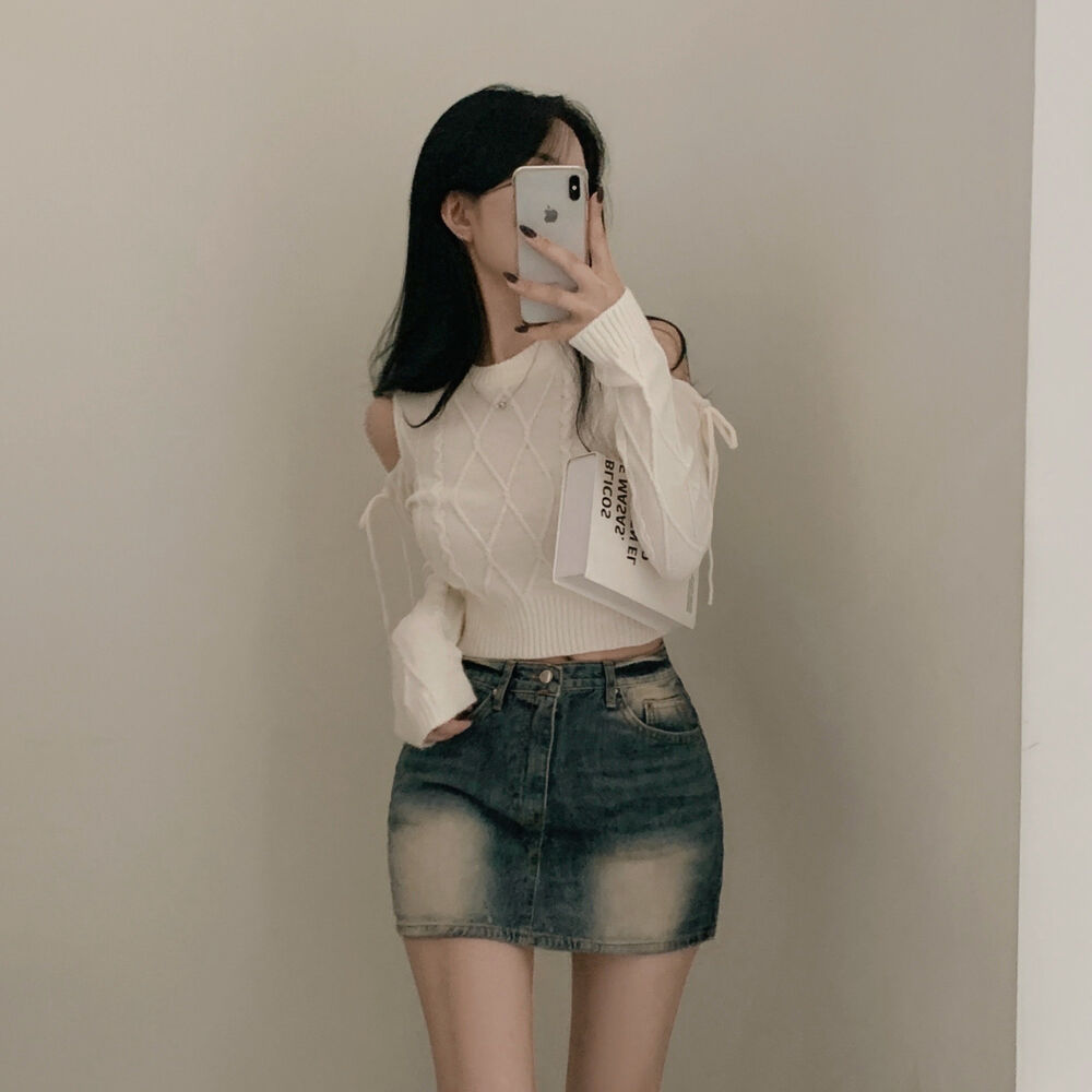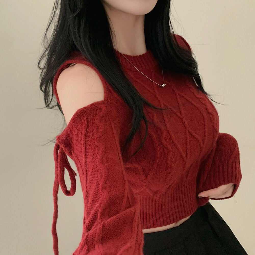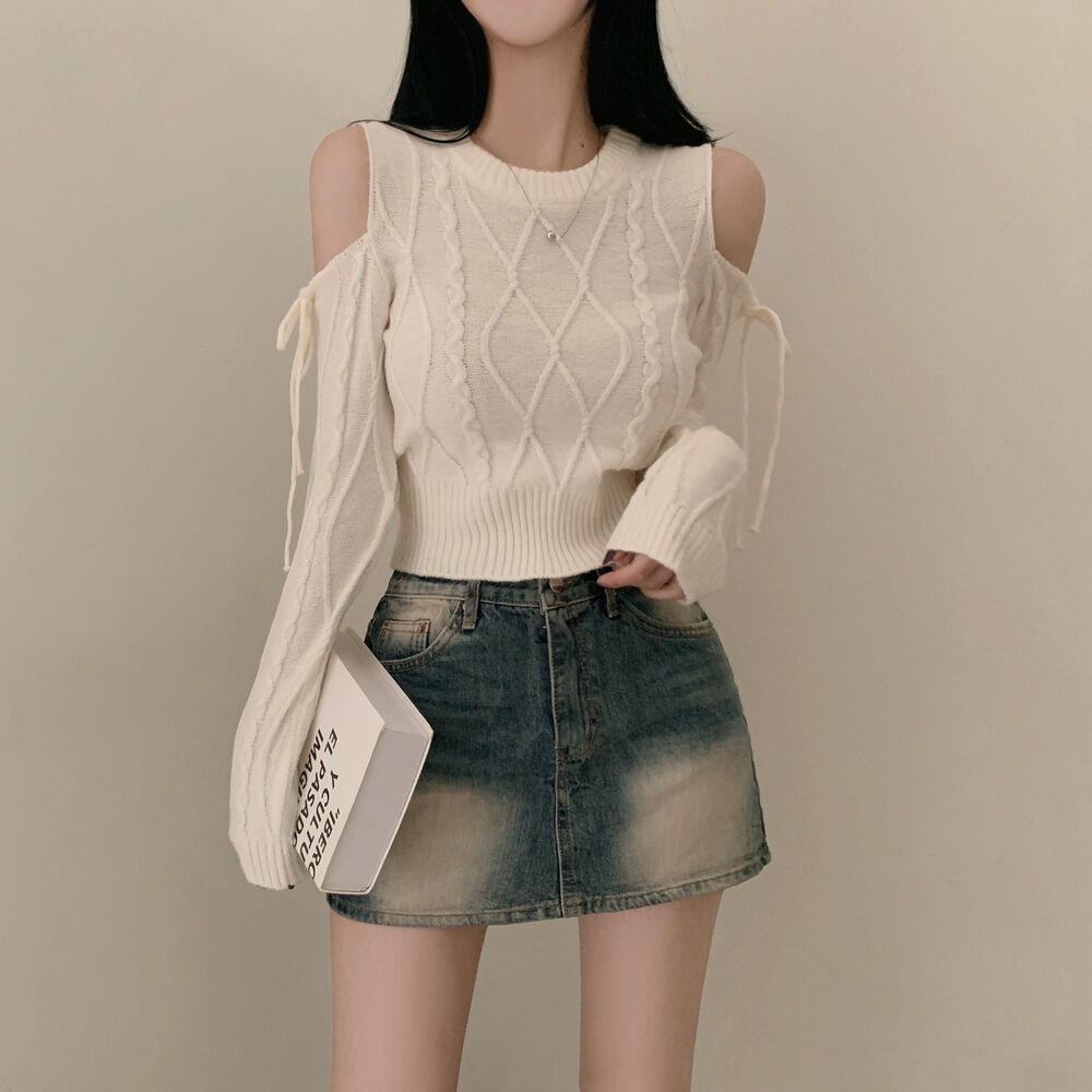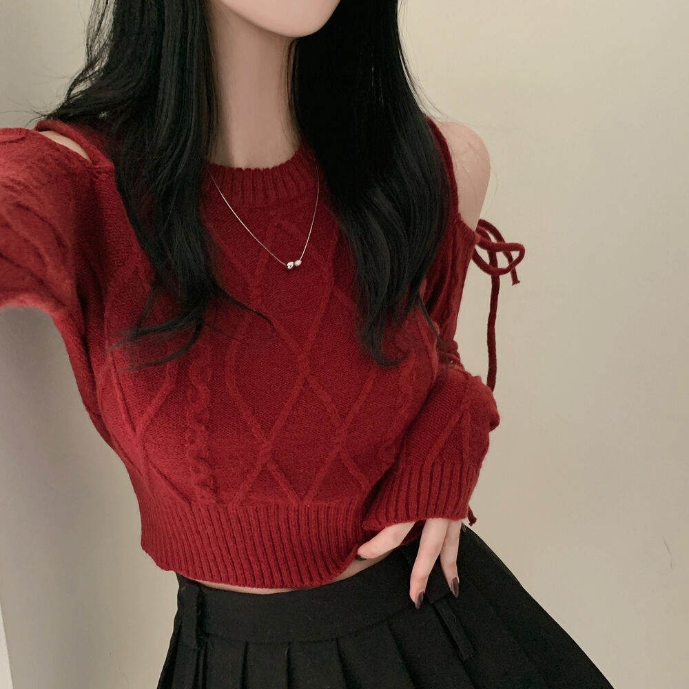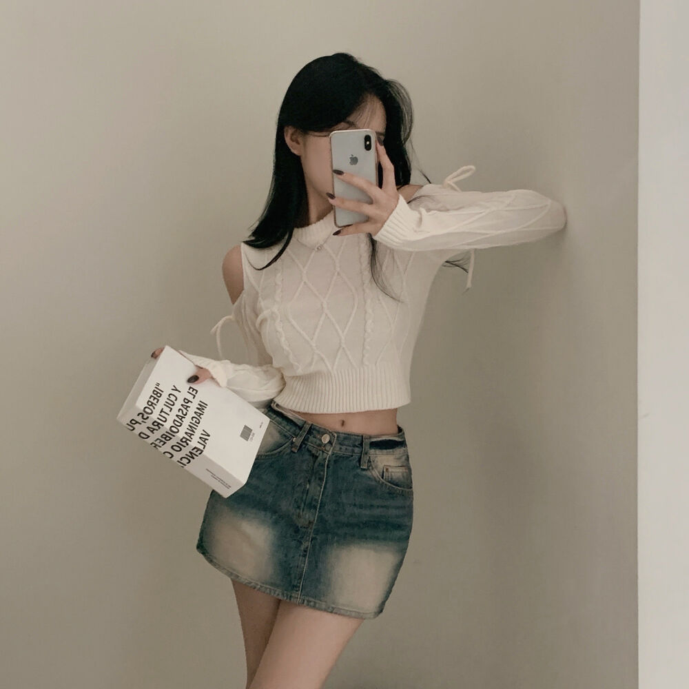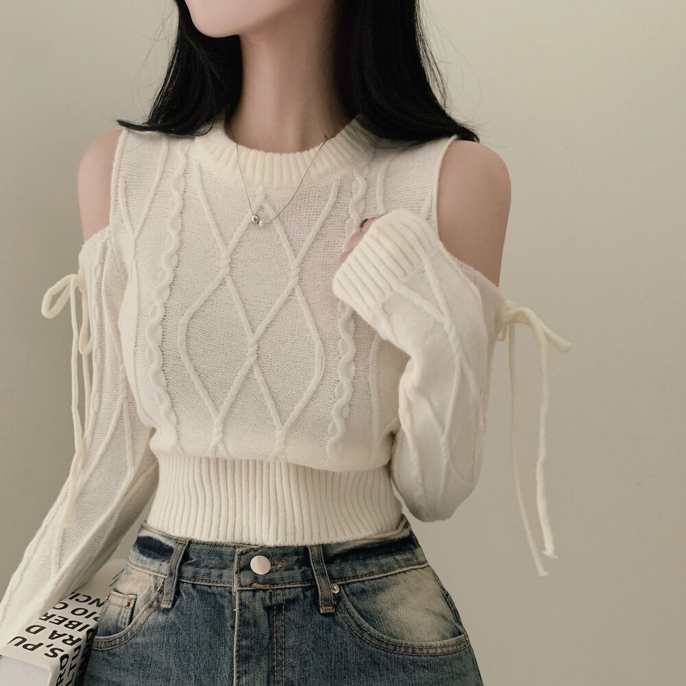 毛衣女春秋季韓系純欲露肩麻花針織衫設計感小衆高腰長袖短款上衣
