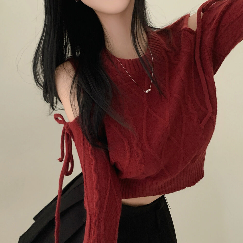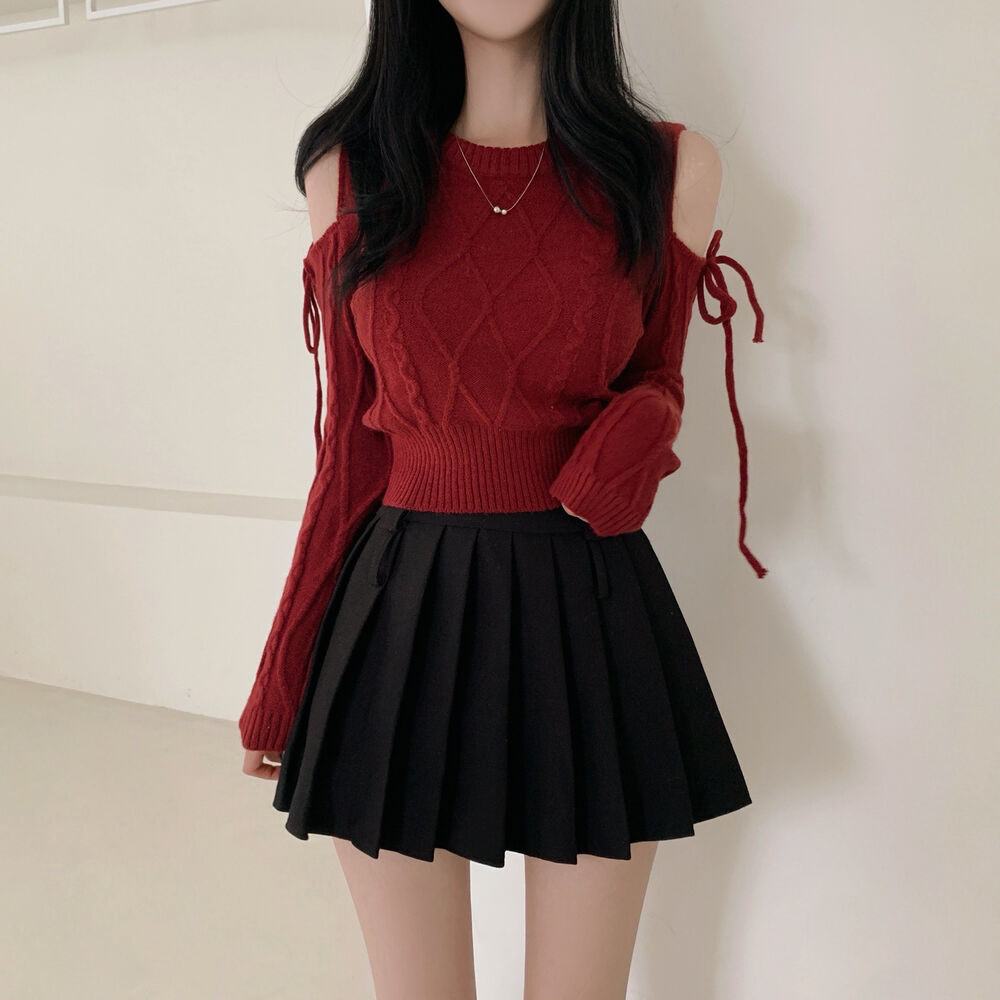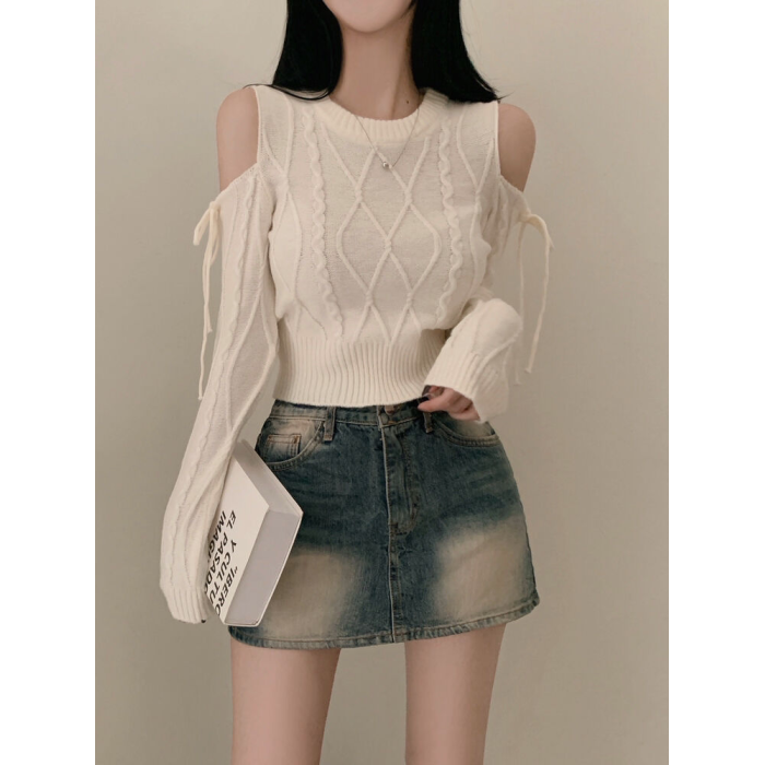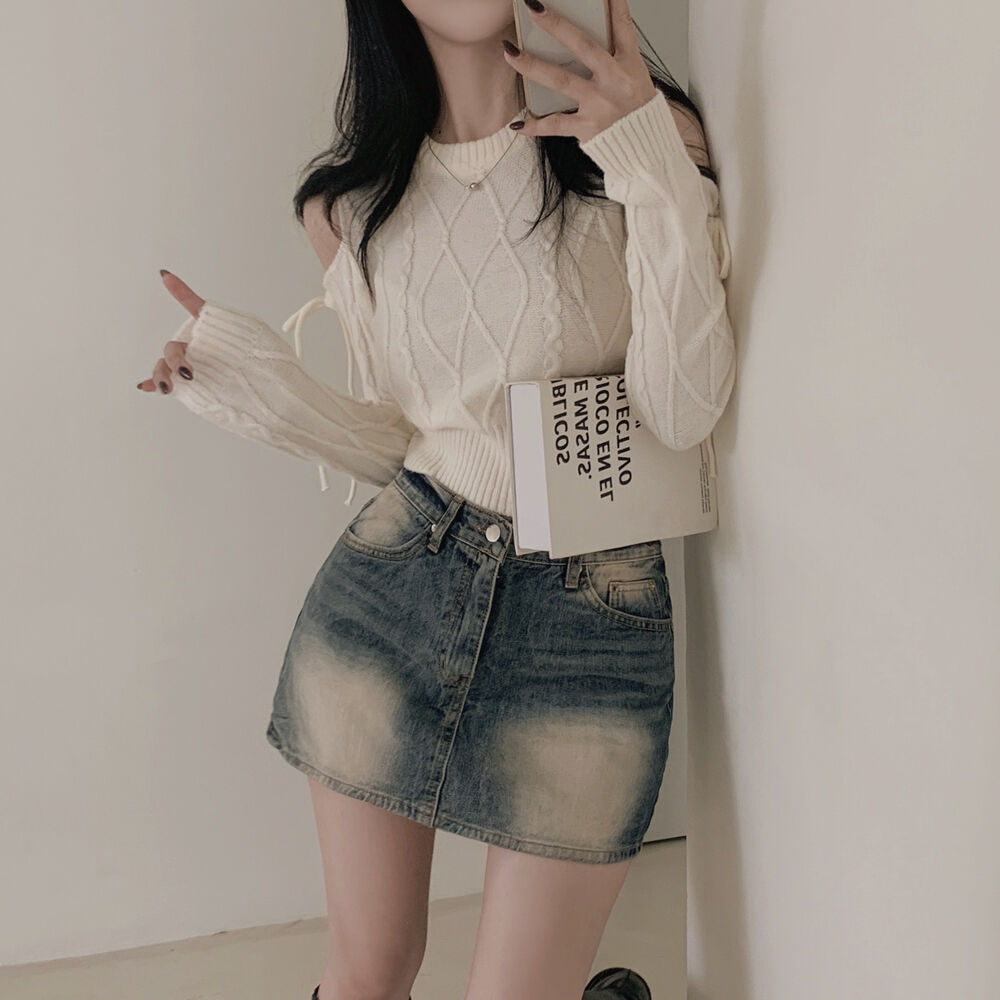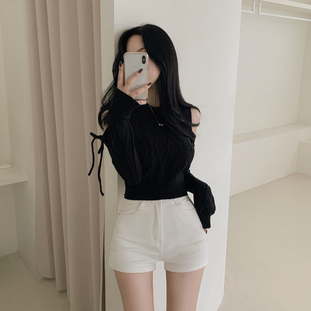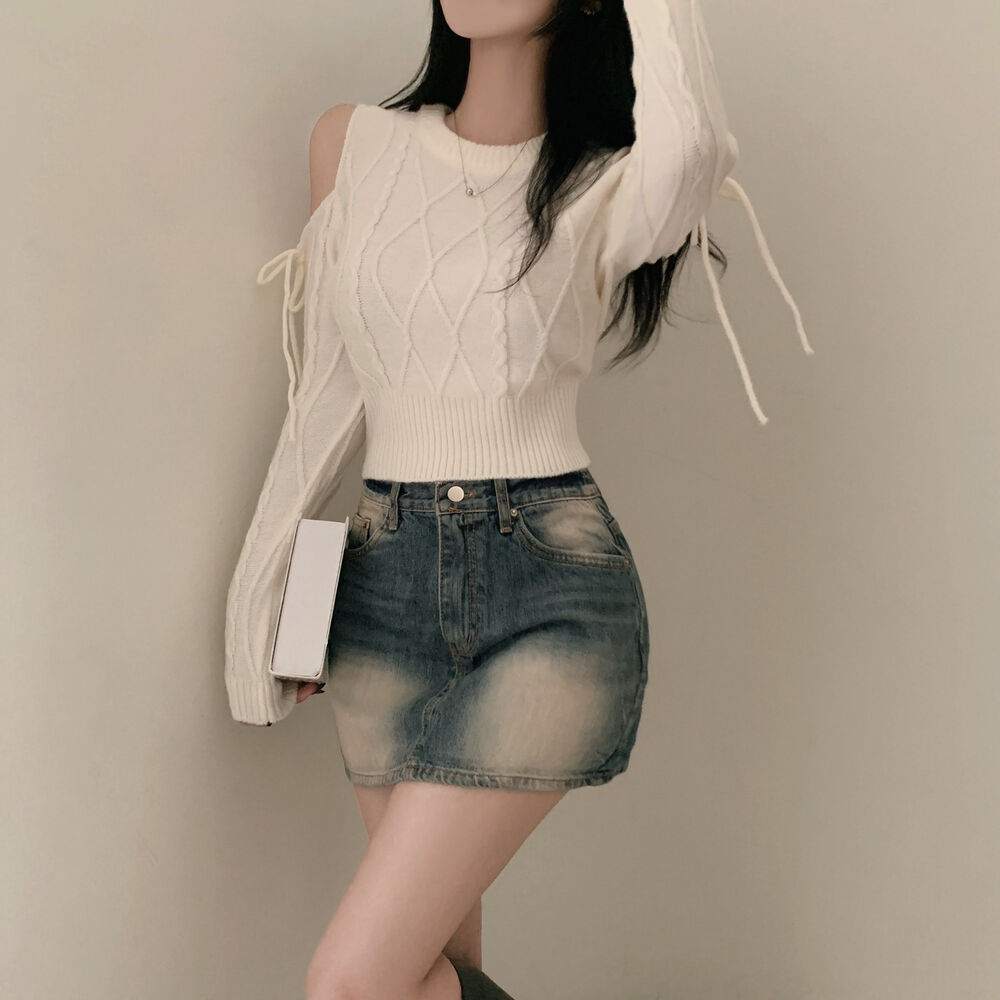 毛衣女春秋季韓系純欲露肩麻花針織衫設計感小衆高腰長袖短款上衣