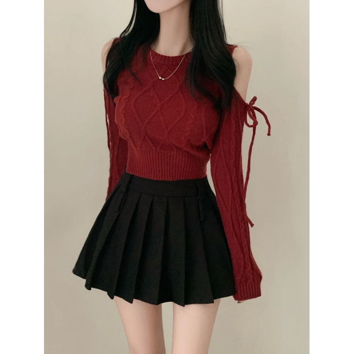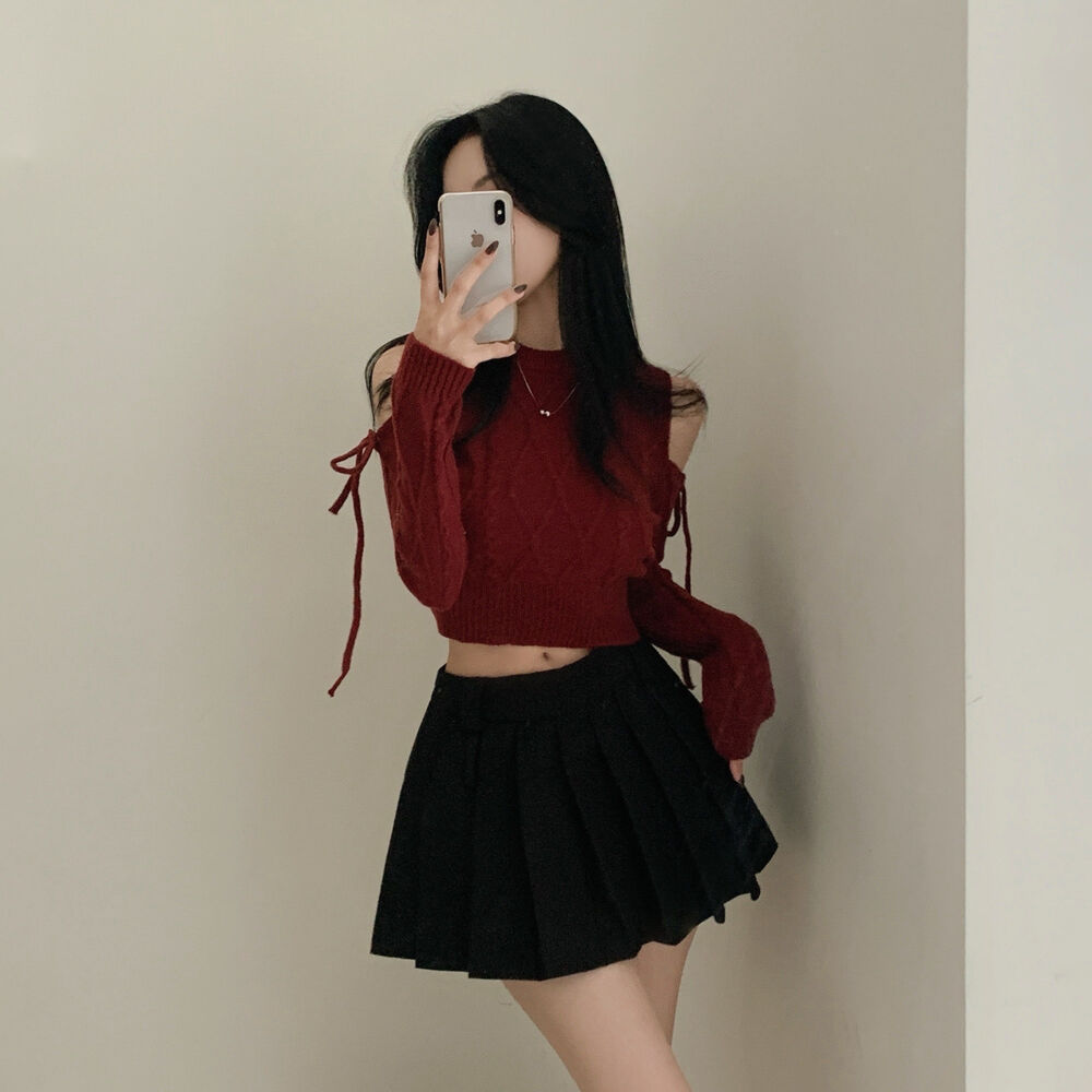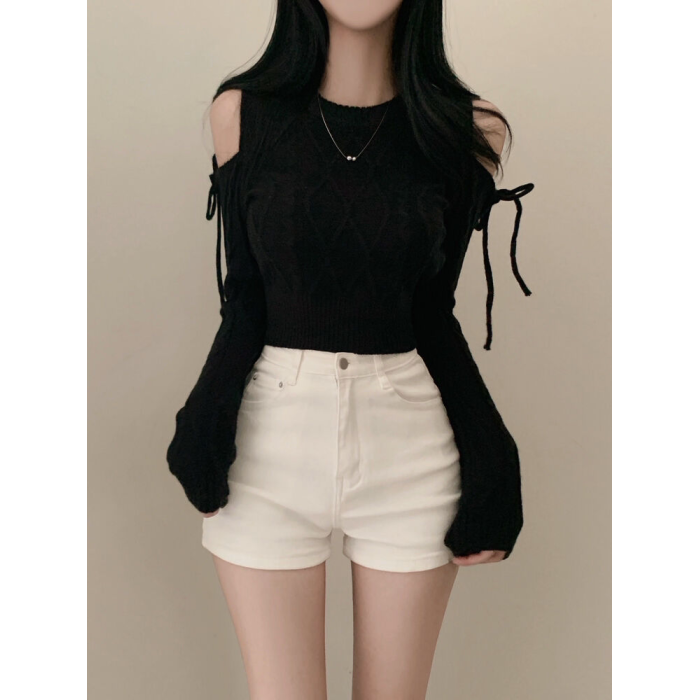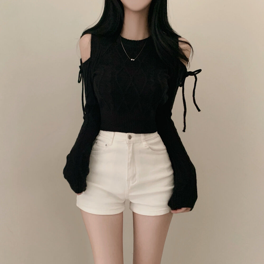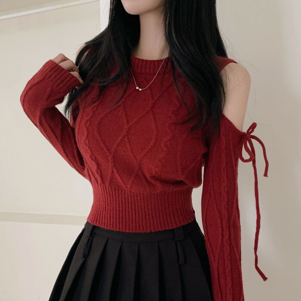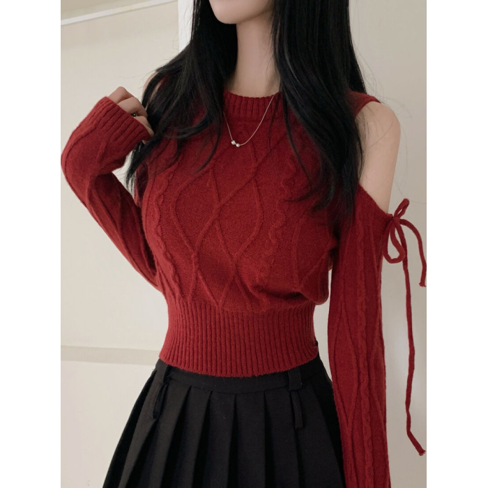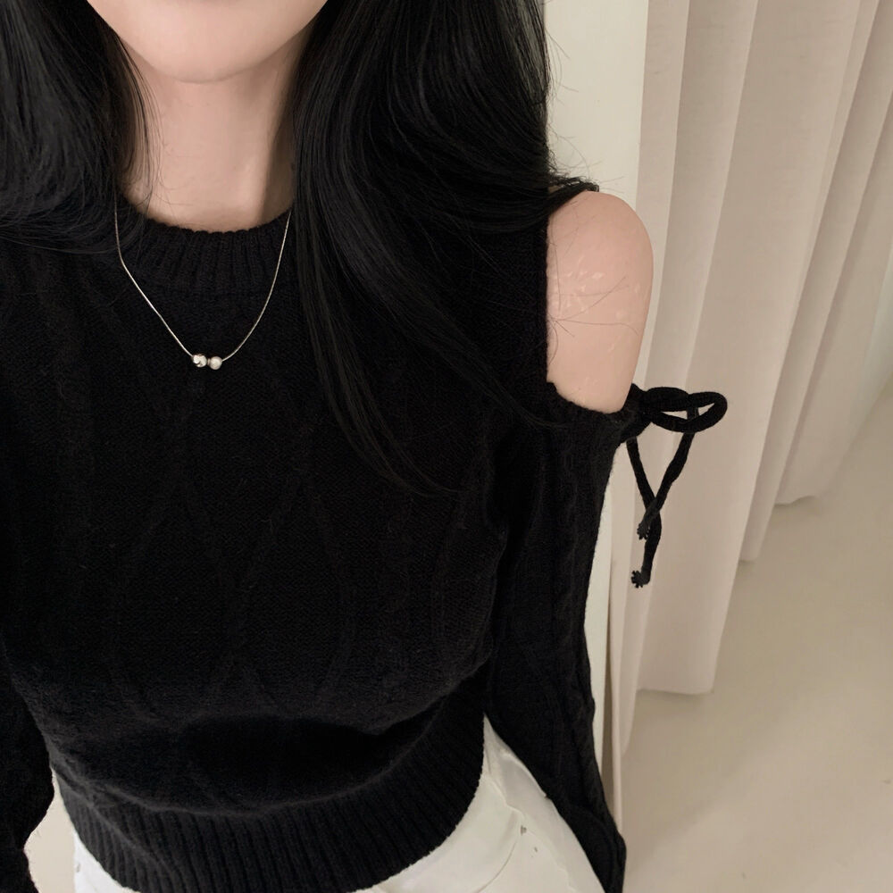 毛衣女春秋季韓系純欲露肩麻花針織衫設計感小衆高腰長袖短款上衣