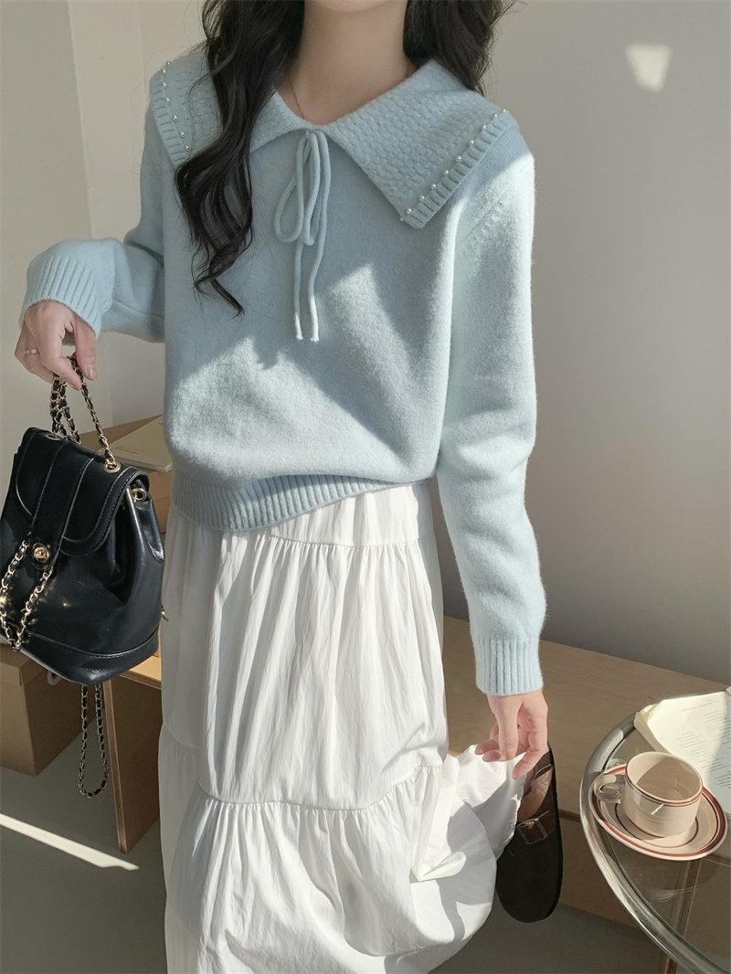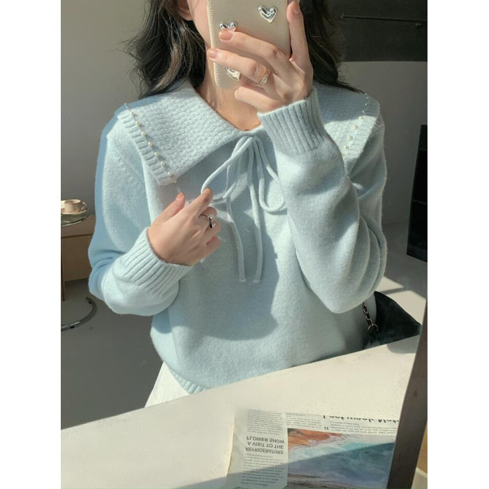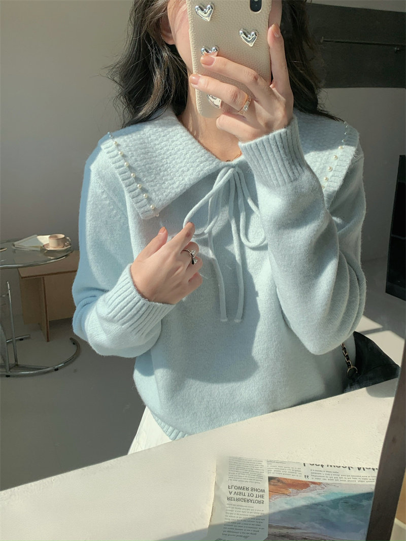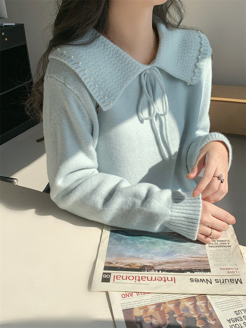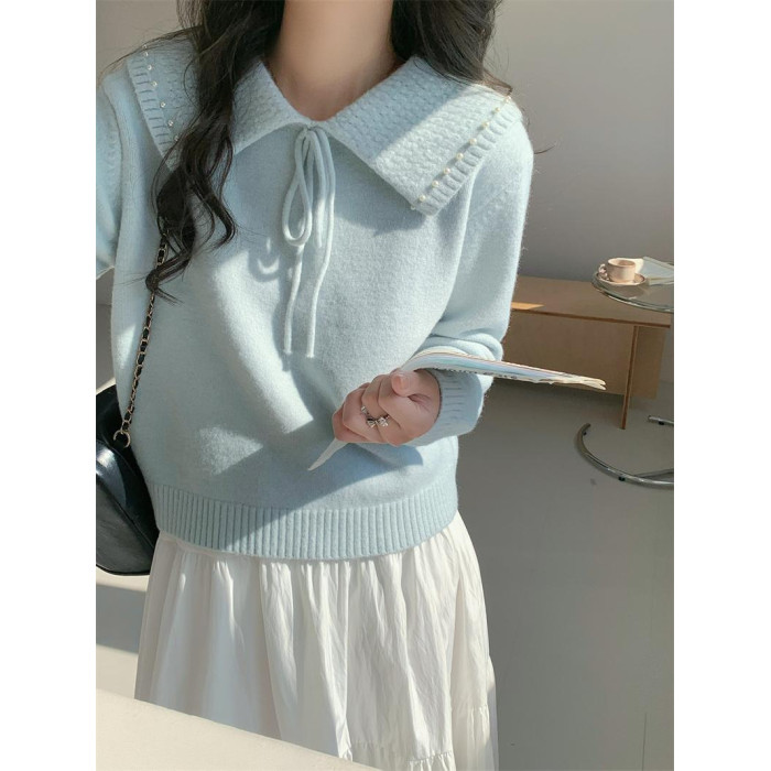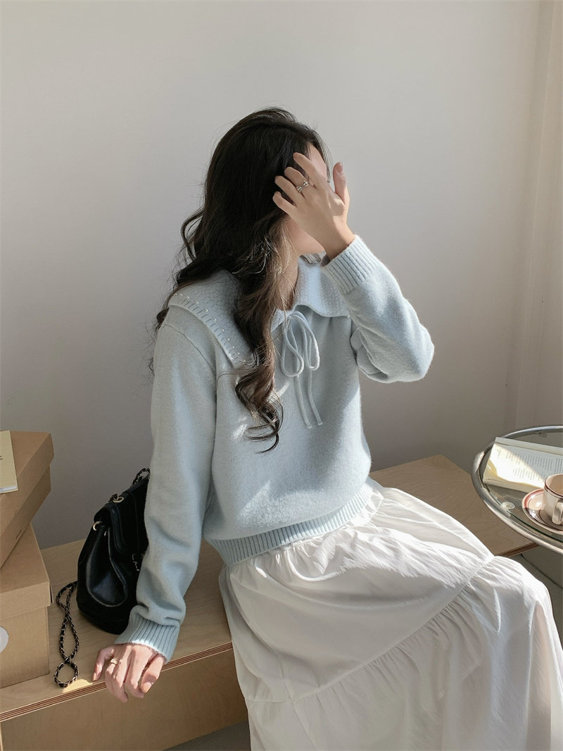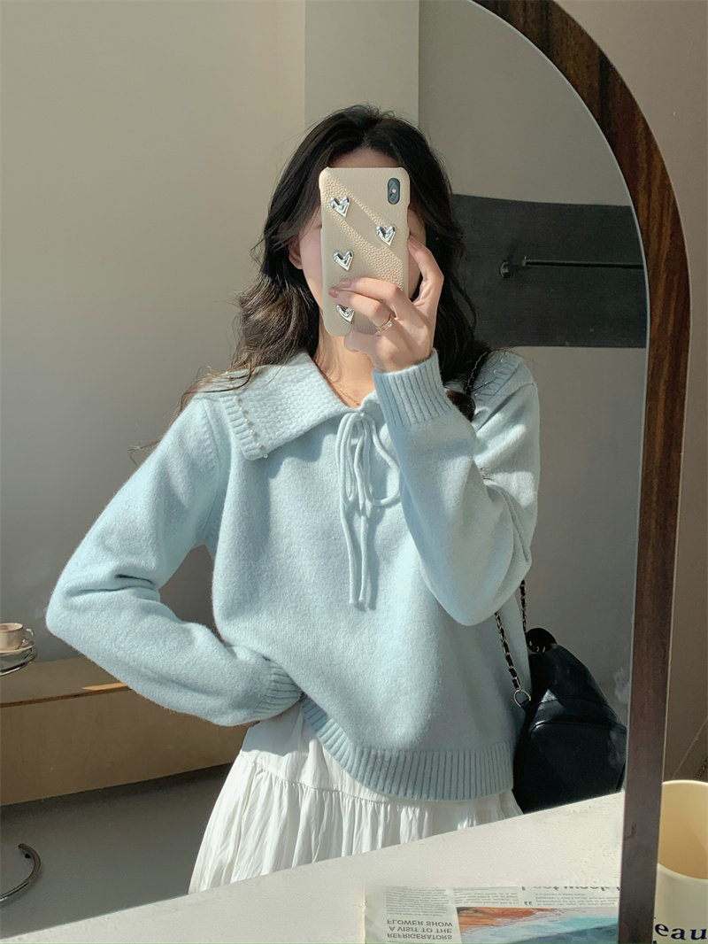 溫柔風奶系淺藍軟糯甜美套頭寬松設計感小衆翻領毛衣女系帶針織衫
