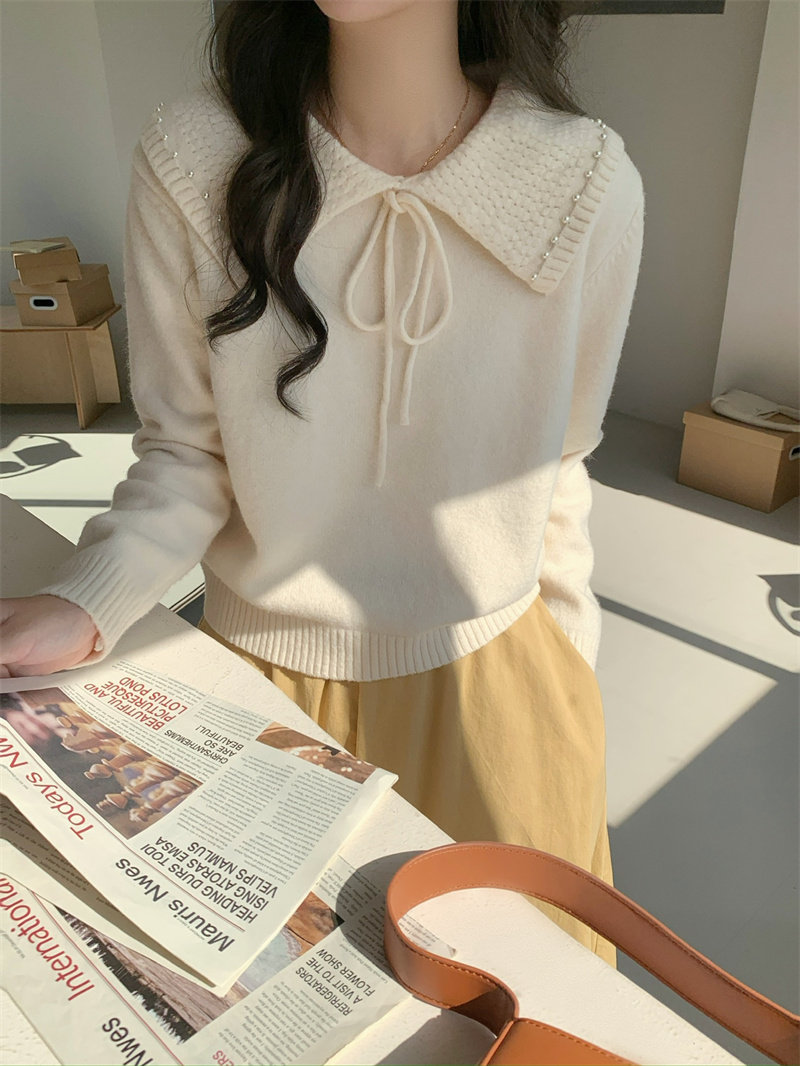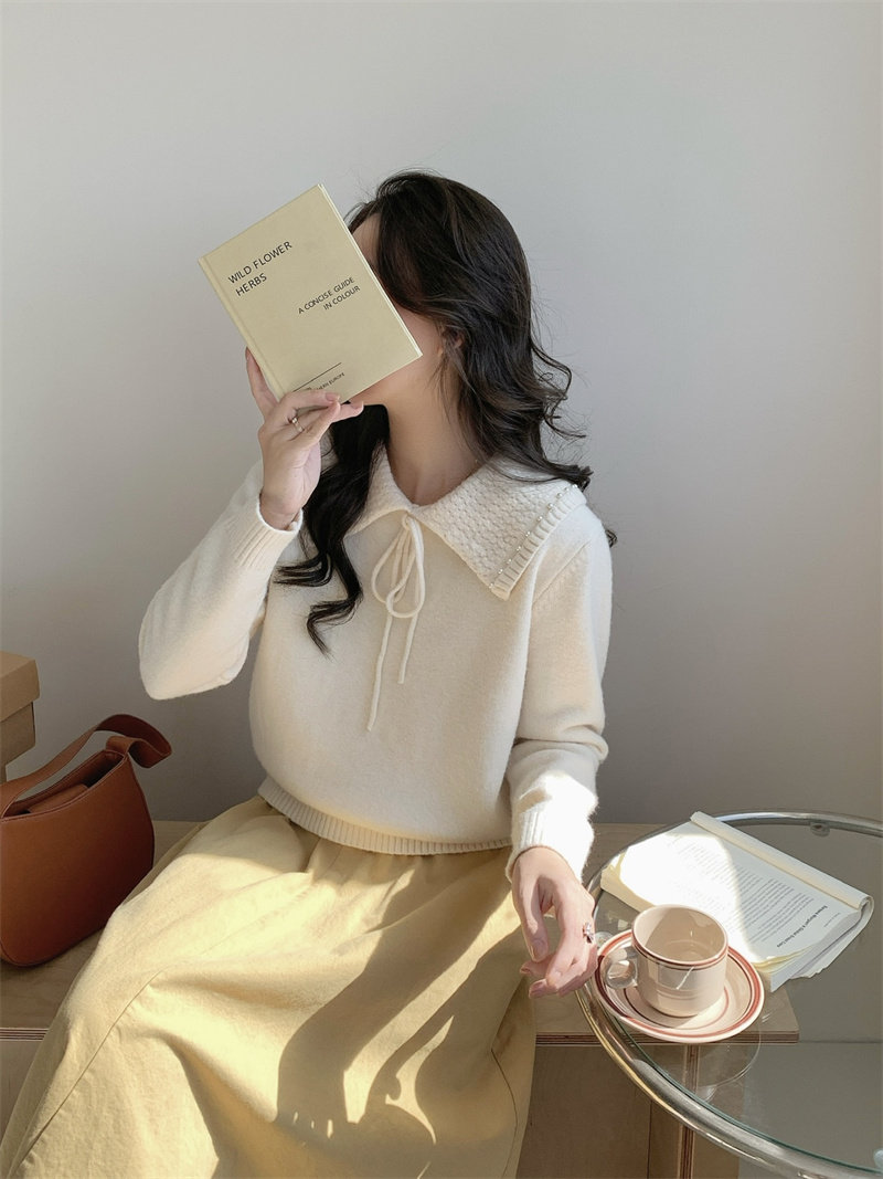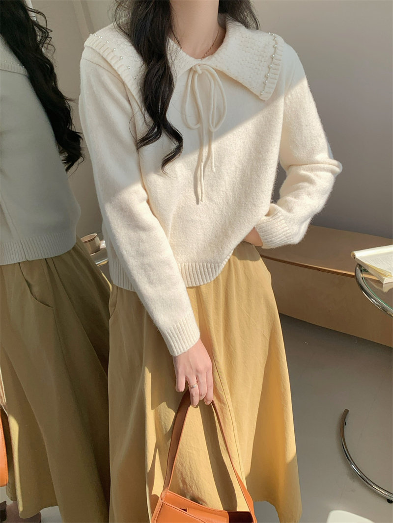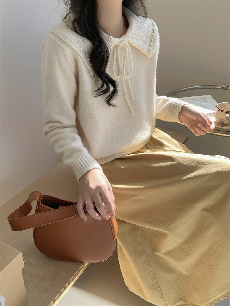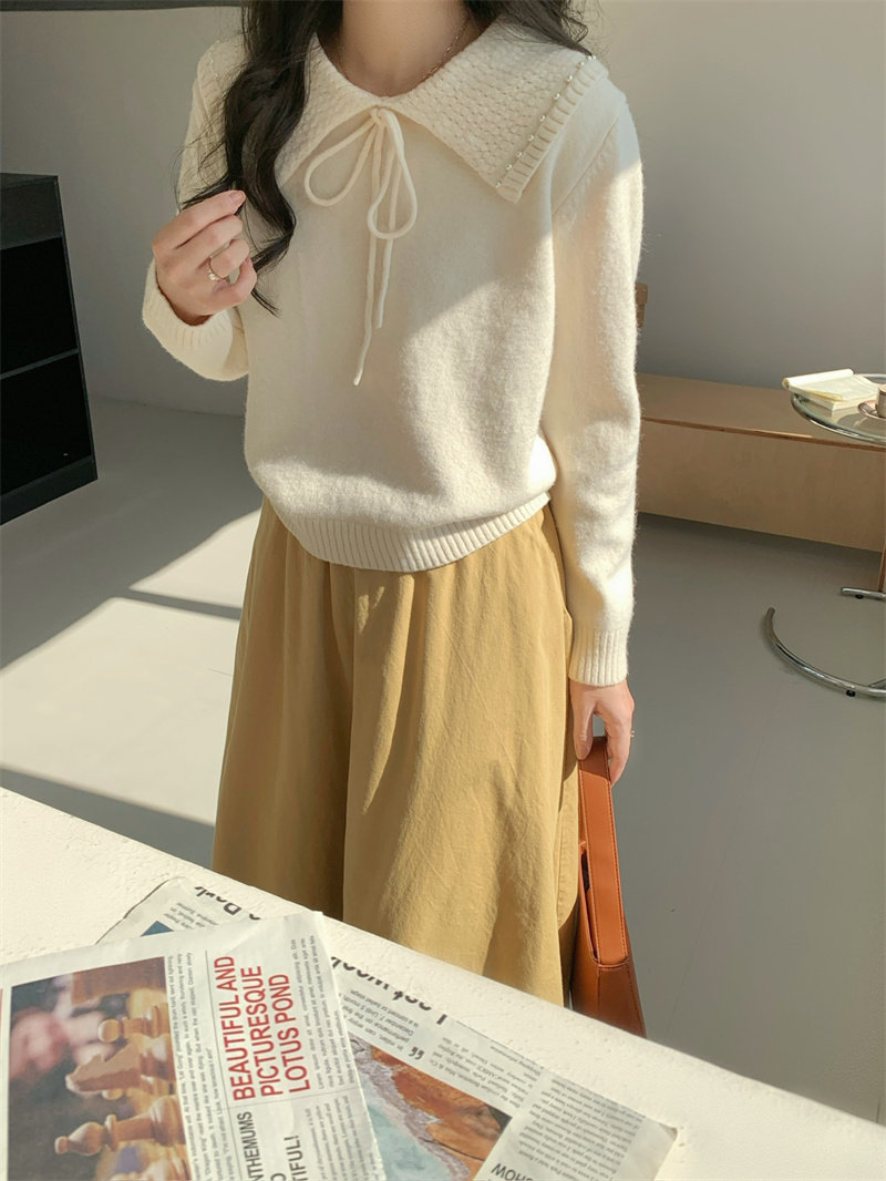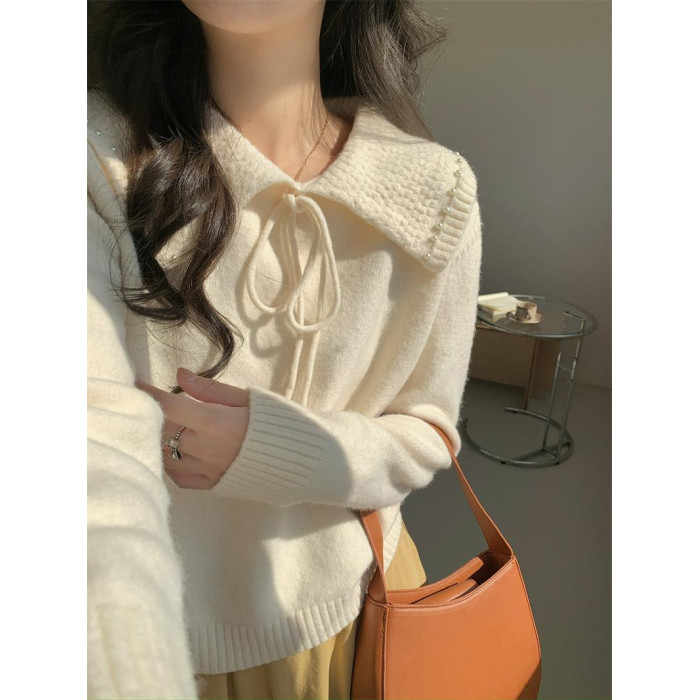 溫柔風奶系淺藍軟糯甜美套頭寬松設計感小衆翻領毛衣女系帶針織衫