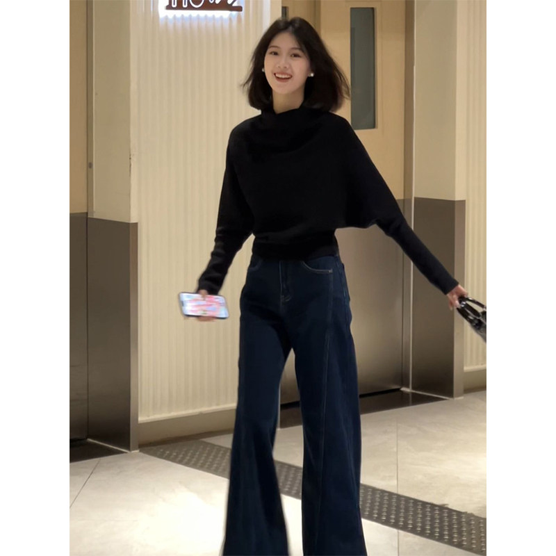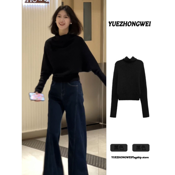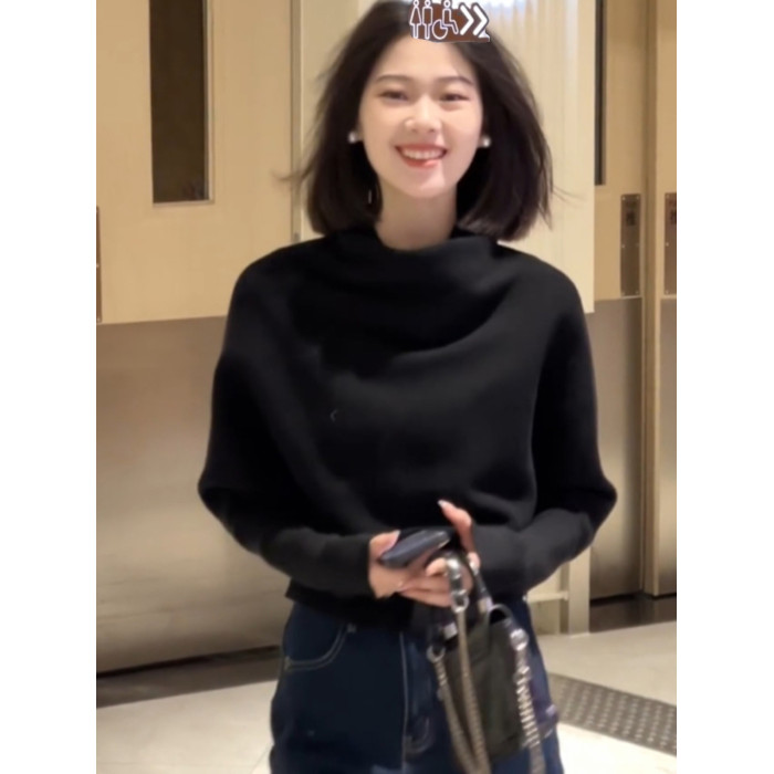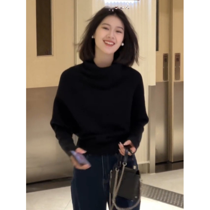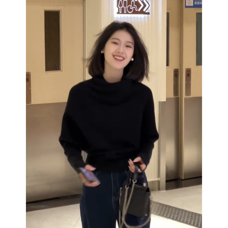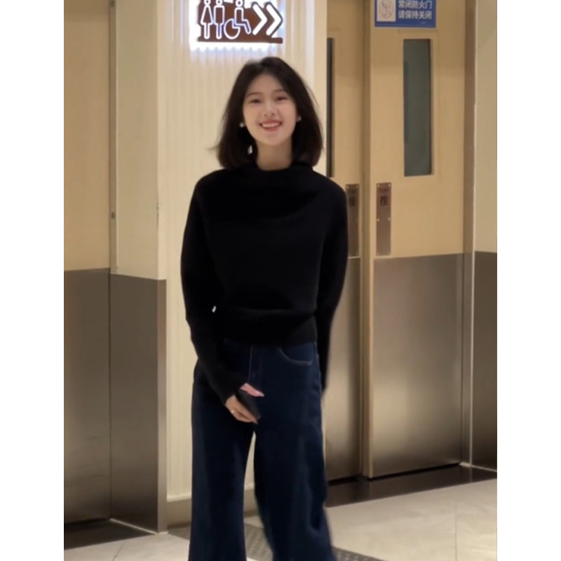 法式半高領黑色套頭堆堆領毛衣女秋冬季加厚慵懶風內搭針織衫上衣