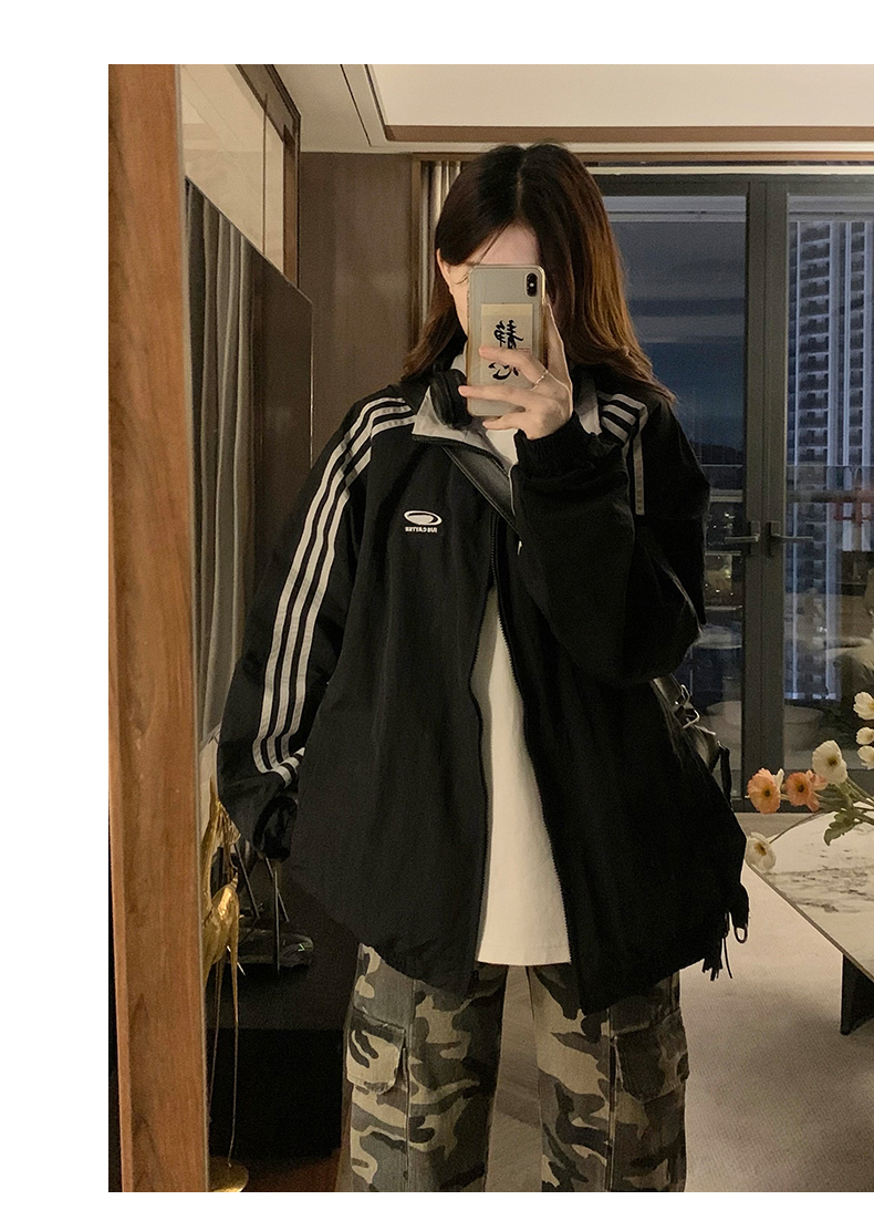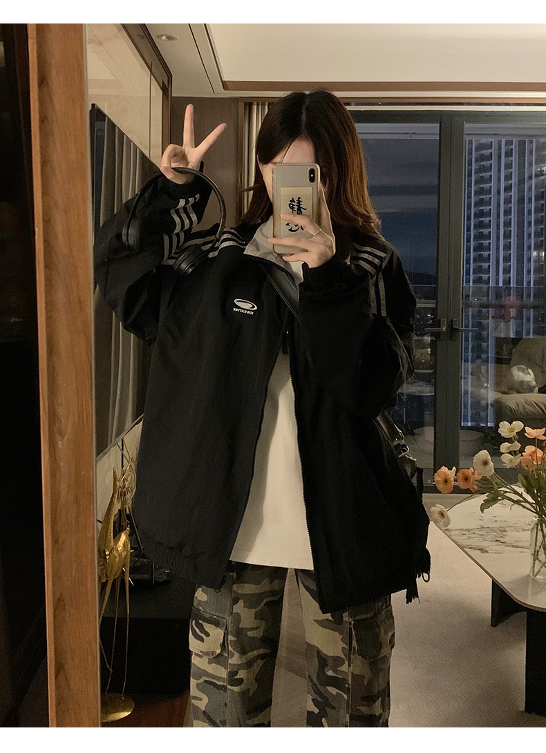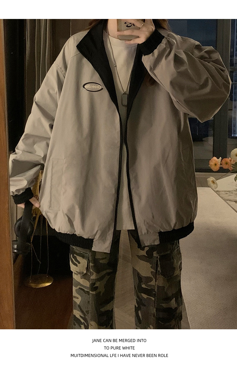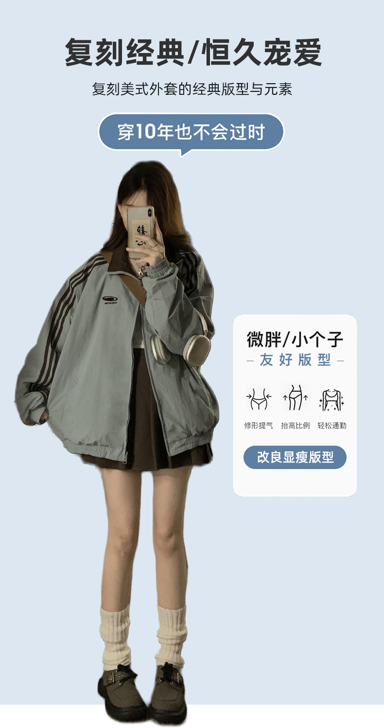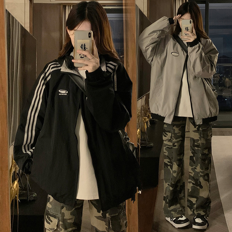 美式復古三條杠雙面穿外套男女春秋款ins潮牌寬松情侶夾克棒球服