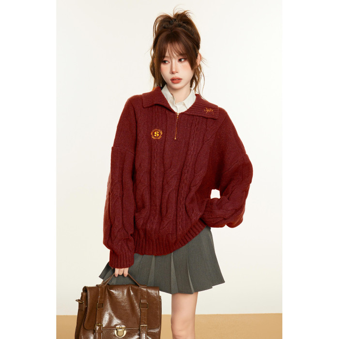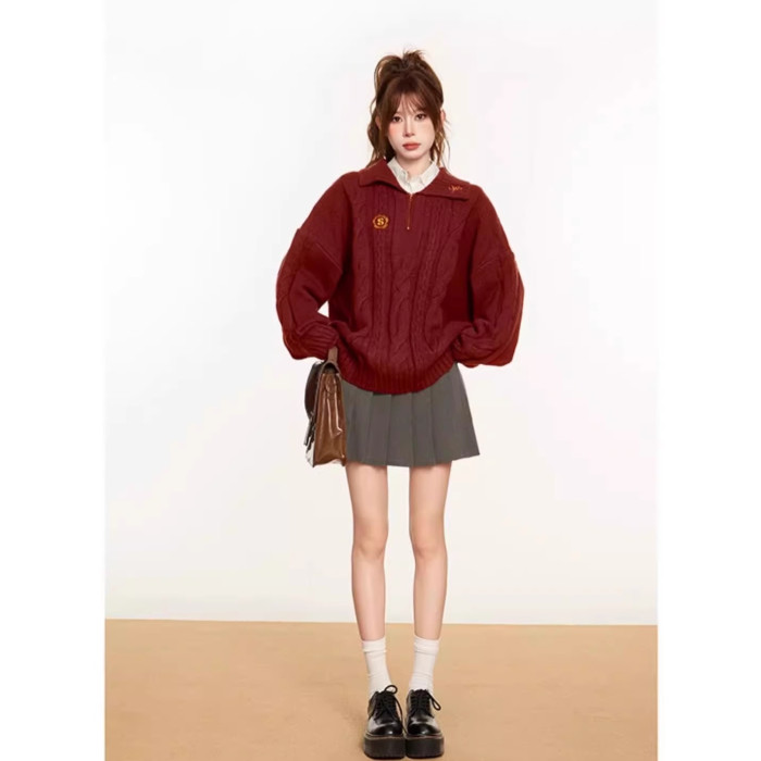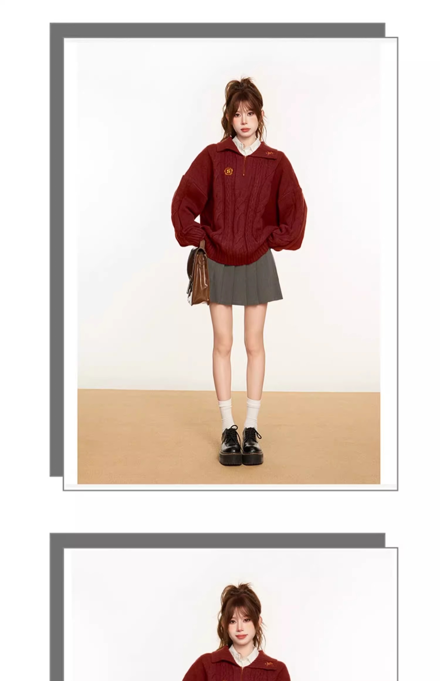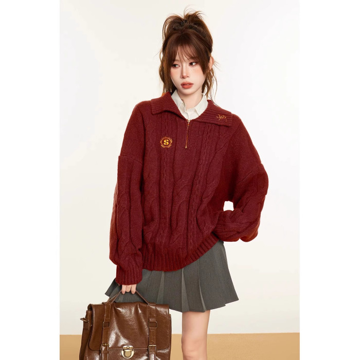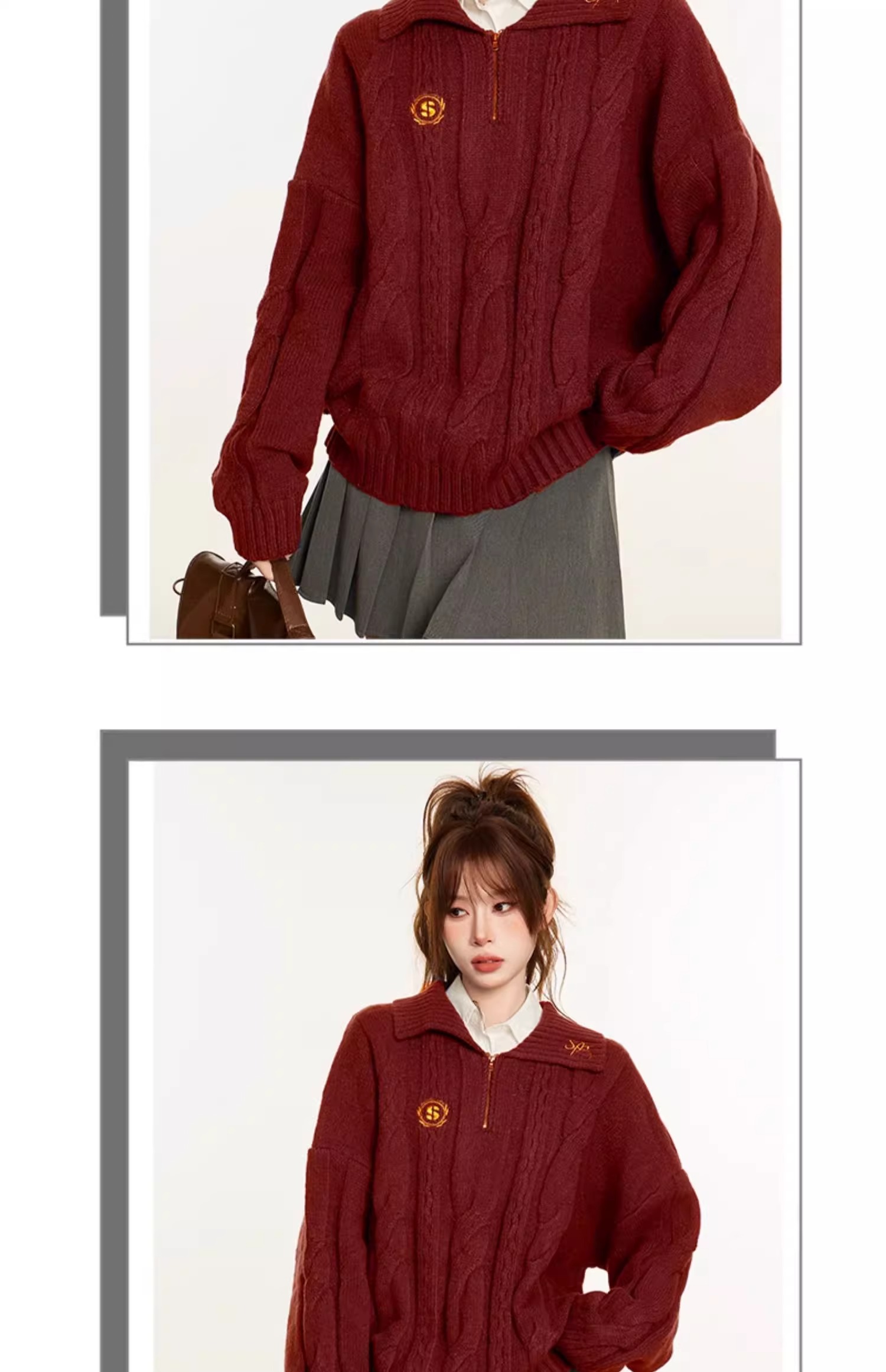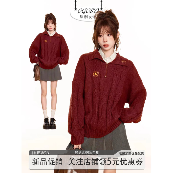 新年紅色半拉鍊麻花套頭毛衣女秋冬季高級感慵懶風加厚翻領針織衫