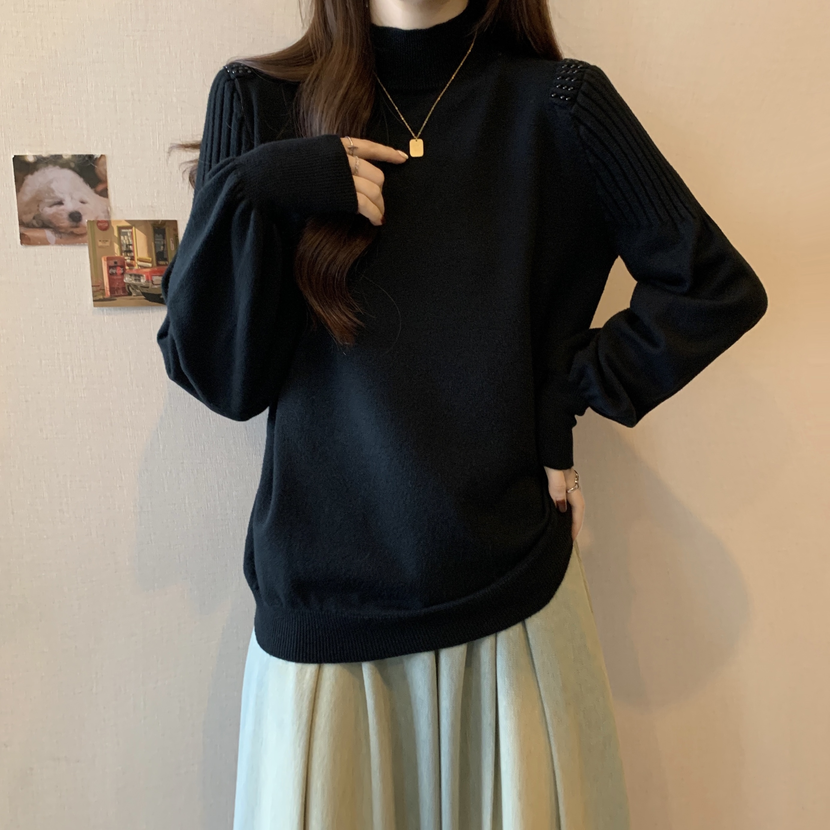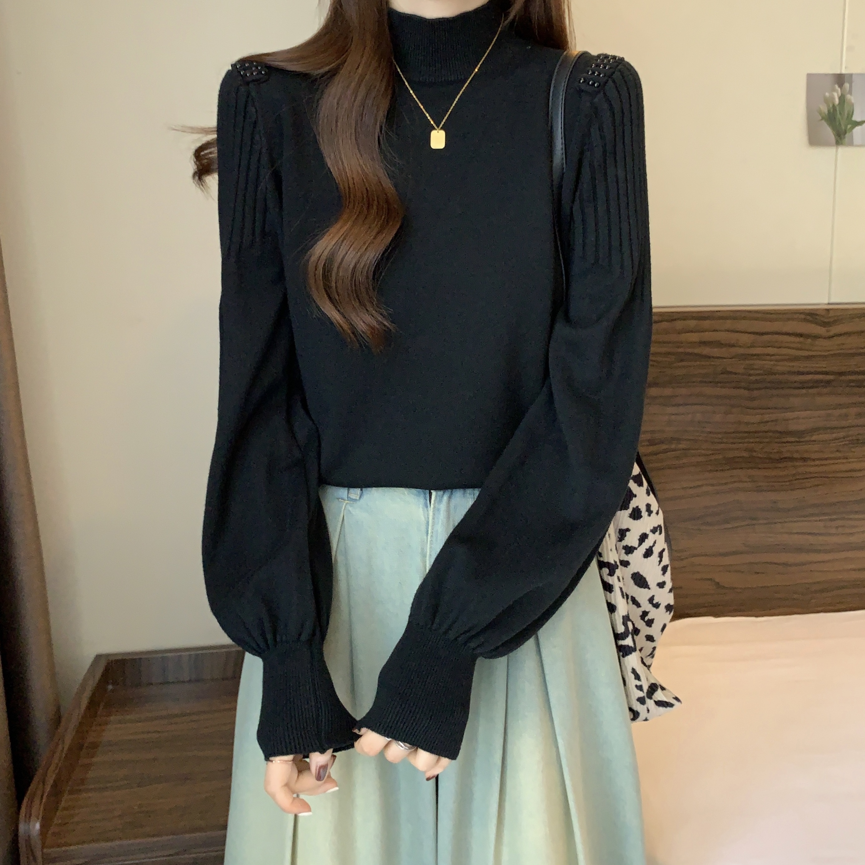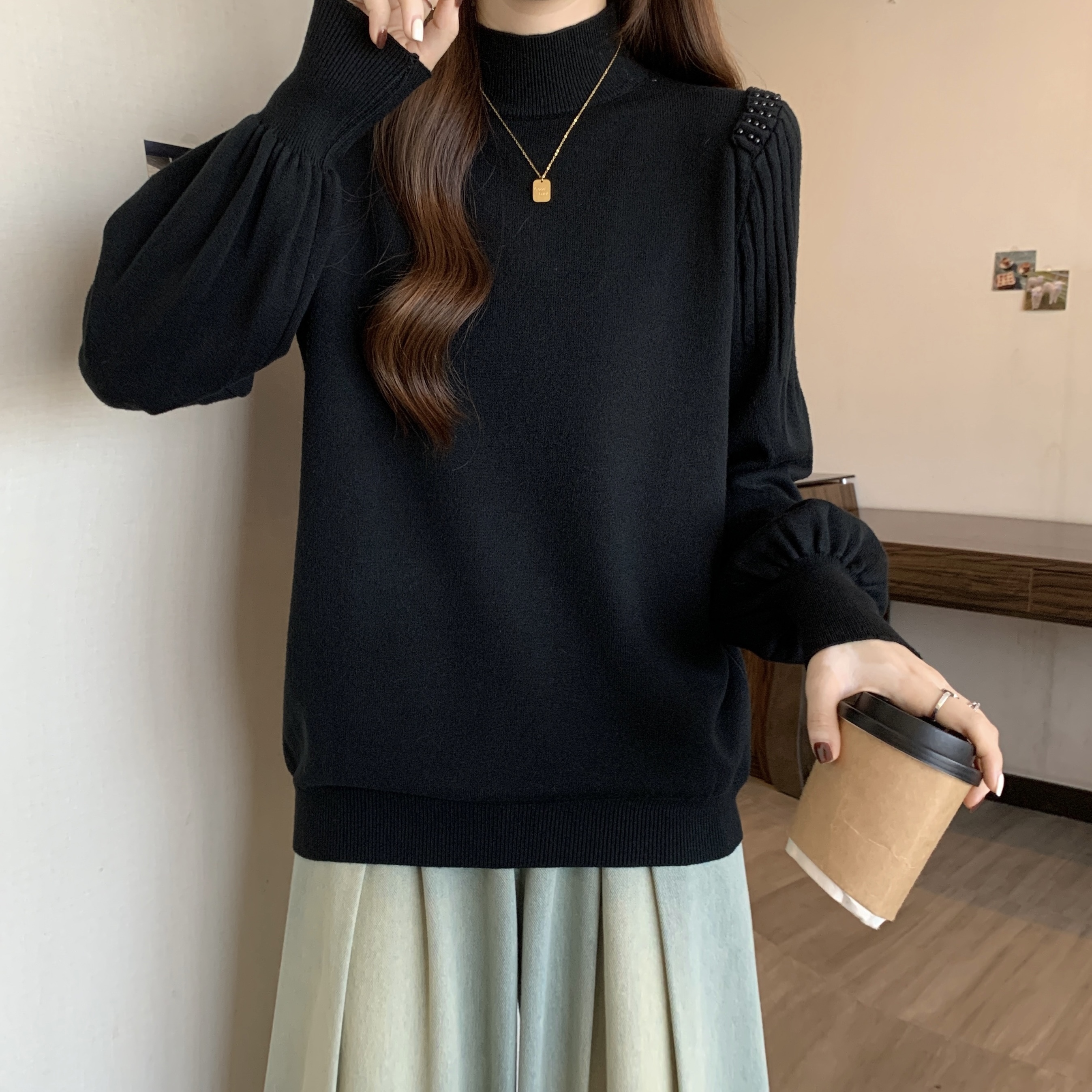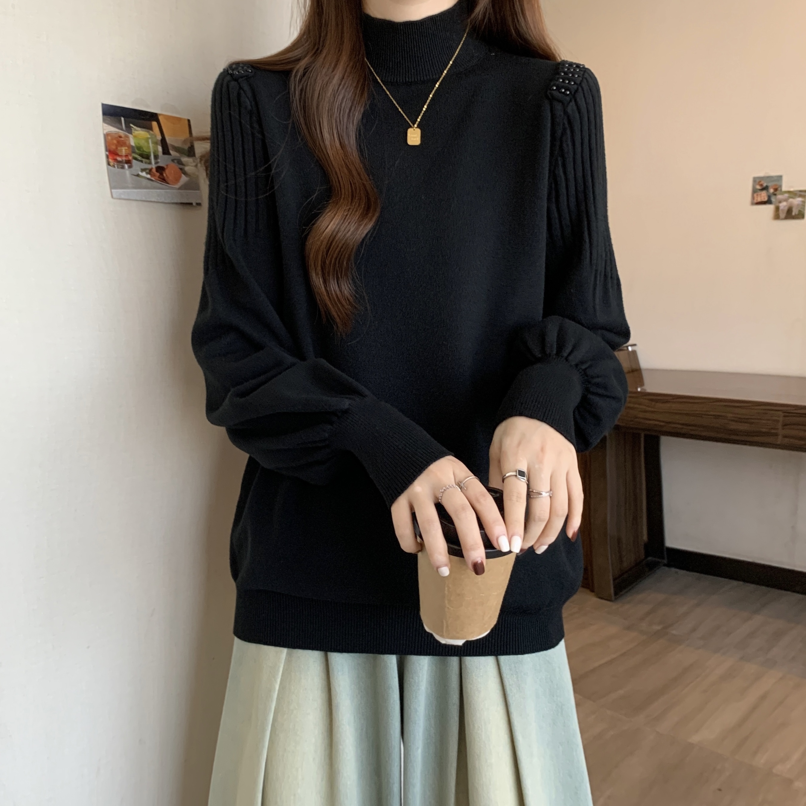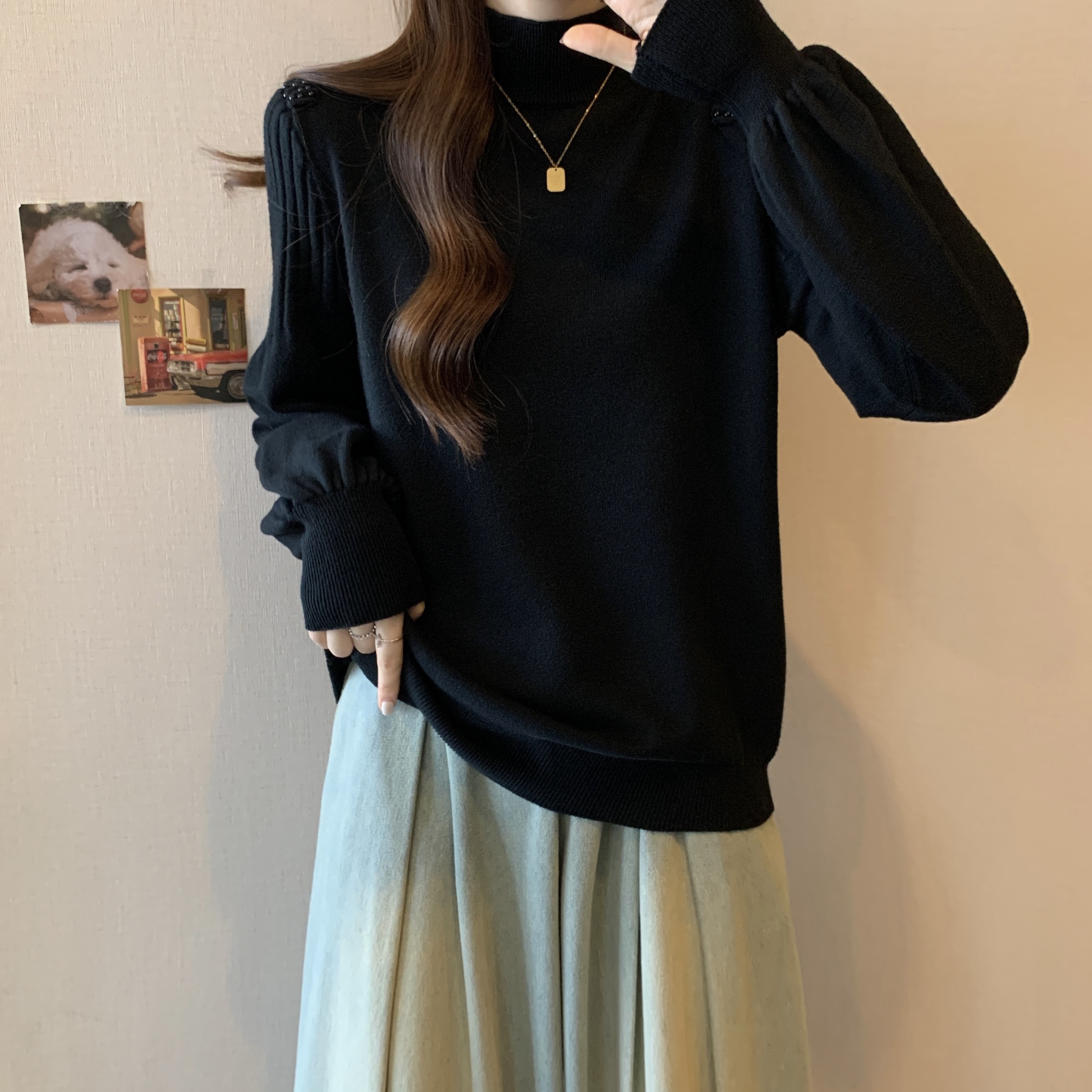 高級感黑色毛衣女秋冬半高領針織打底衫內搭慵懶風寬松燈籠袖上衣