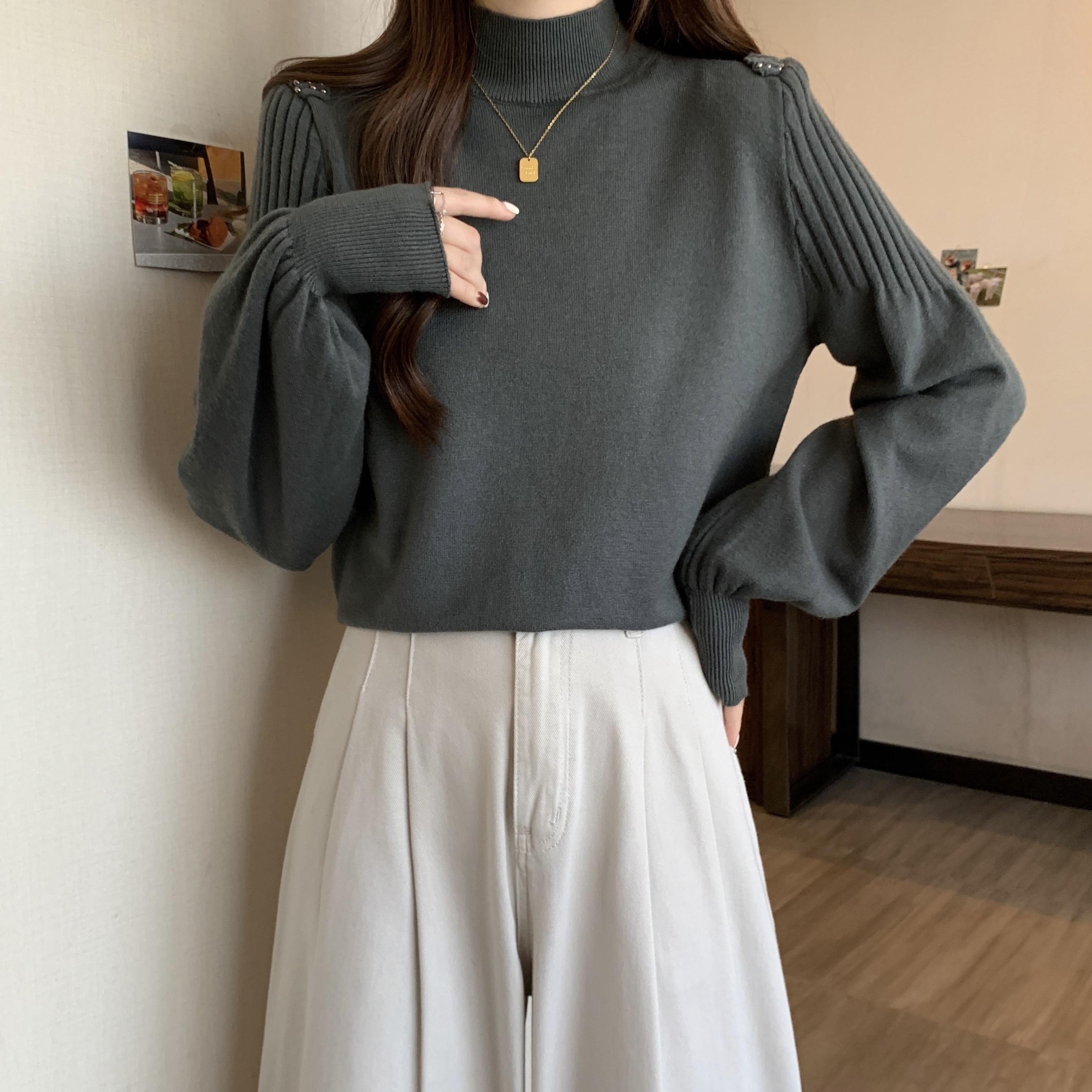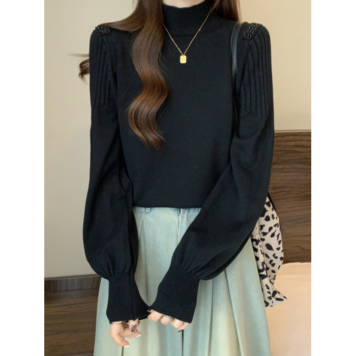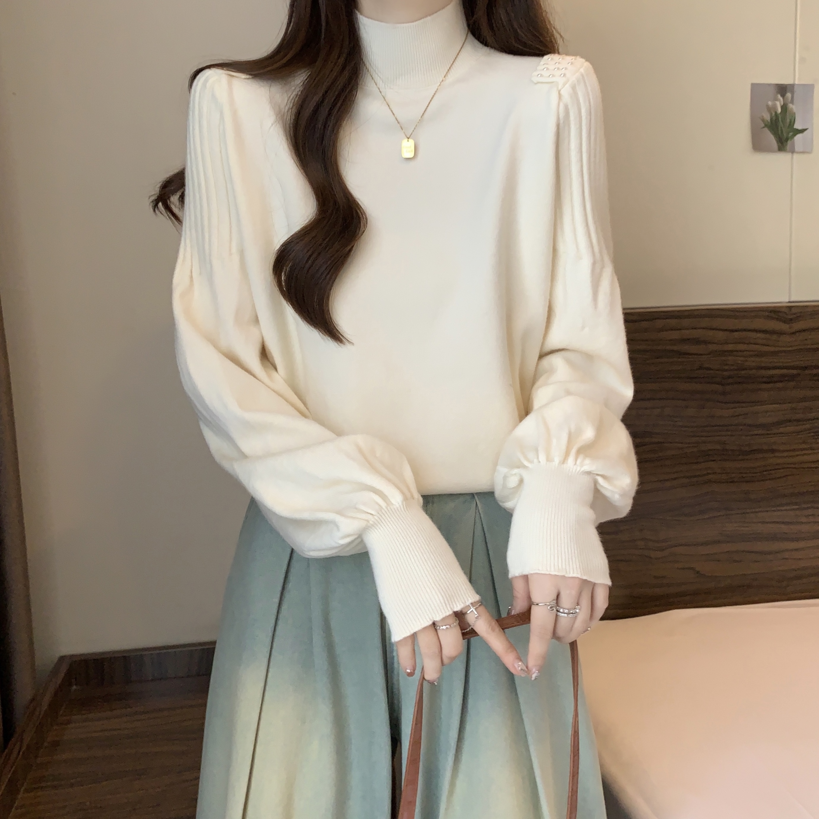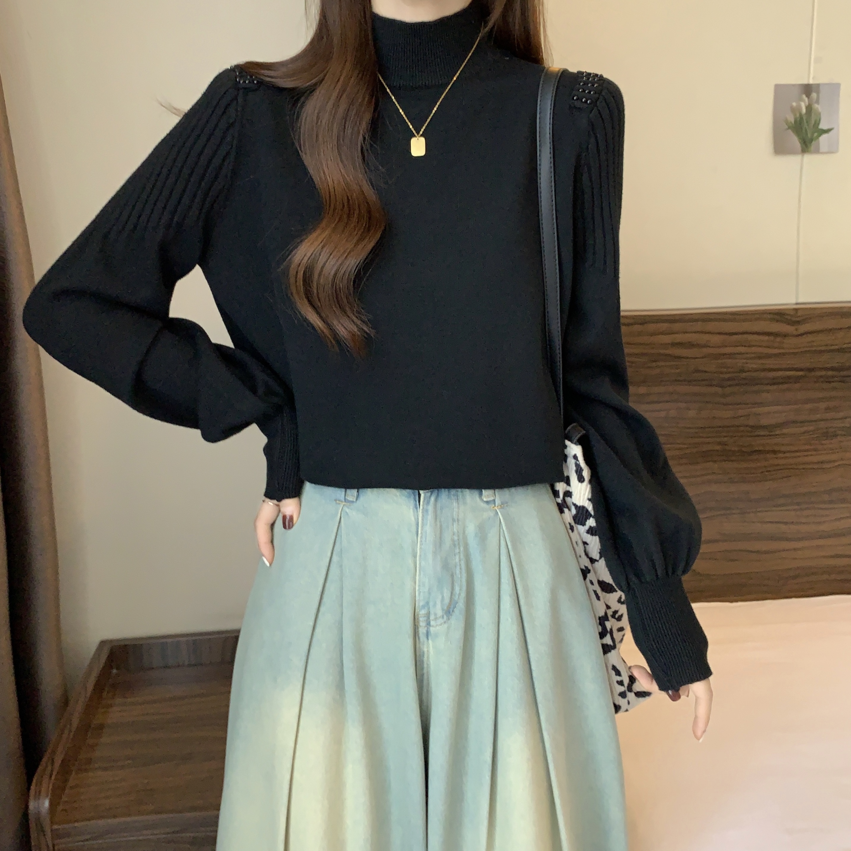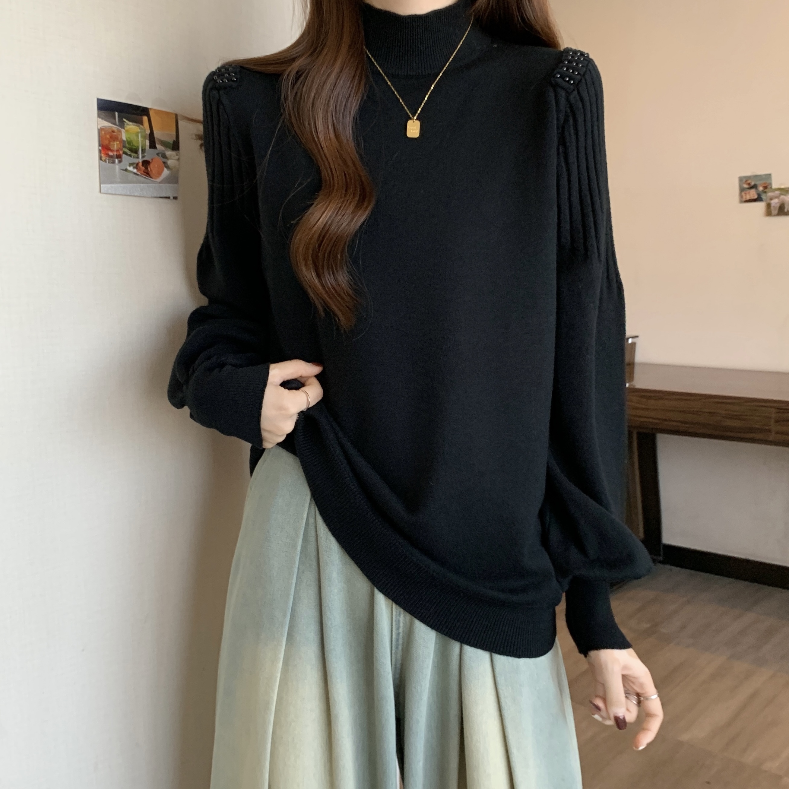 高級感黑色毛衣女秋冬半高領針織打底衫內搭慵懶風寬松燈籠袖上衣