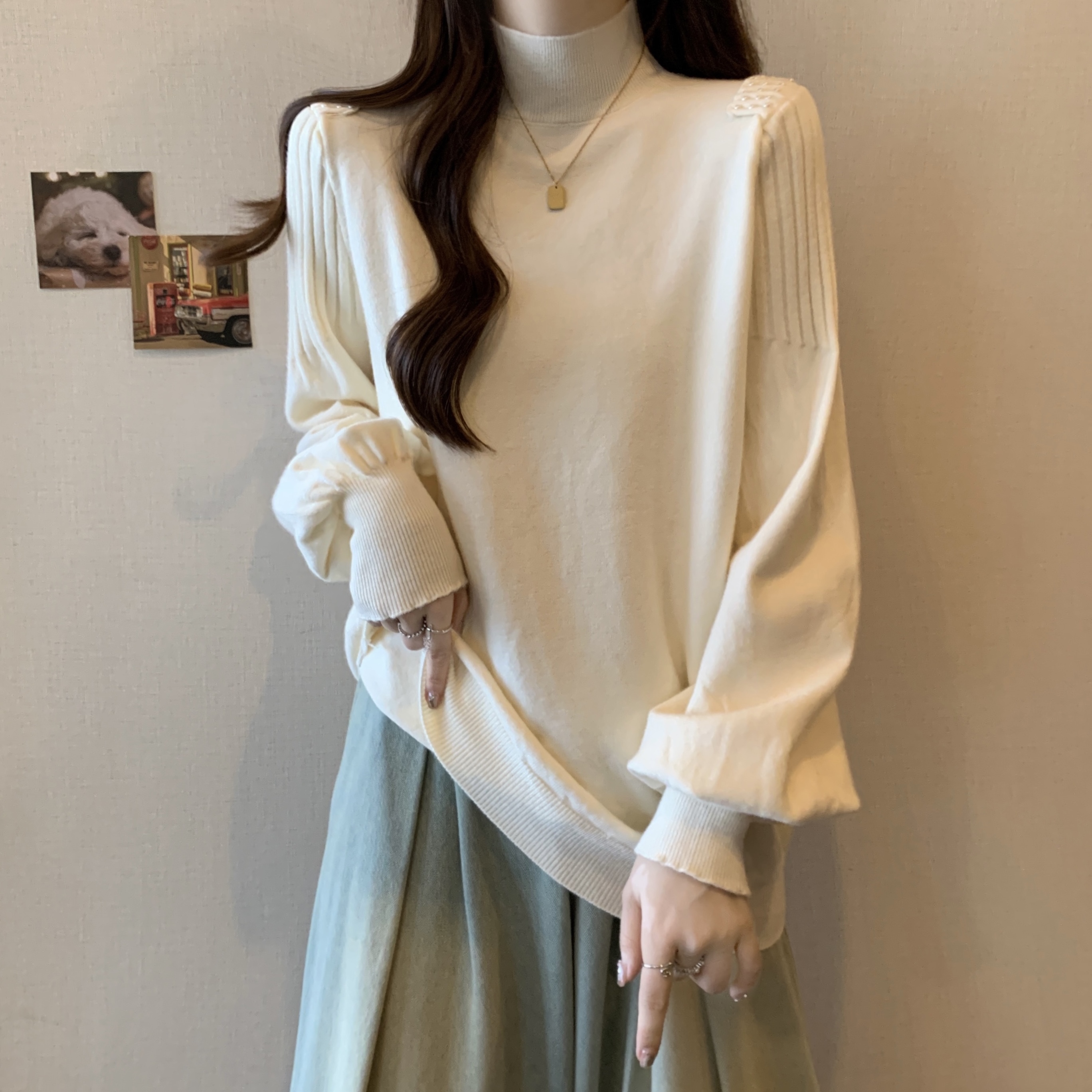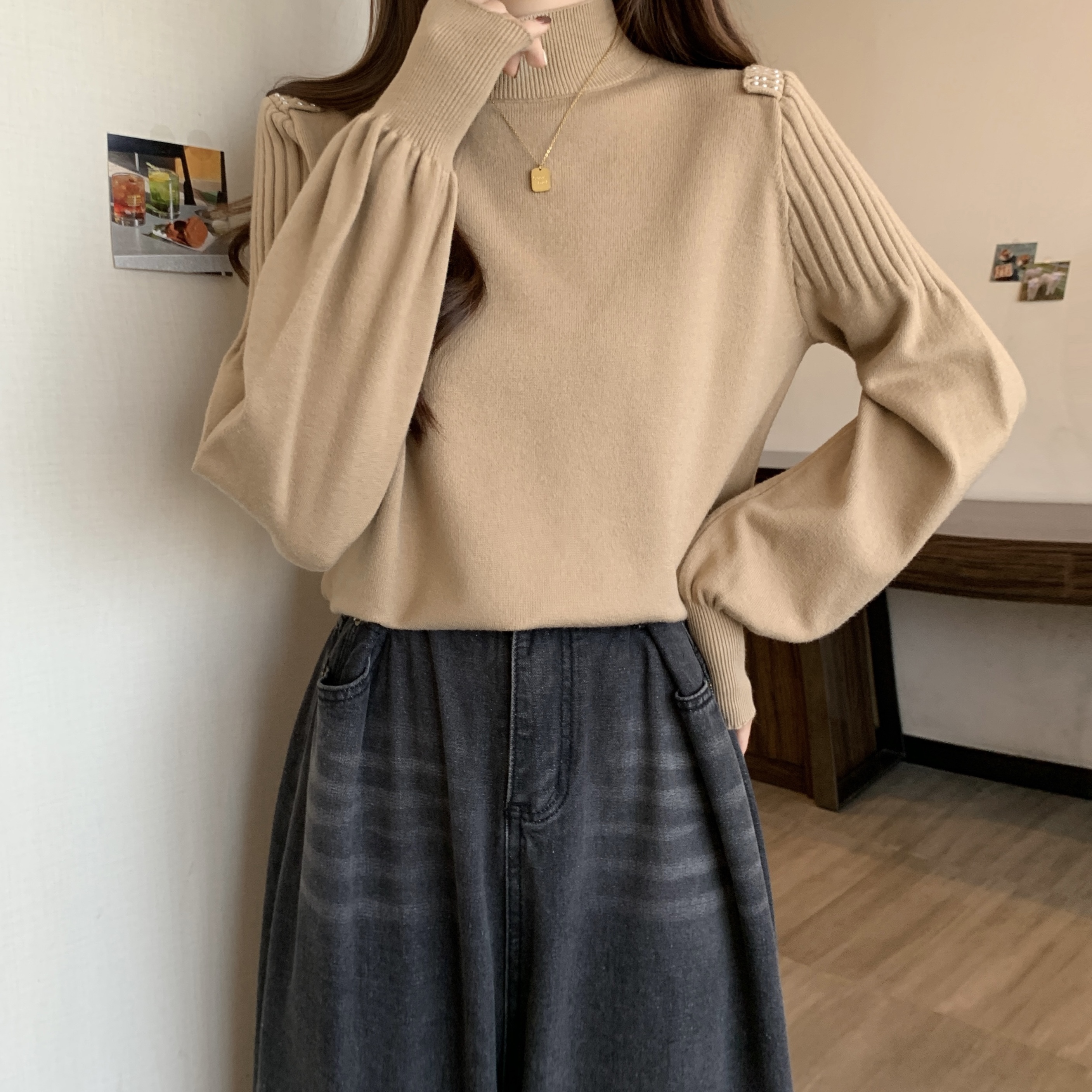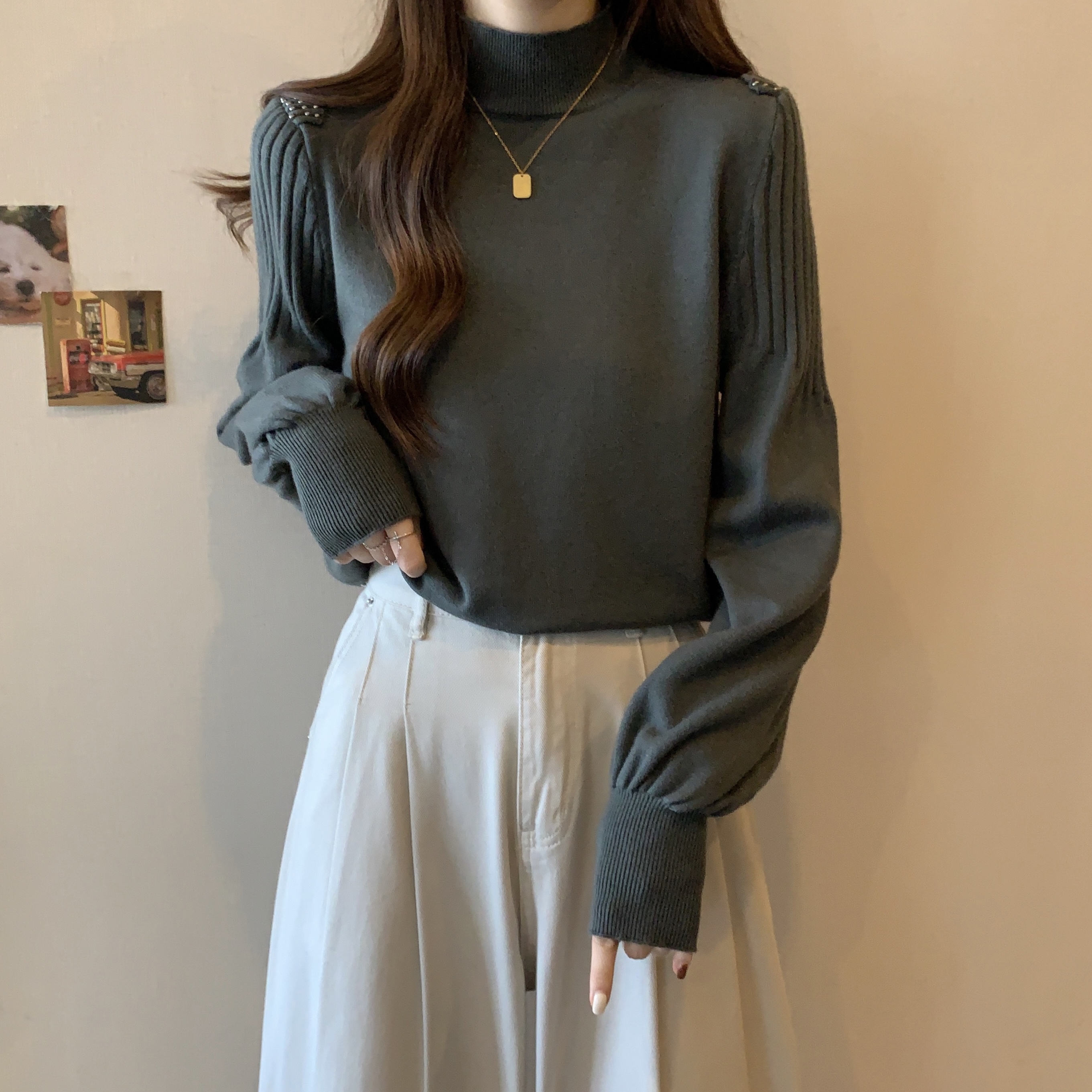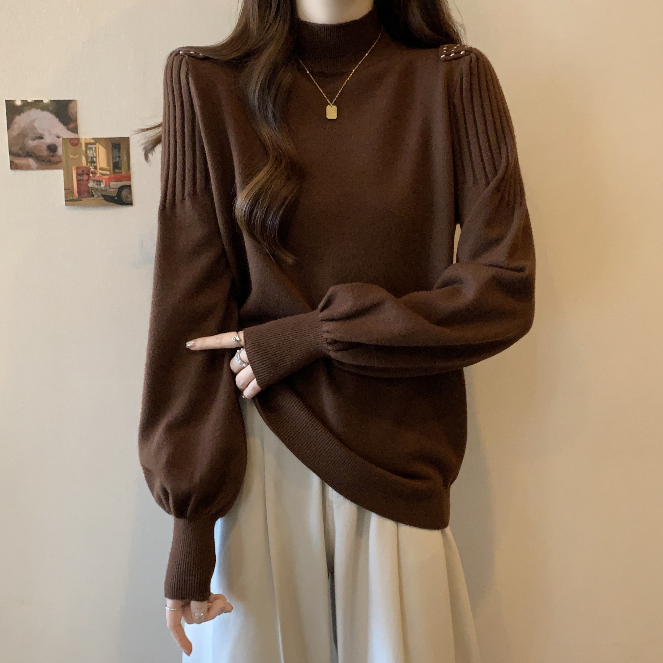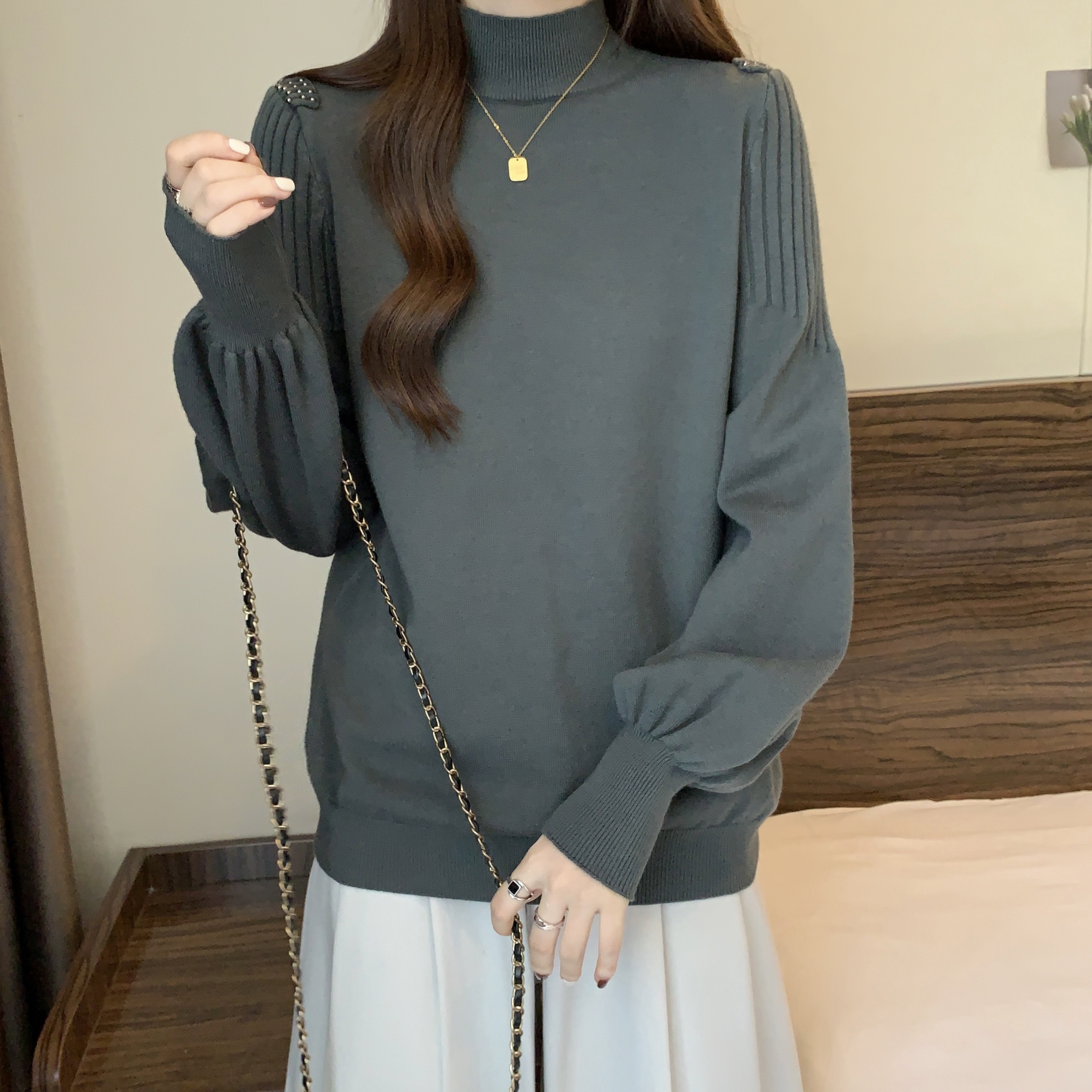 高級感黑色毛衣女秋冬半高領針織打底衫內搭慵懶風寬松燈籠袖上衣
