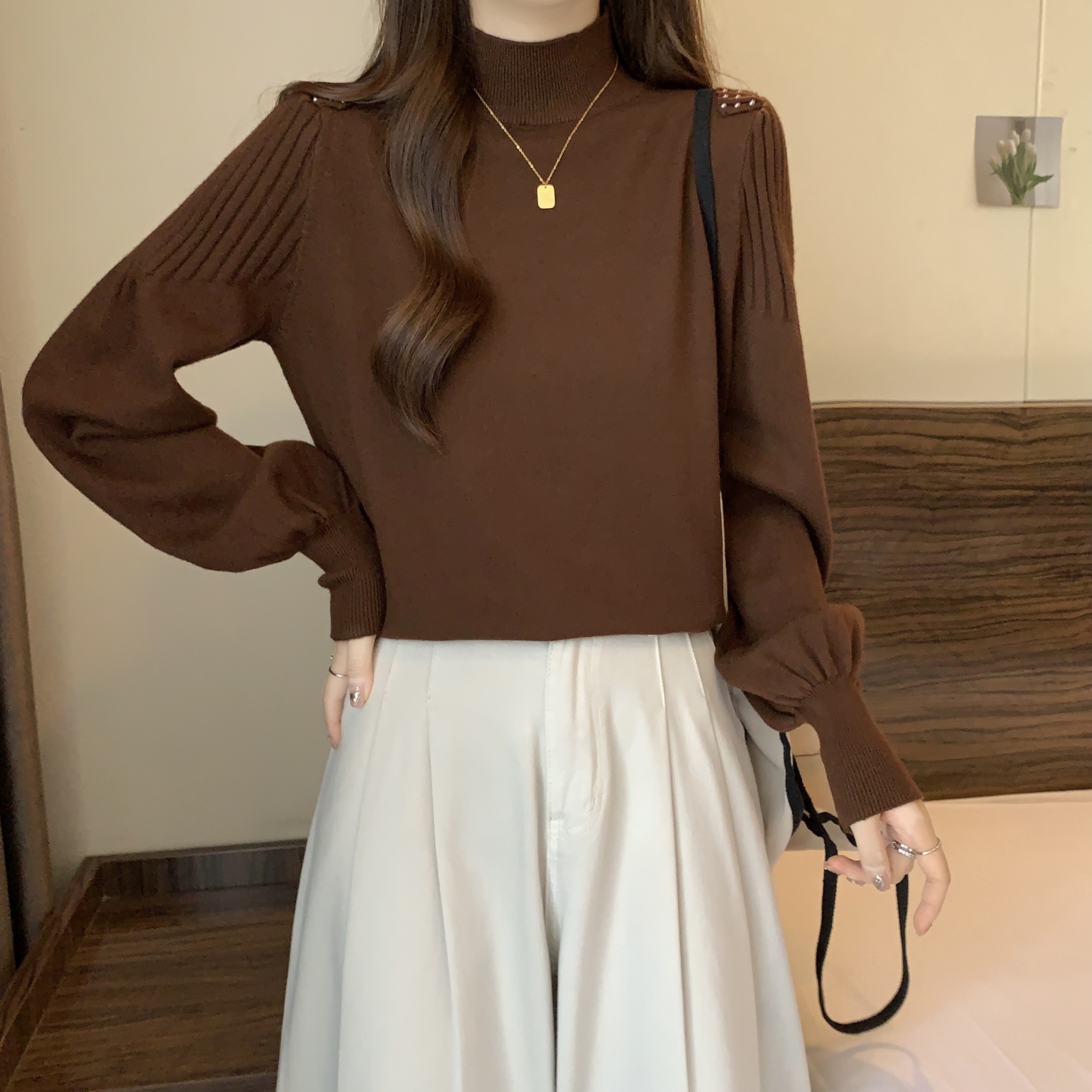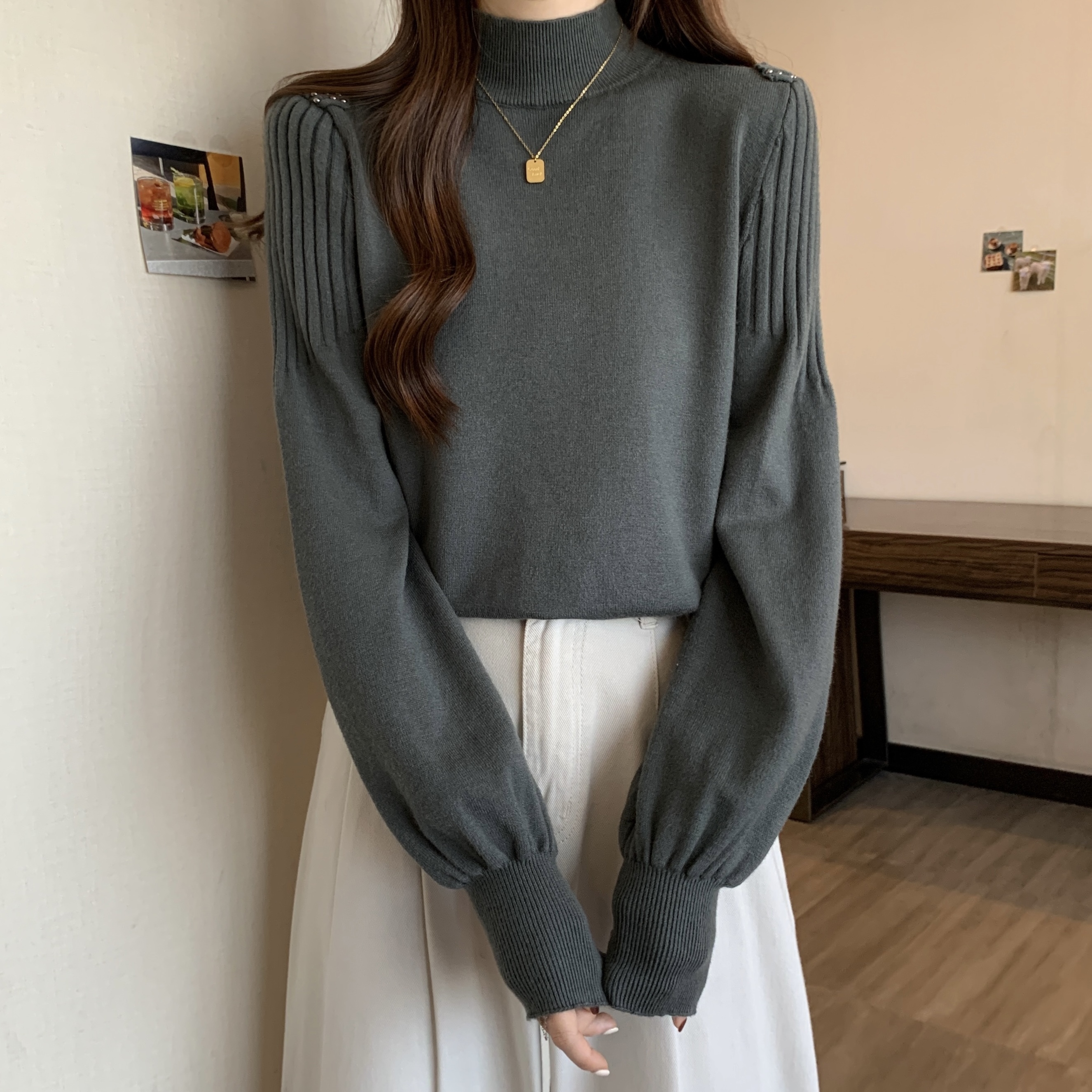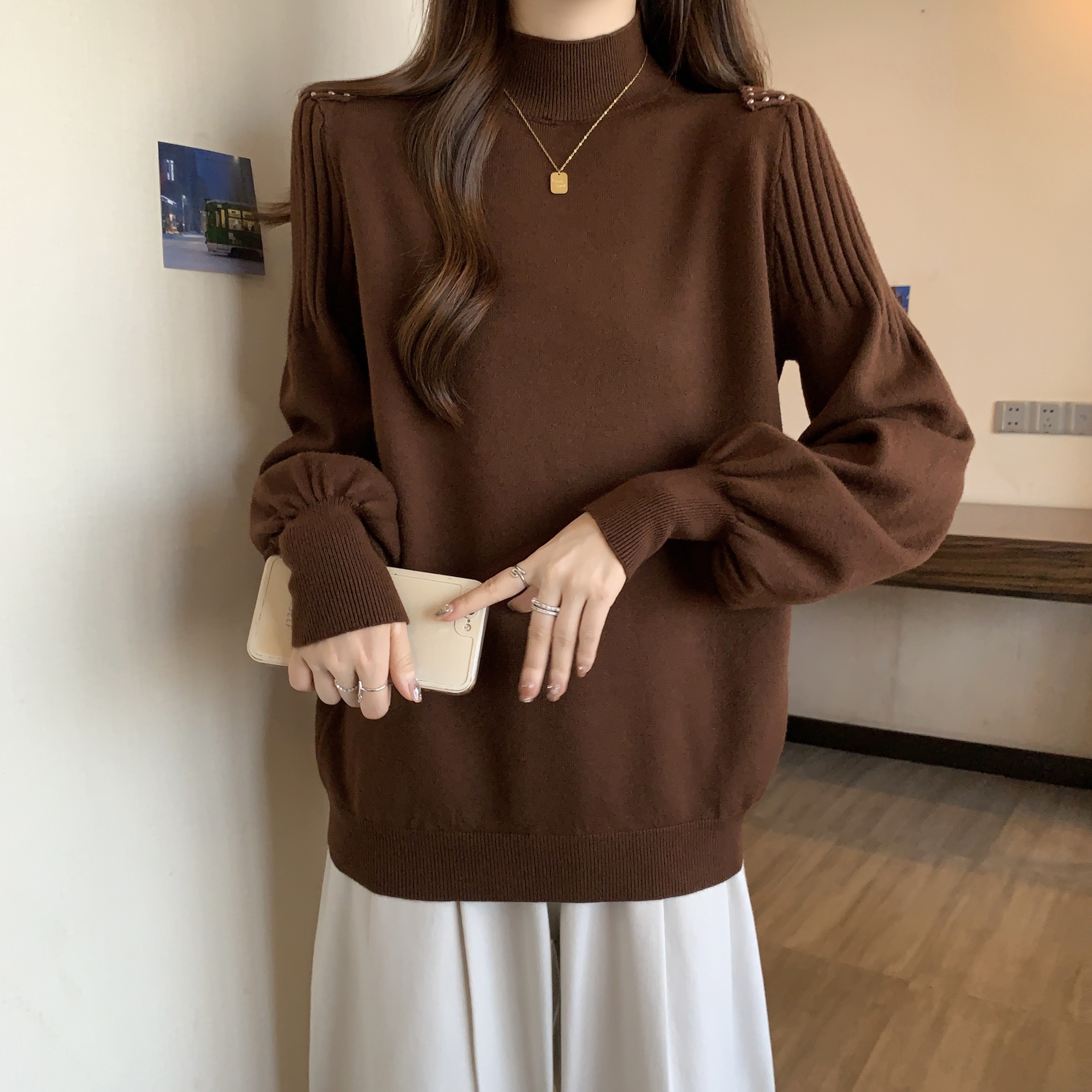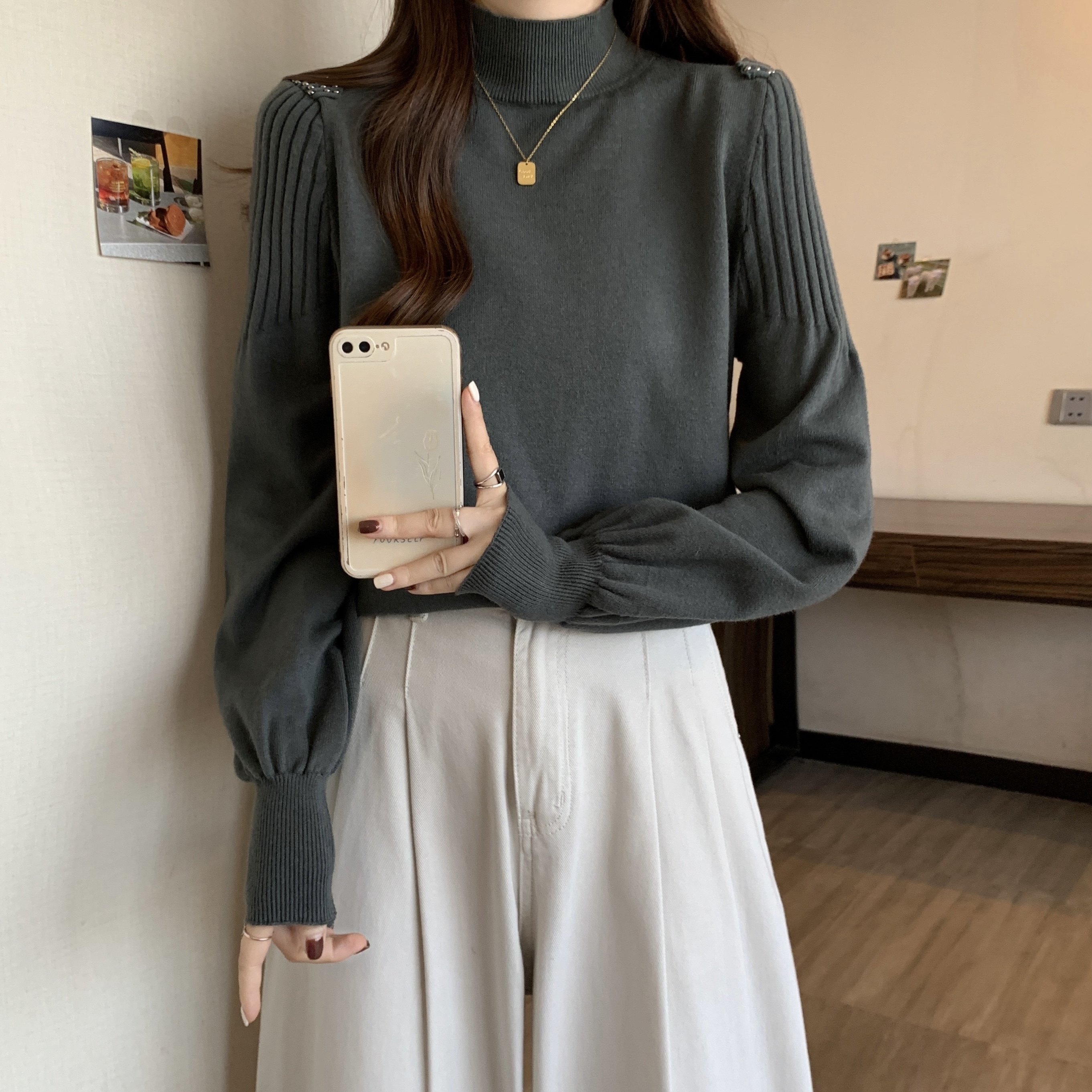 高級感黑色毛衣女秋冬半高領針織打底衫內搭慵懶風寬松燈籠袖上衣