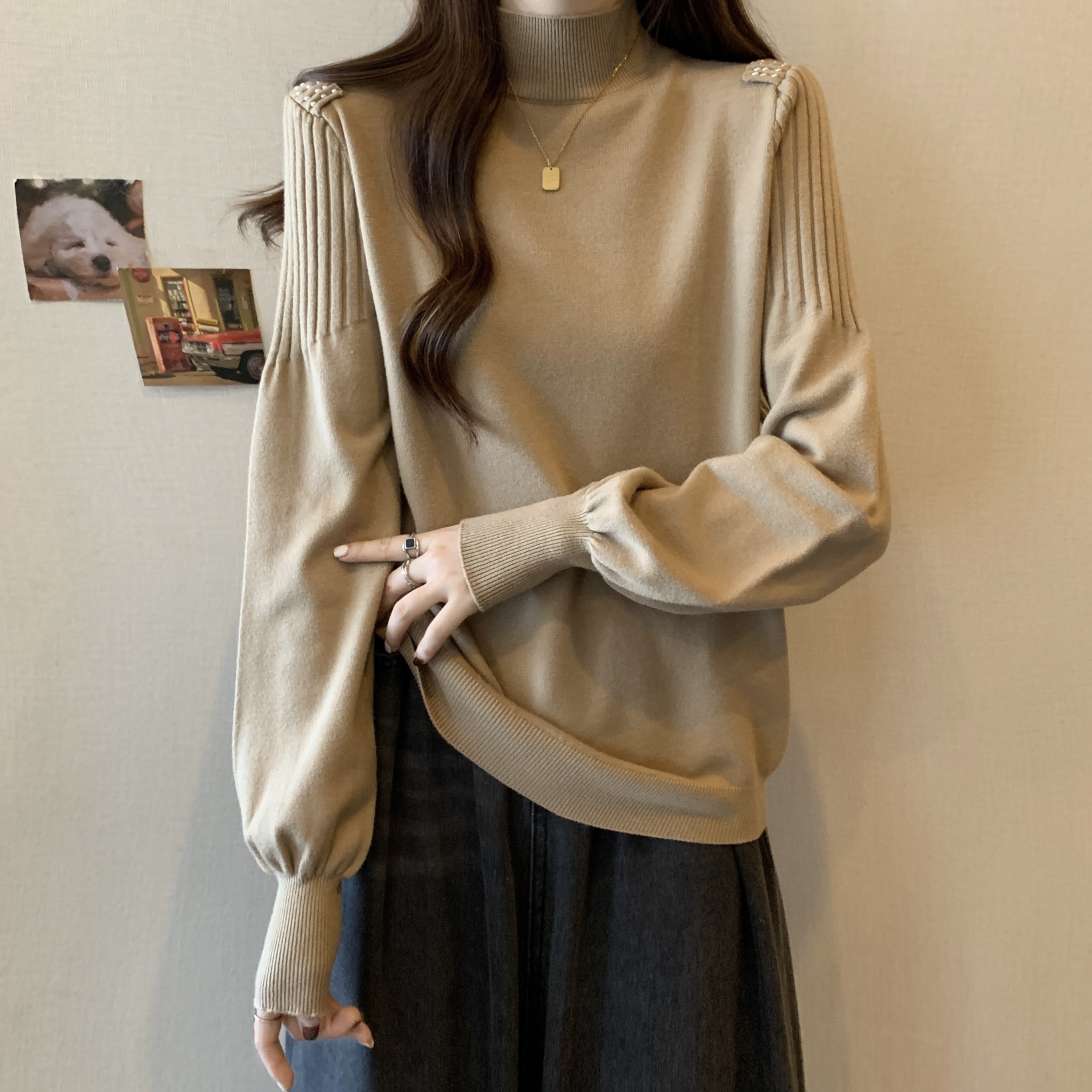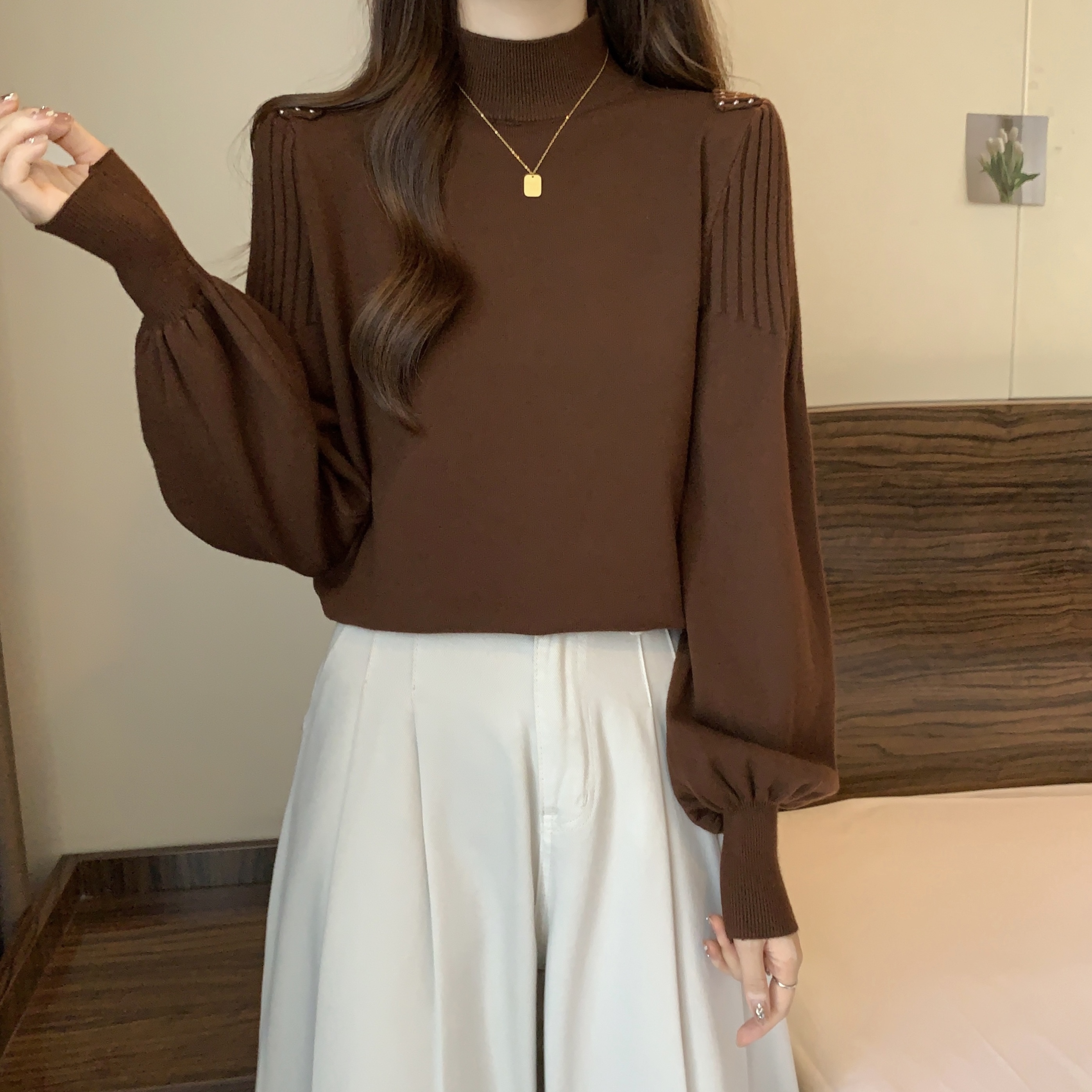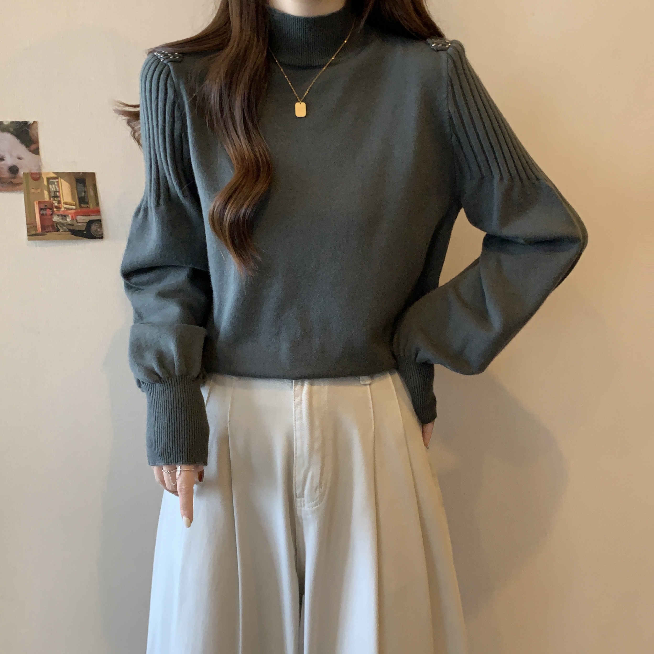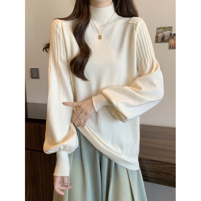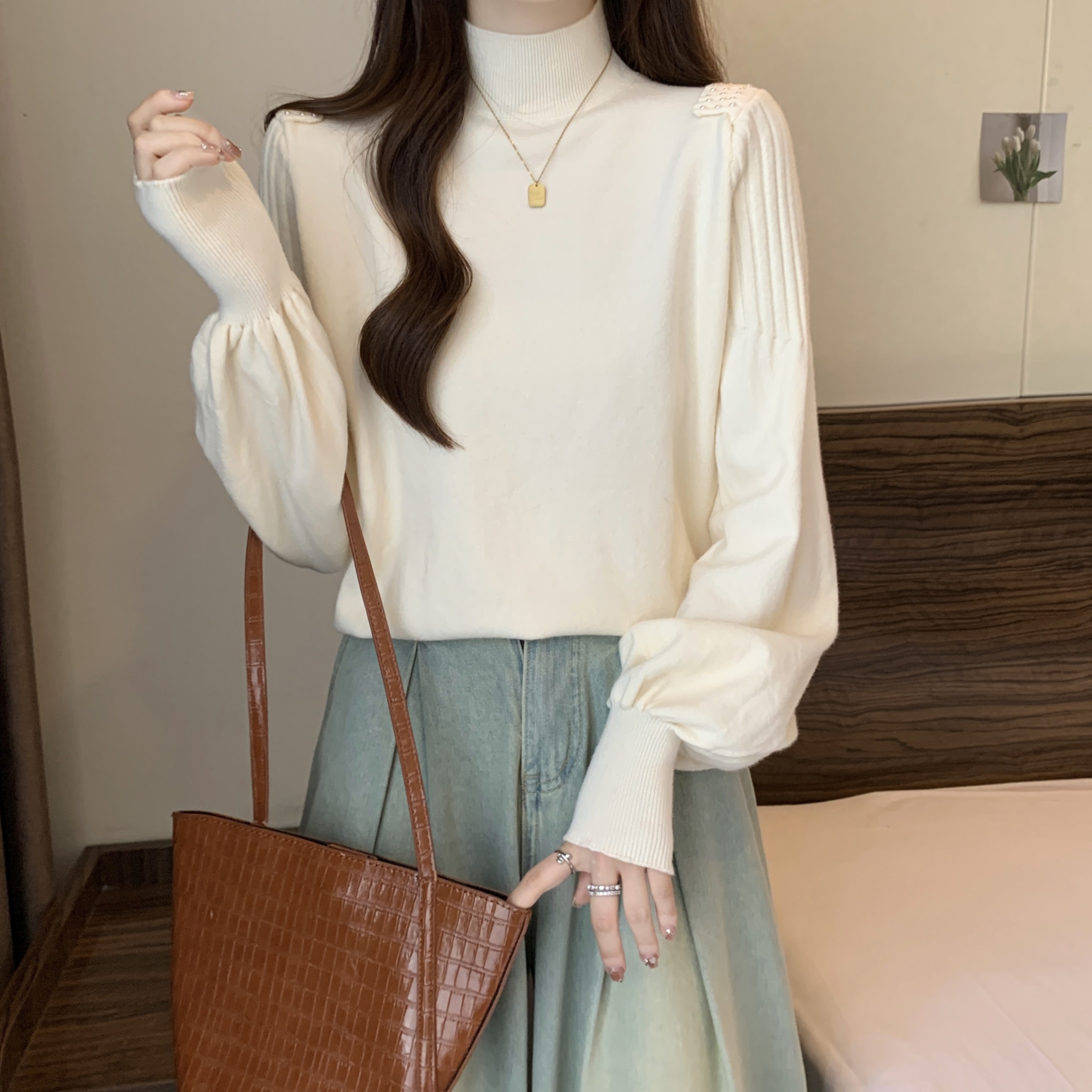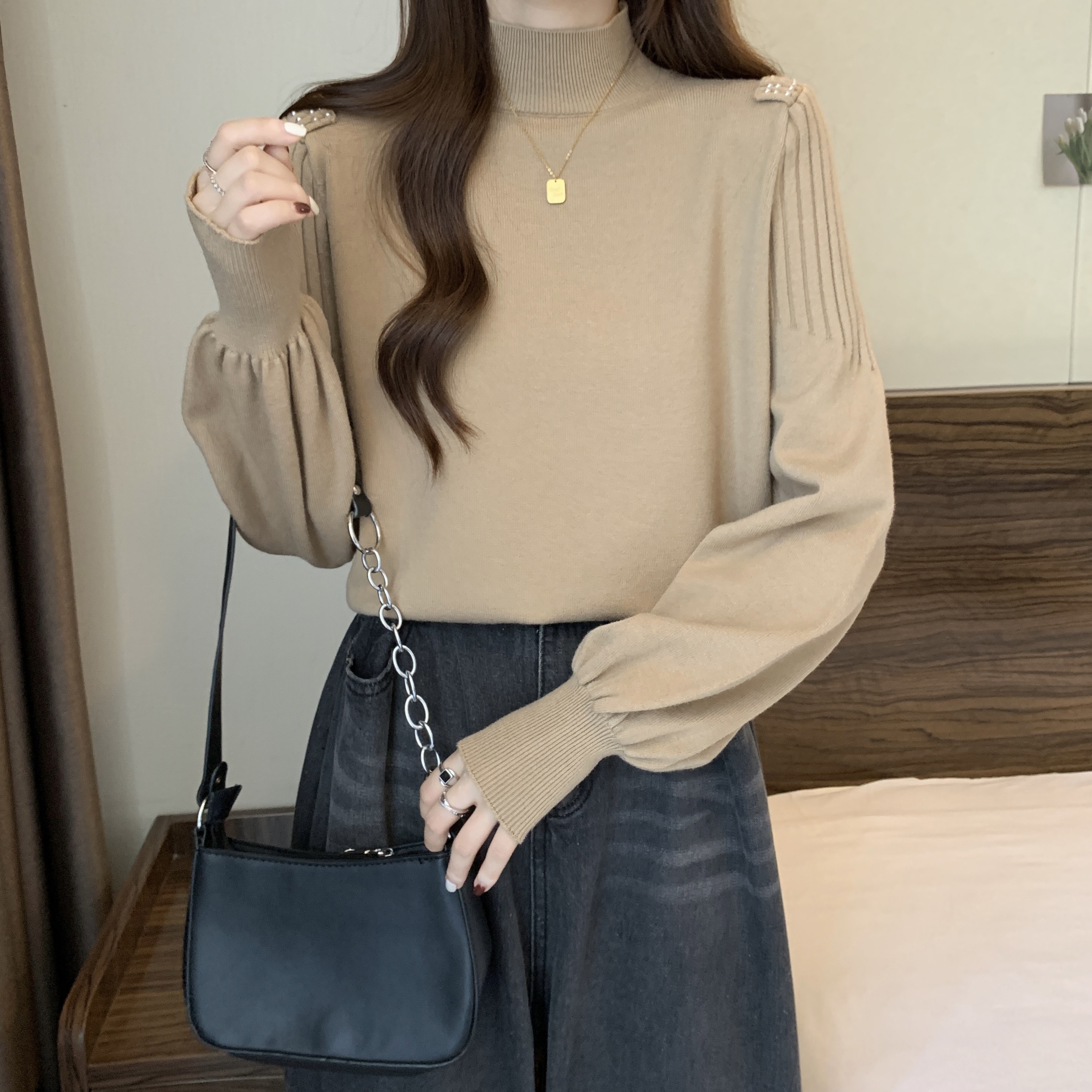 高級感黑色毛衣女秋冬半高領針織打底衫內搭慵懶風寬松燈籠袖上衣