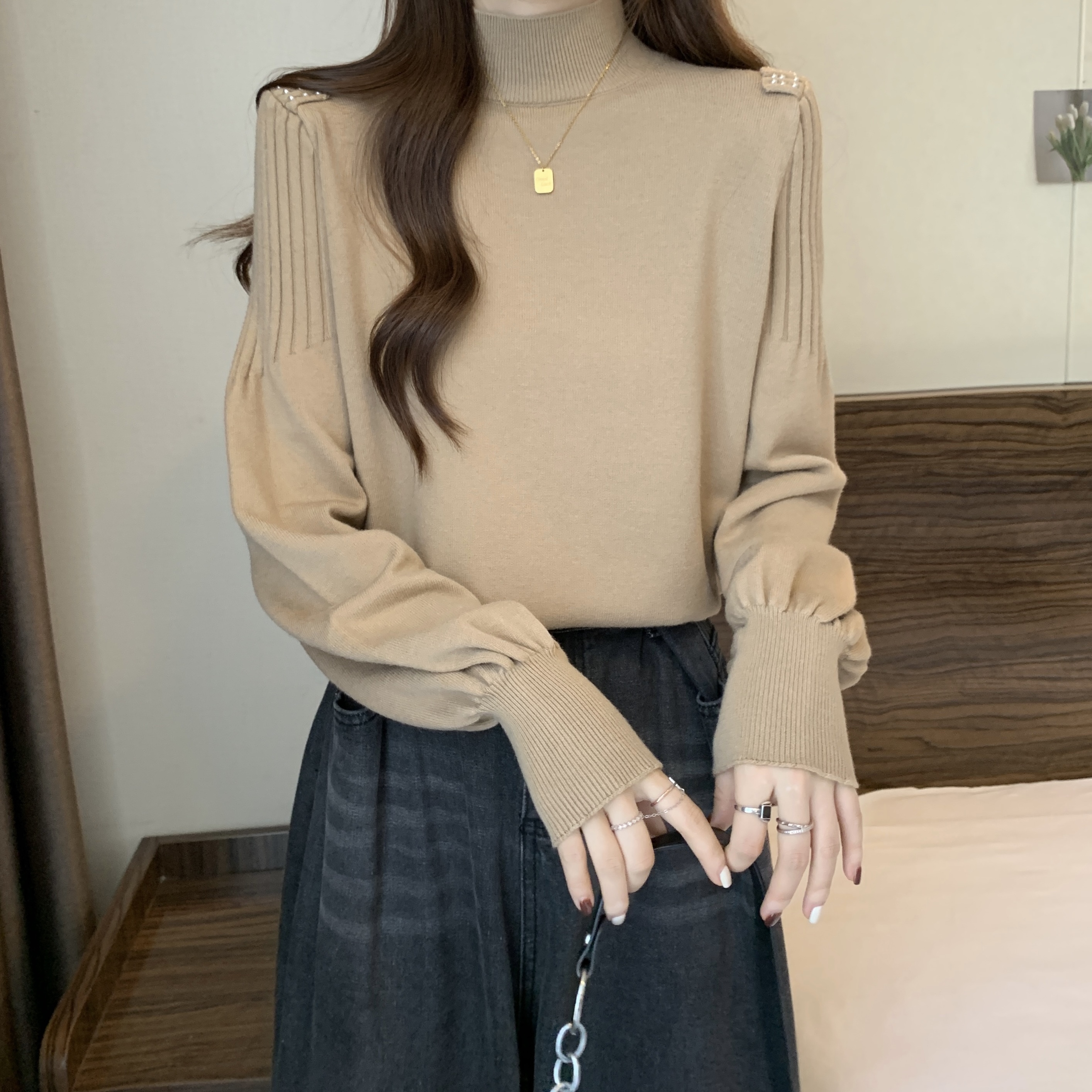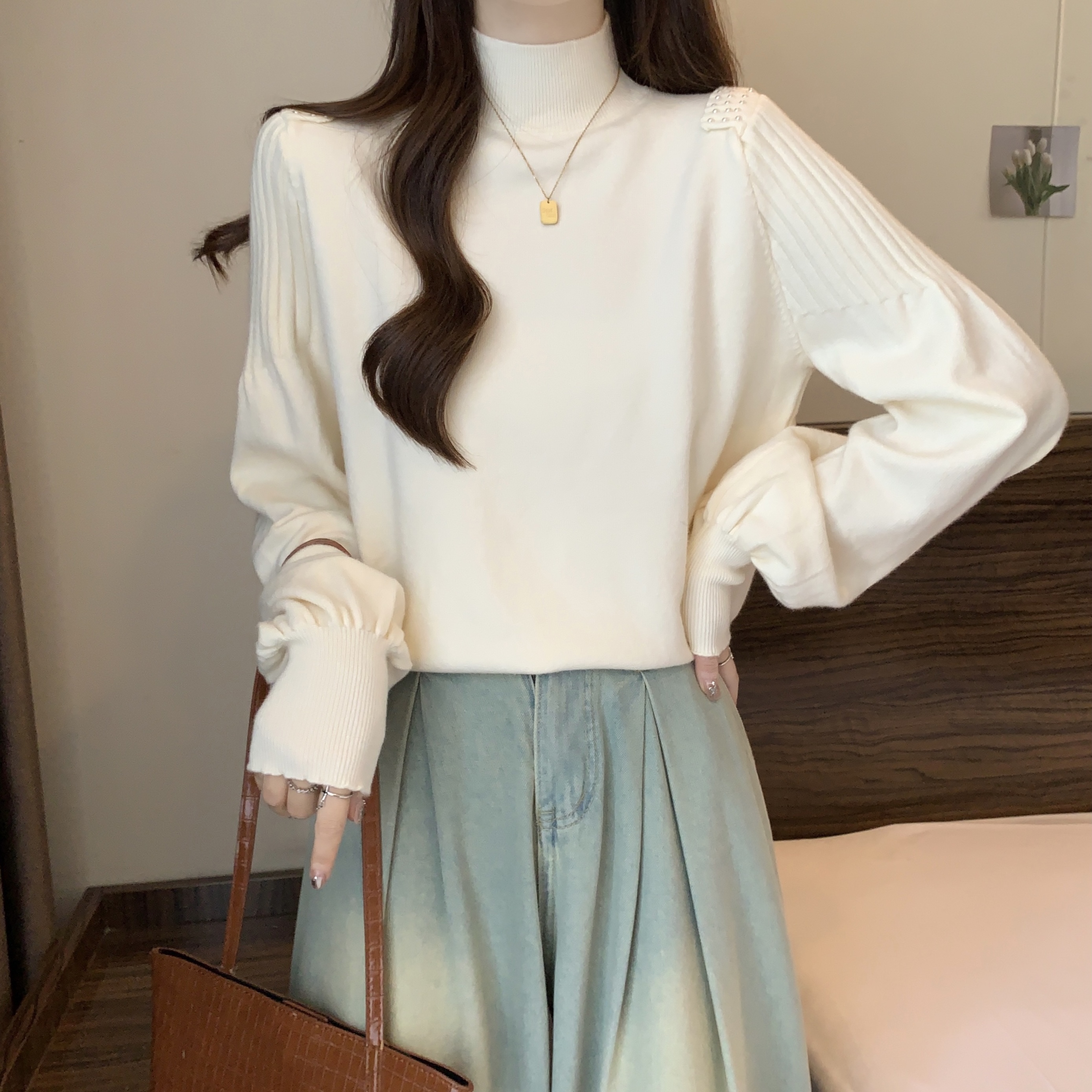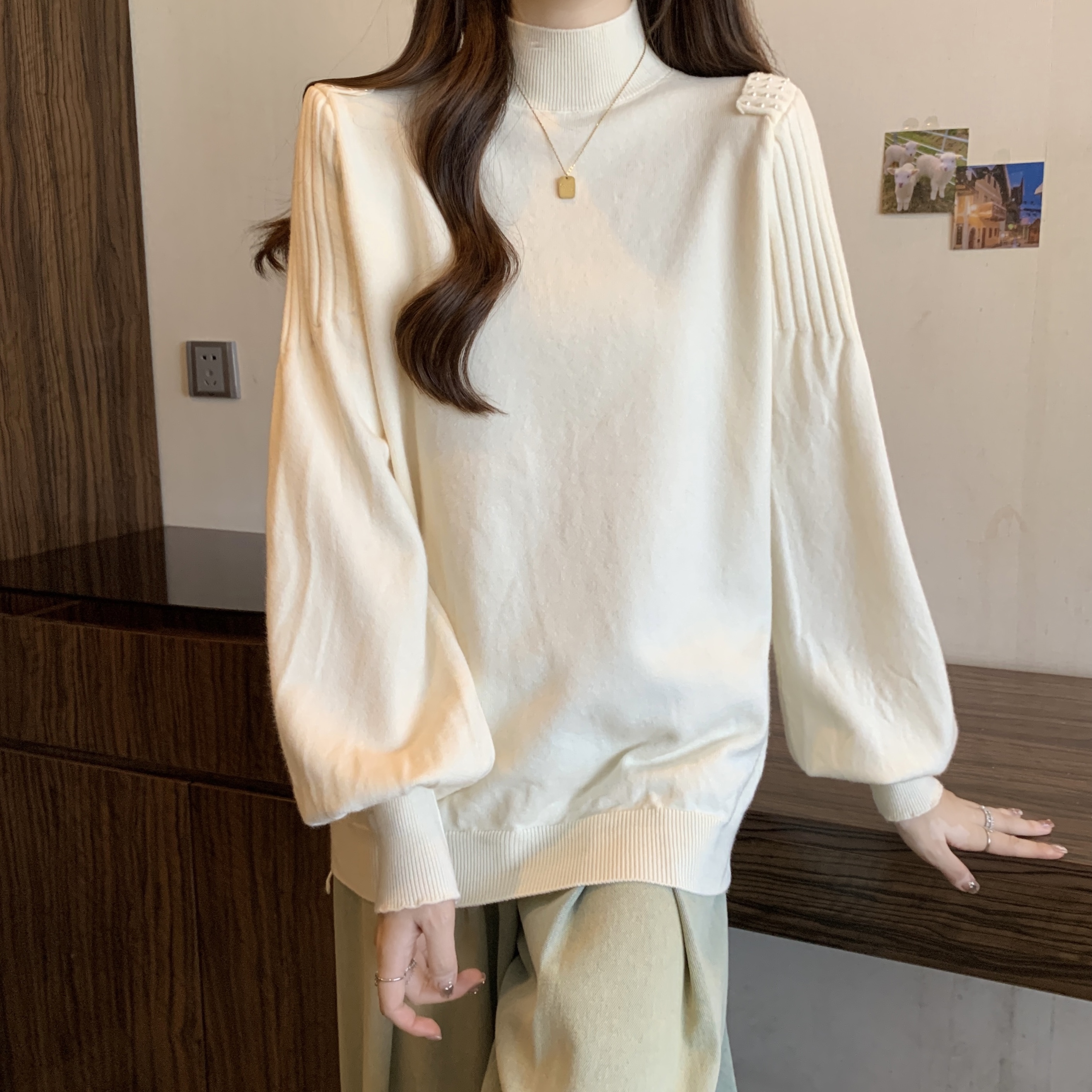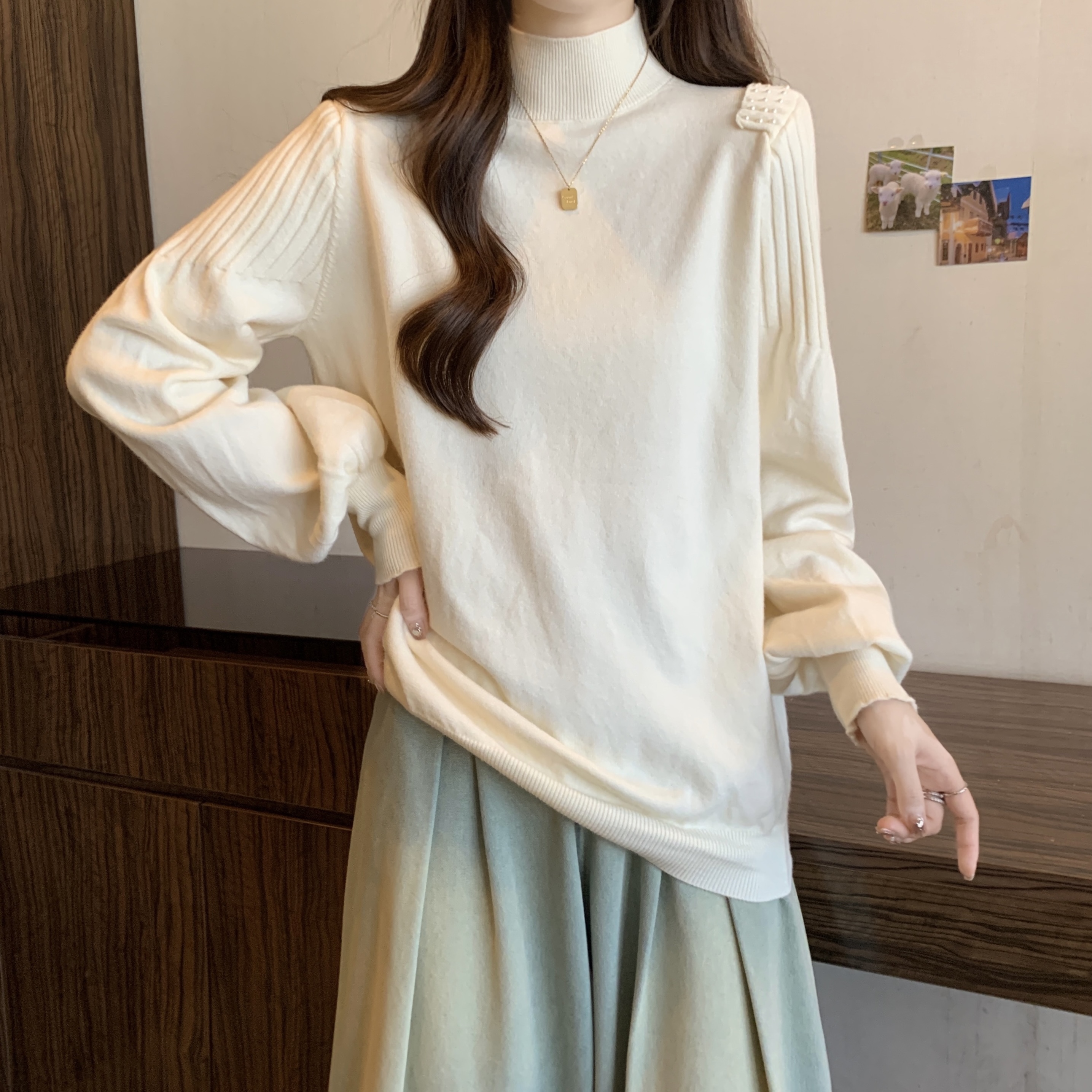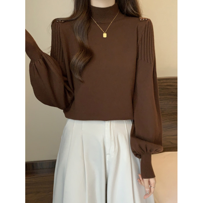 高級感黑色毛衣女秋冬半高領針織打底衫內搭慵懶風寬松燈籠袖上衣