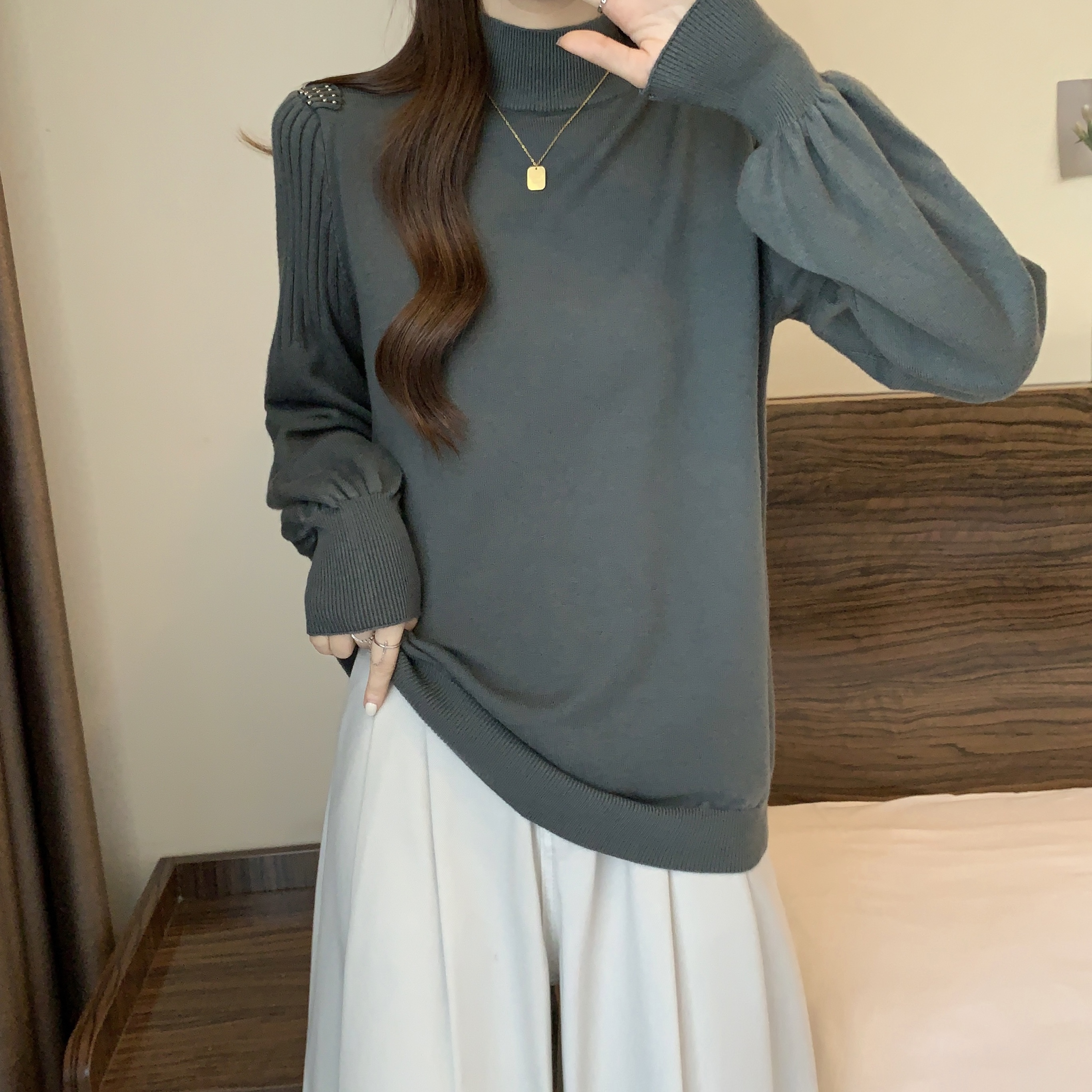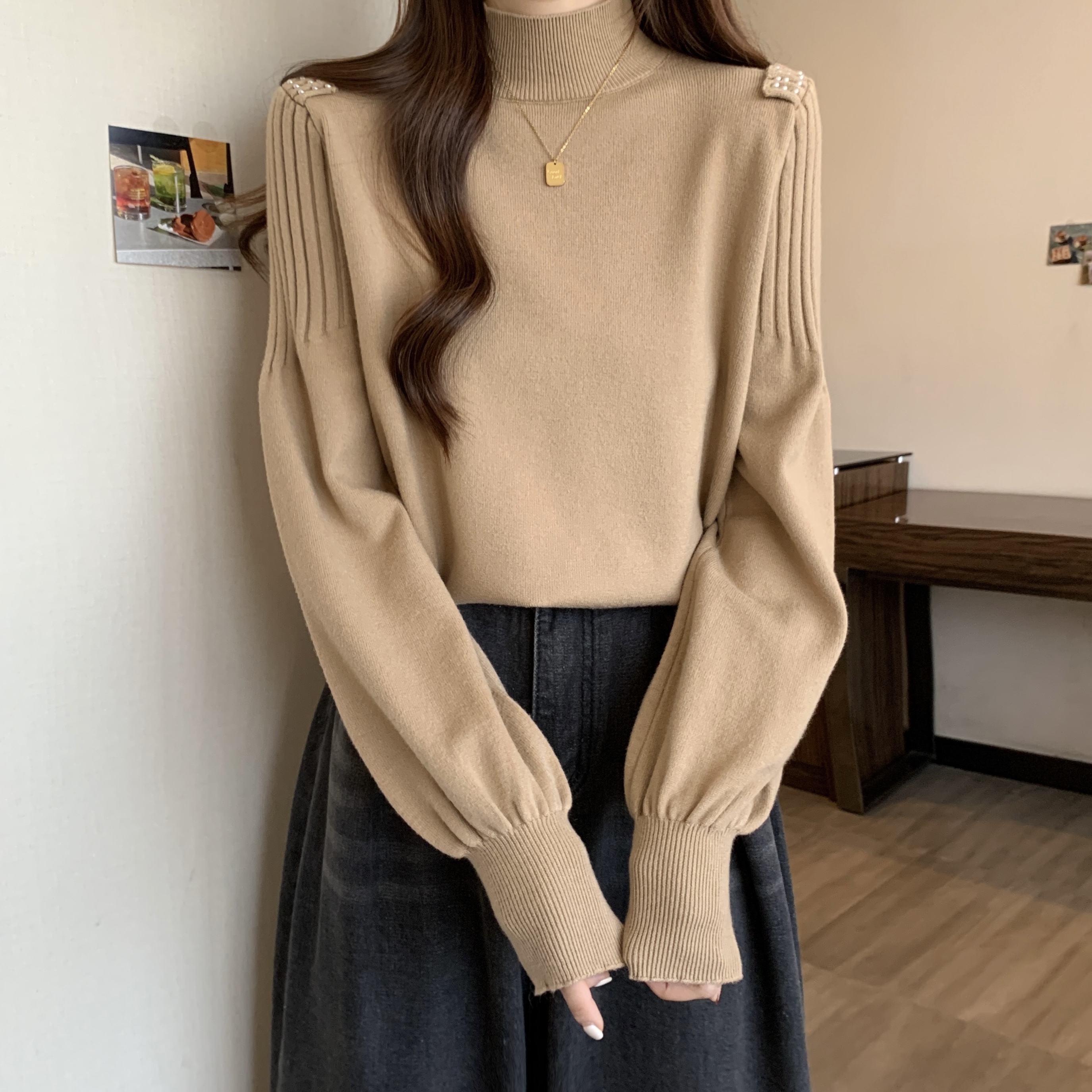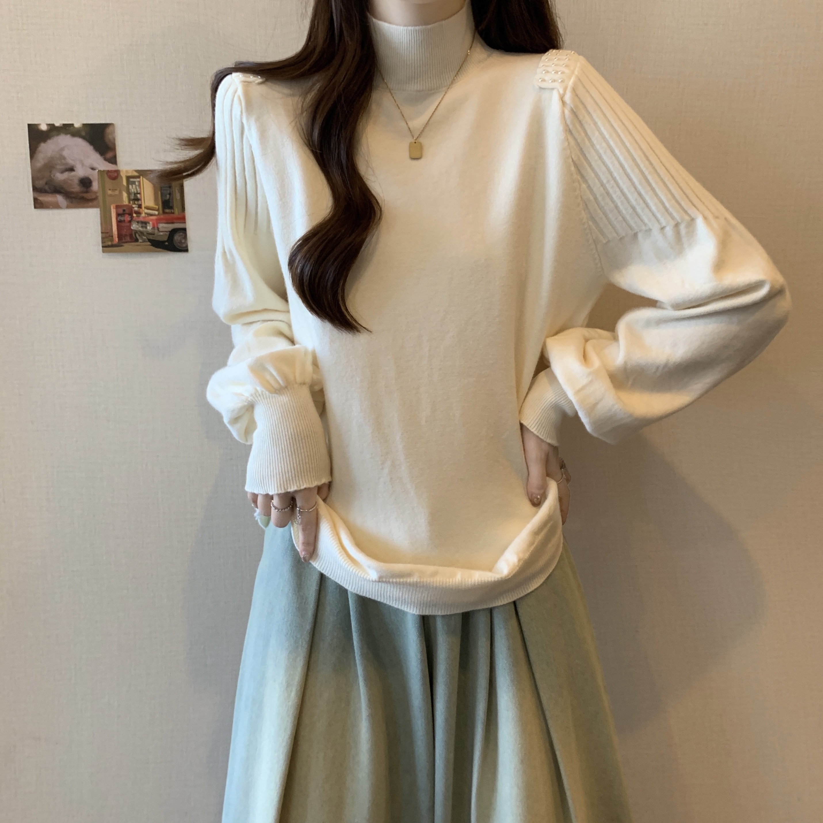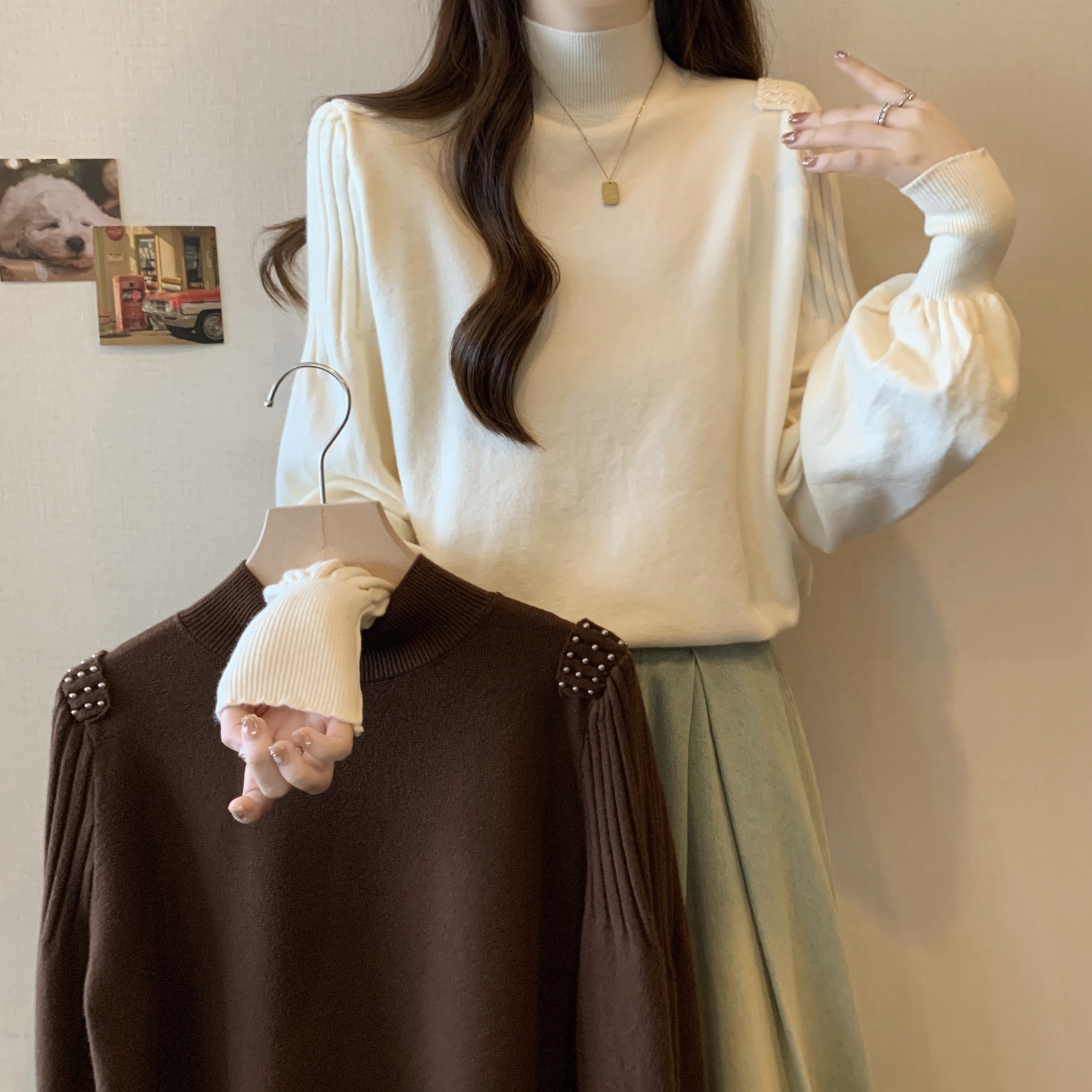 高級感黑色毛衣女秋冬半高領針織打底衫內搭慵懶風寬松燈籠袖上衣