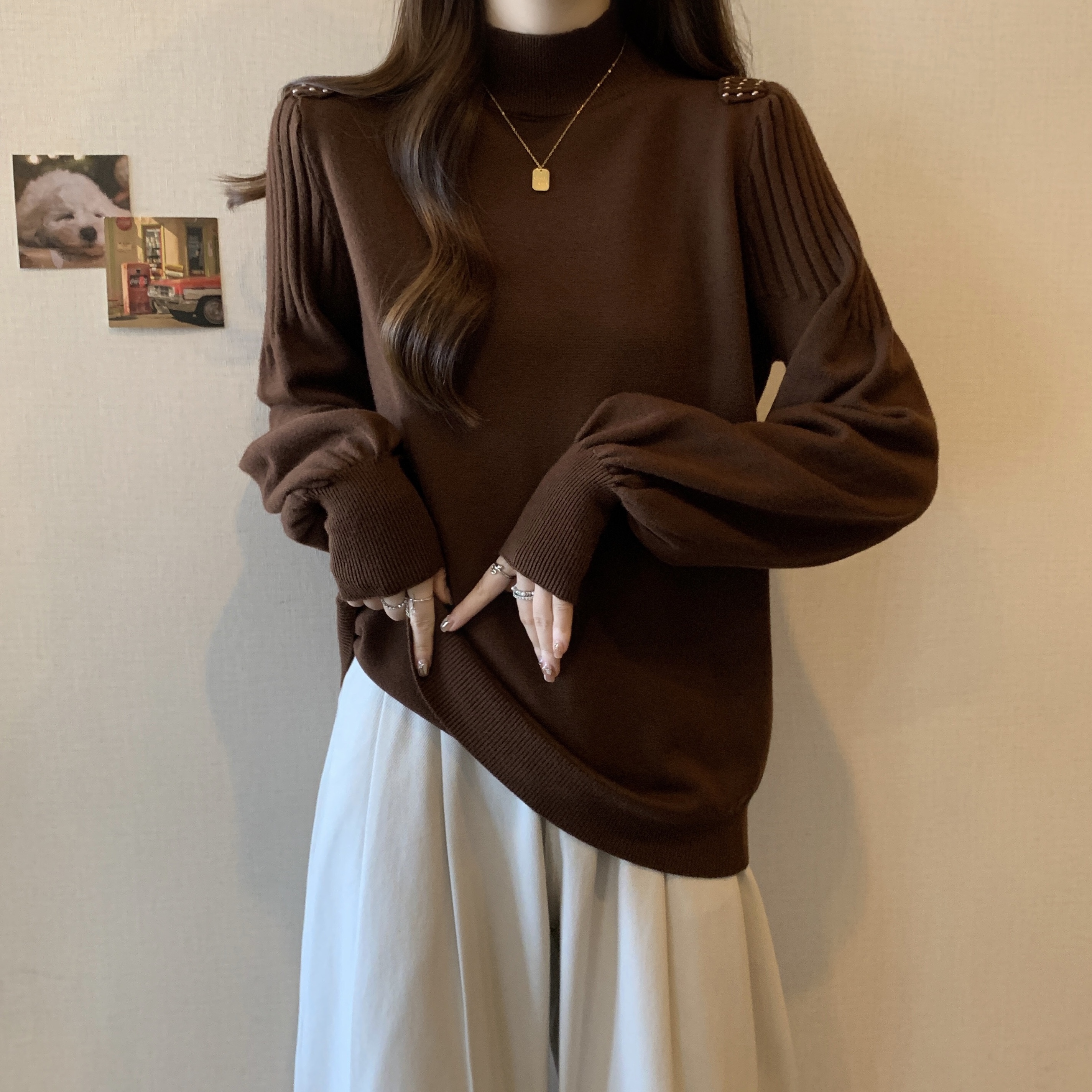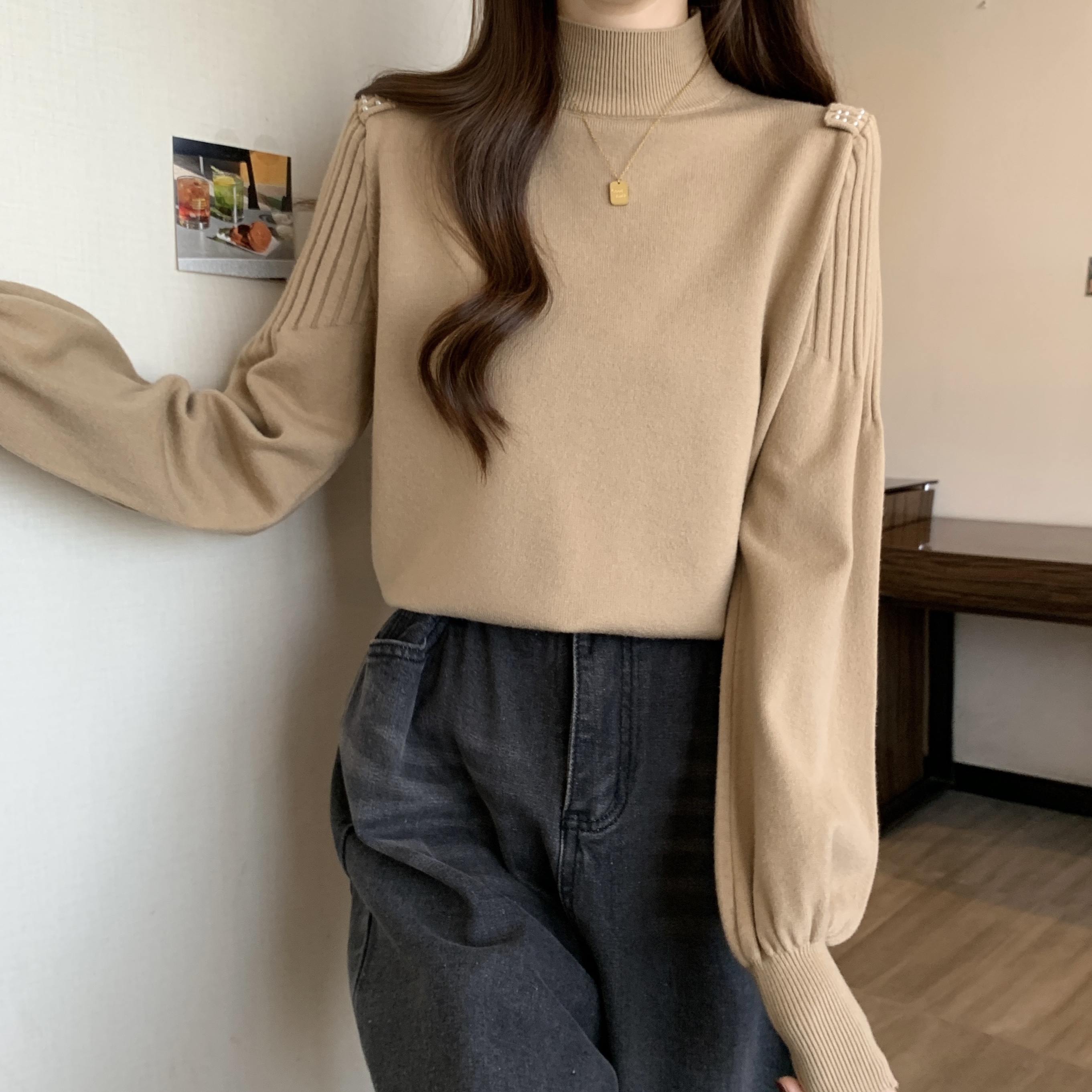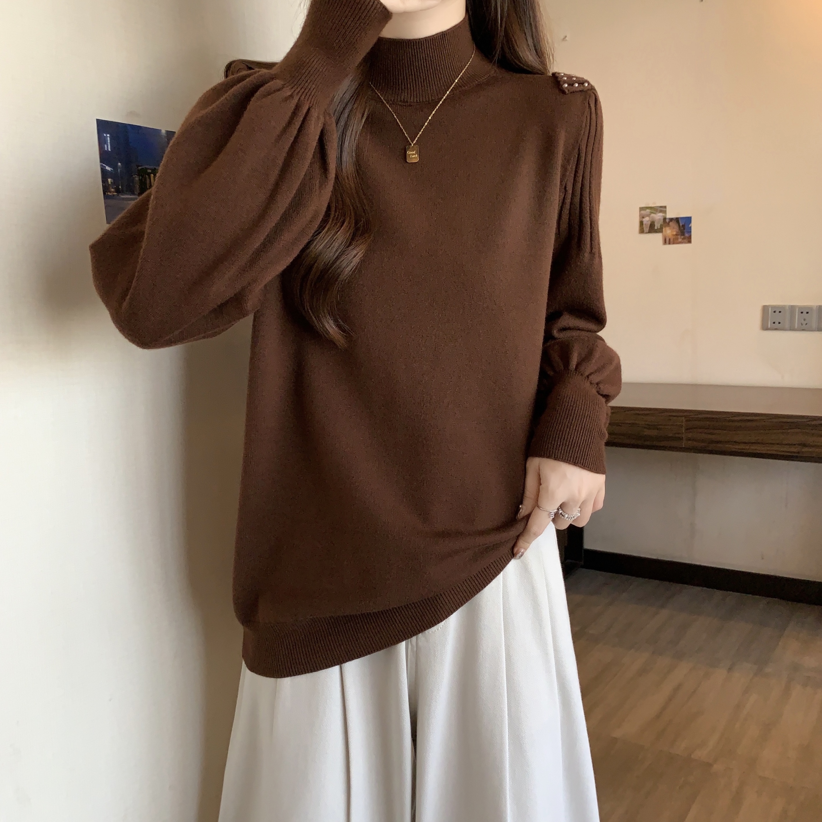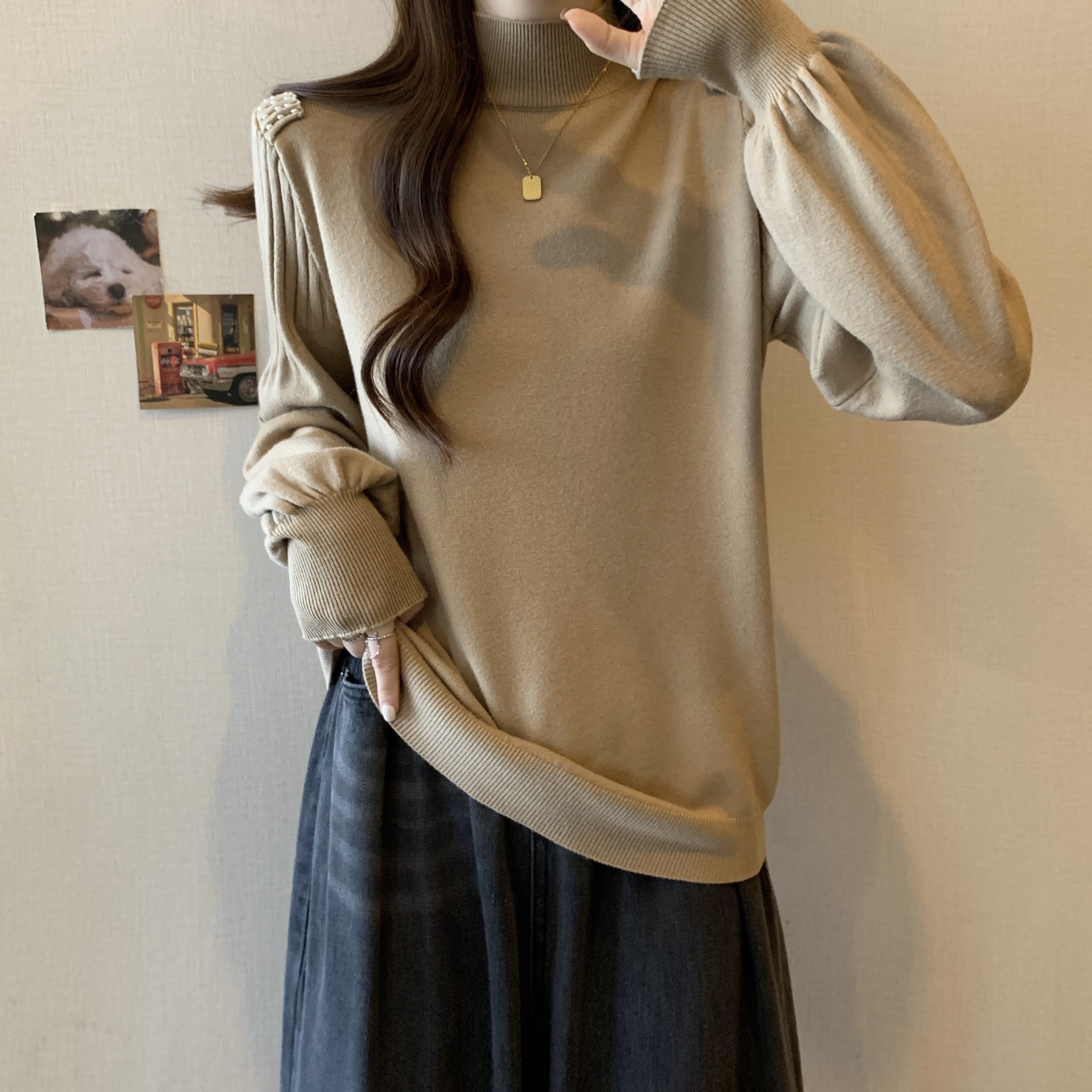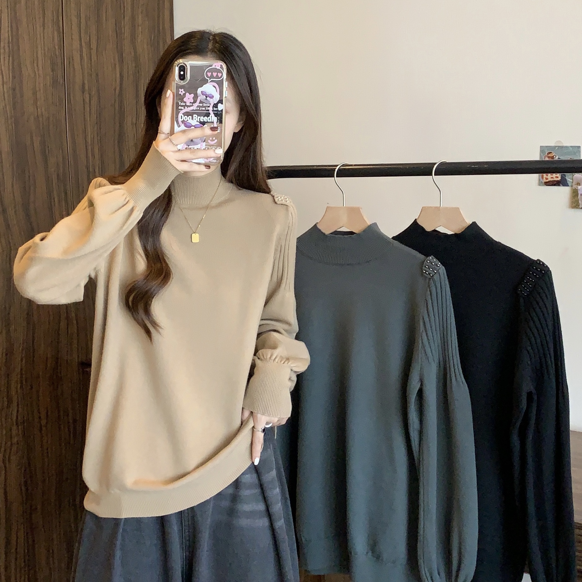 高級感黑色毛衣女秋冬半高領針織打底衫內搭慵懶風寬松燈籠袖上衣