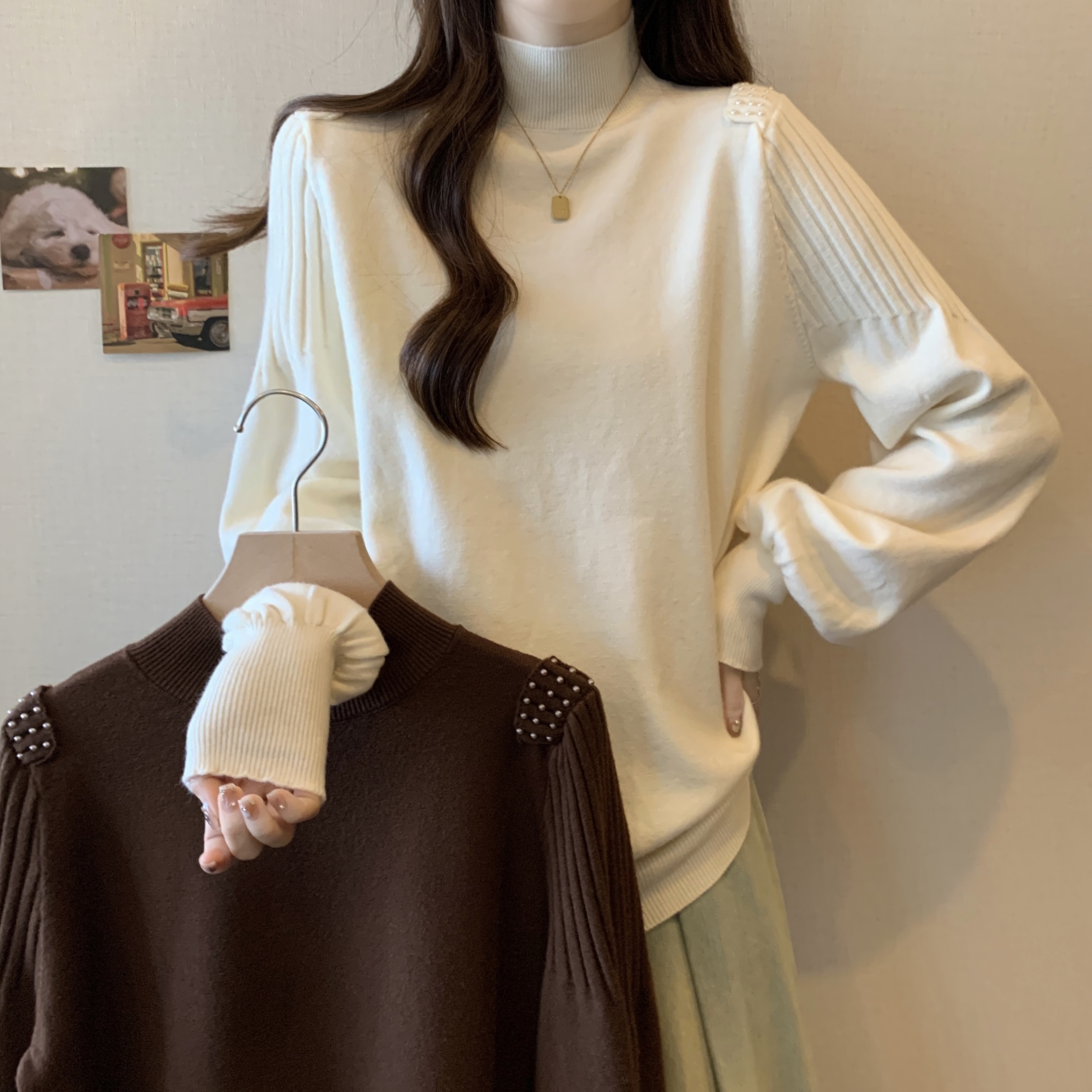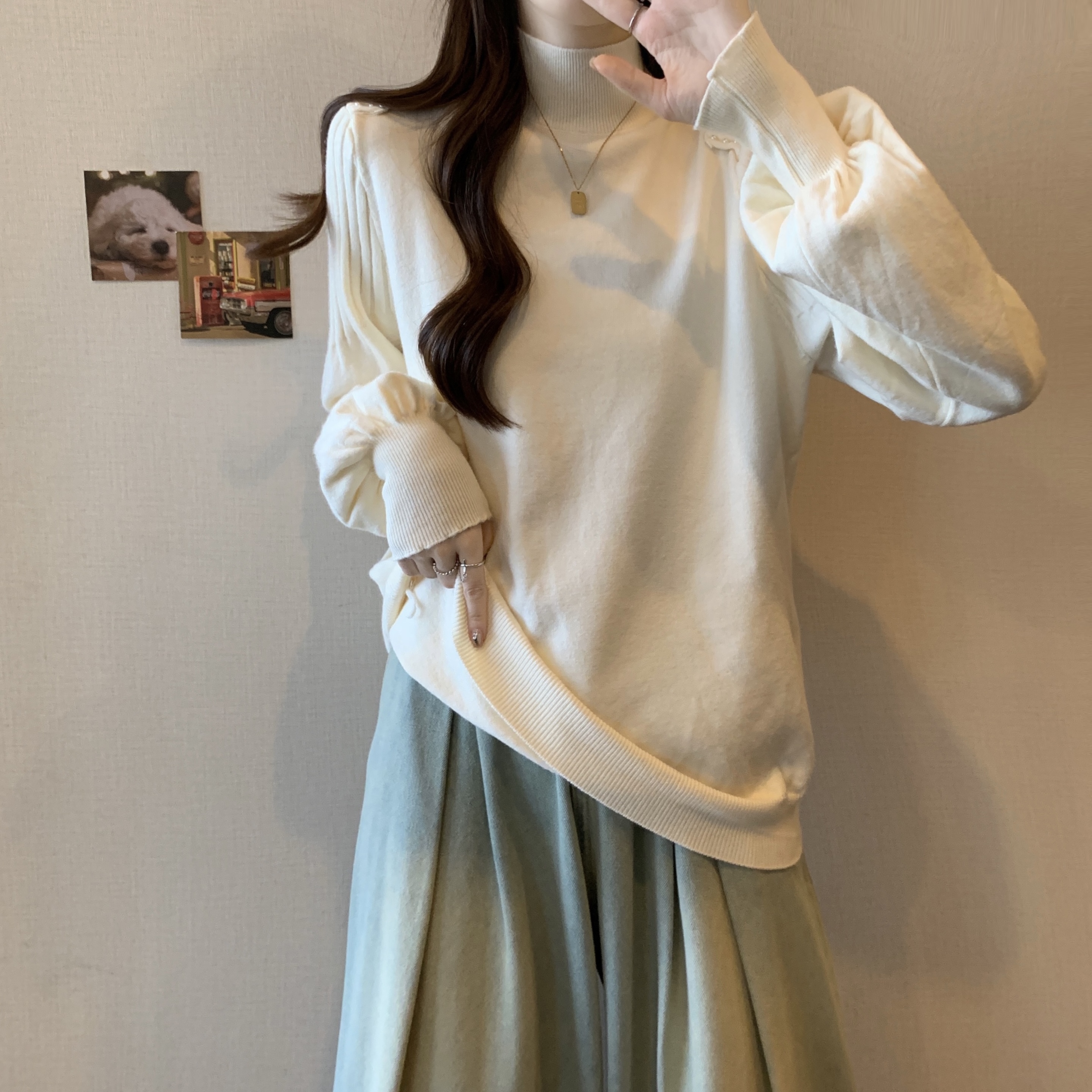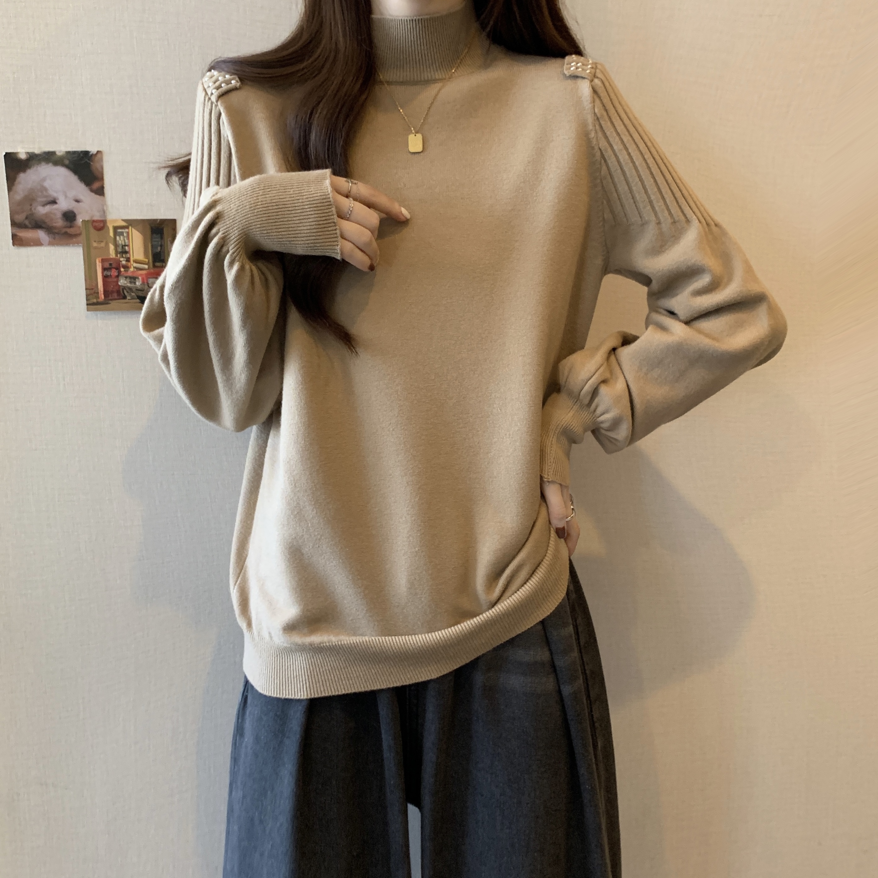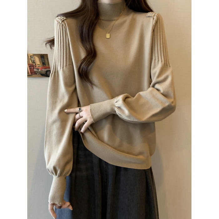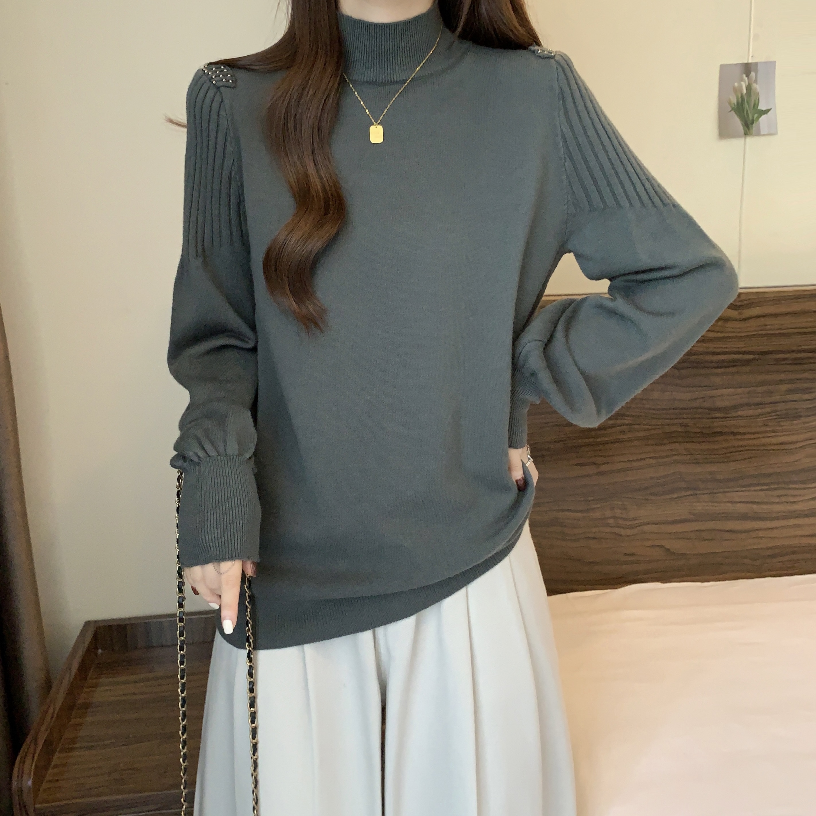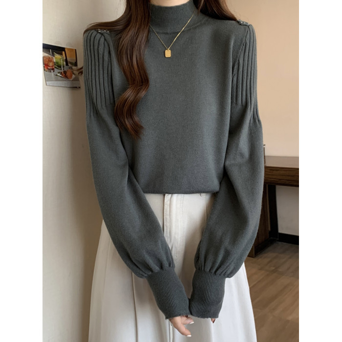 高級感黑色毛衣女秋冬半高領針織打底衫內搭慵懶風寬松燈籠袖上衣