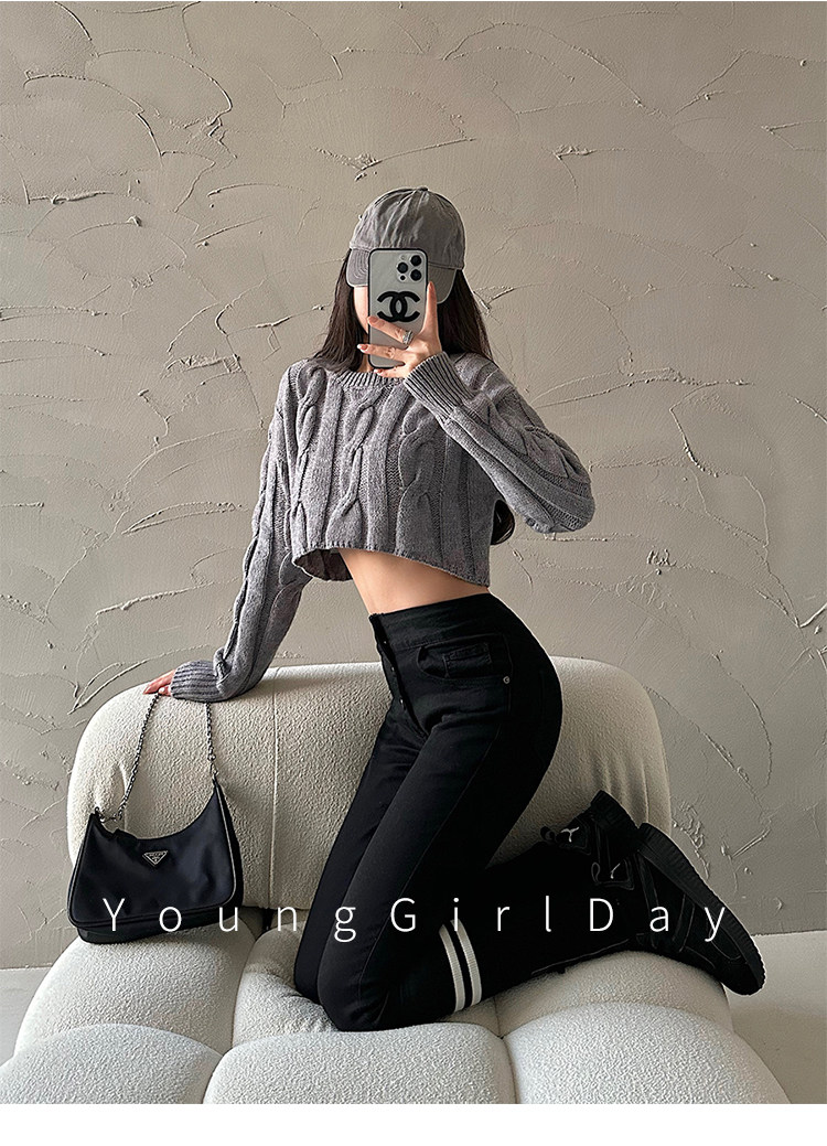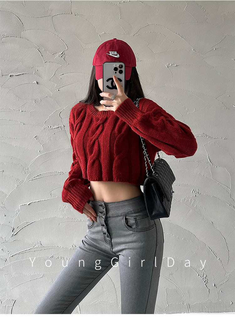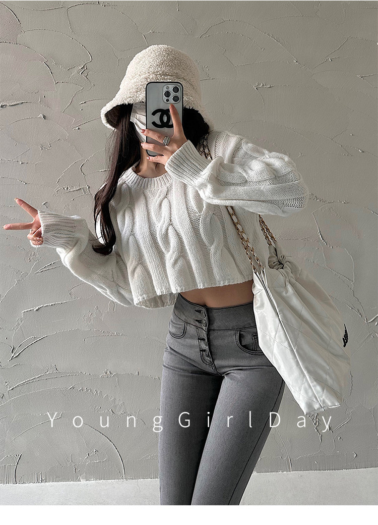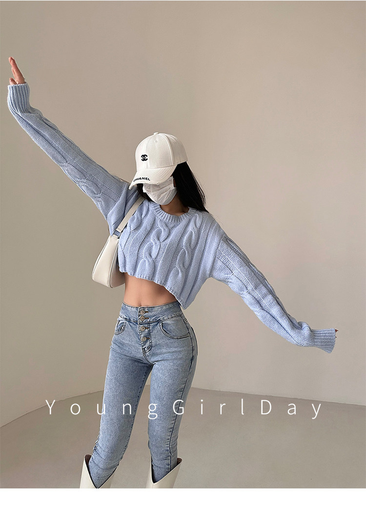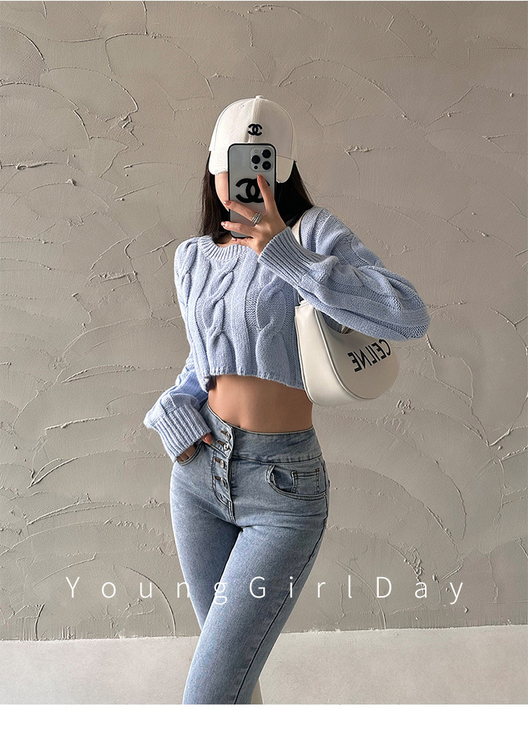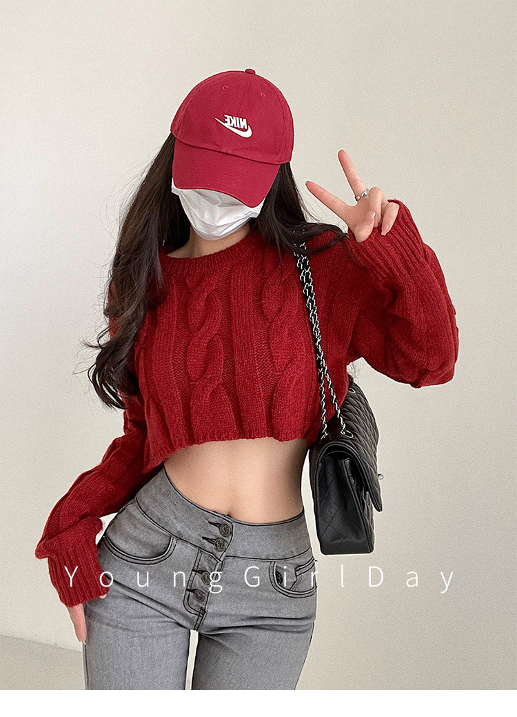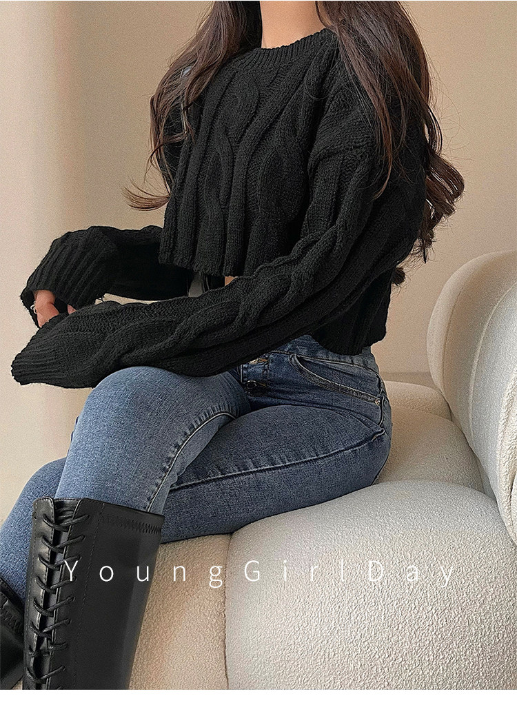 YoungGirlDay美式復古圓領寬松顯瘦短款露臍麻花針織衫長袖毛衣女