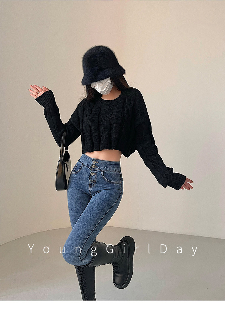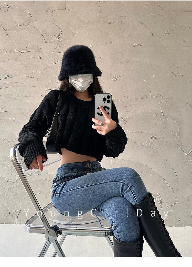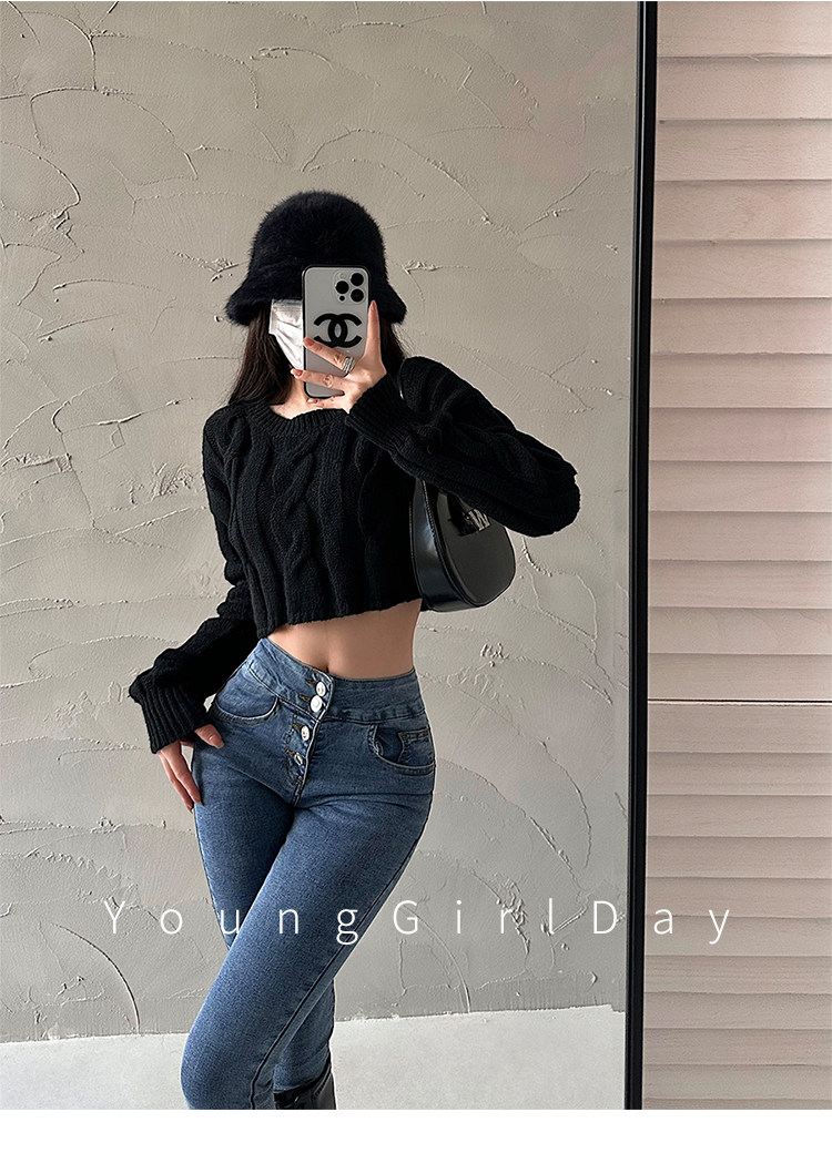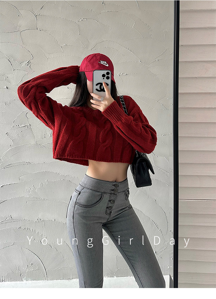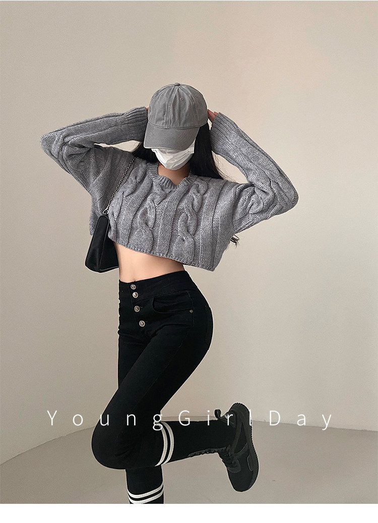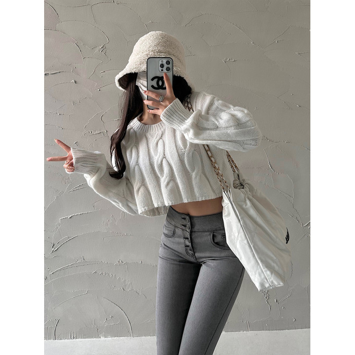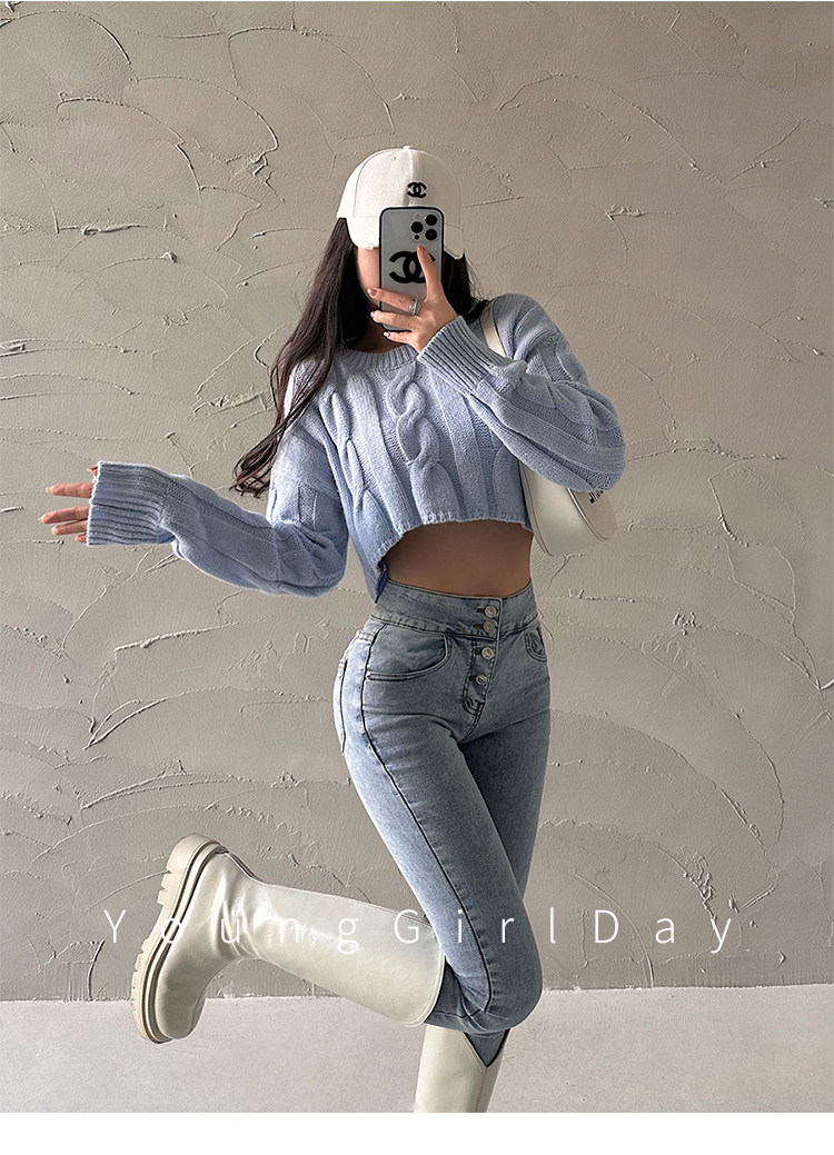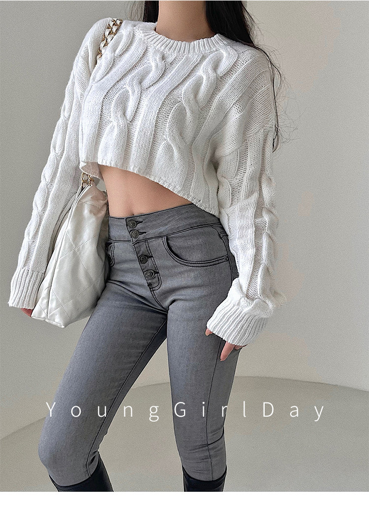 YoungGirlDay美式復古圓領寬松顯瘦短款露臍麻花針織衫長袖毛衣女