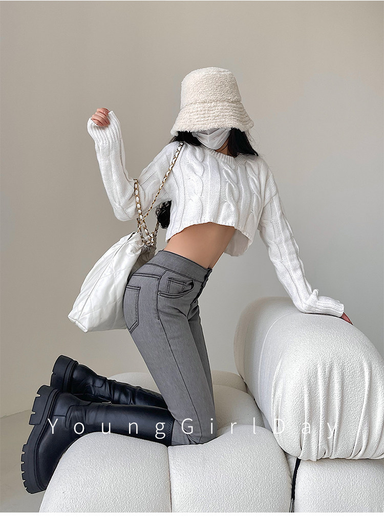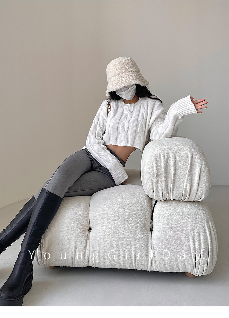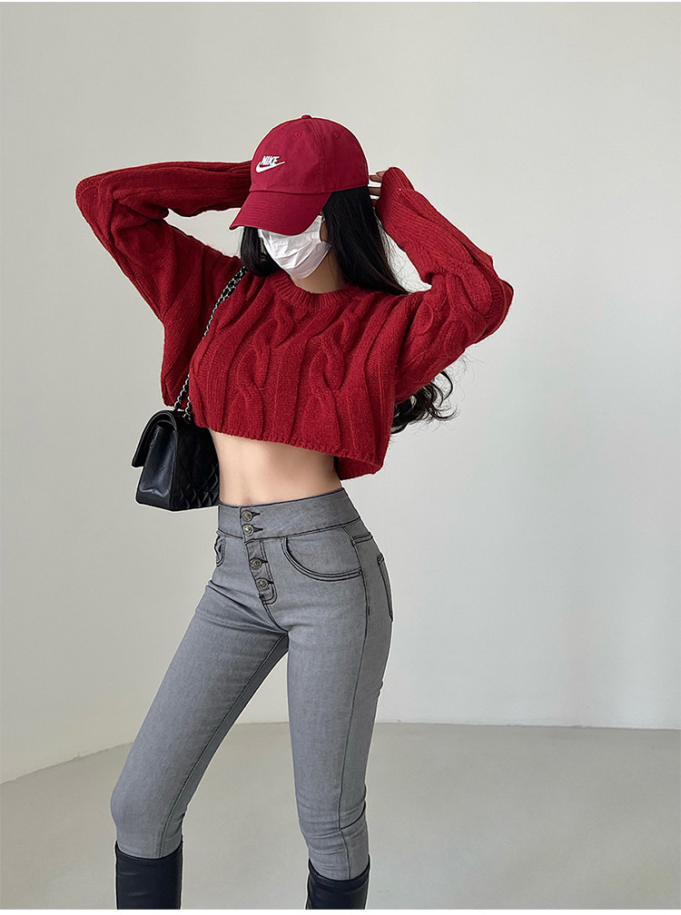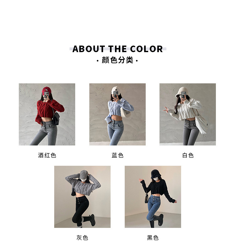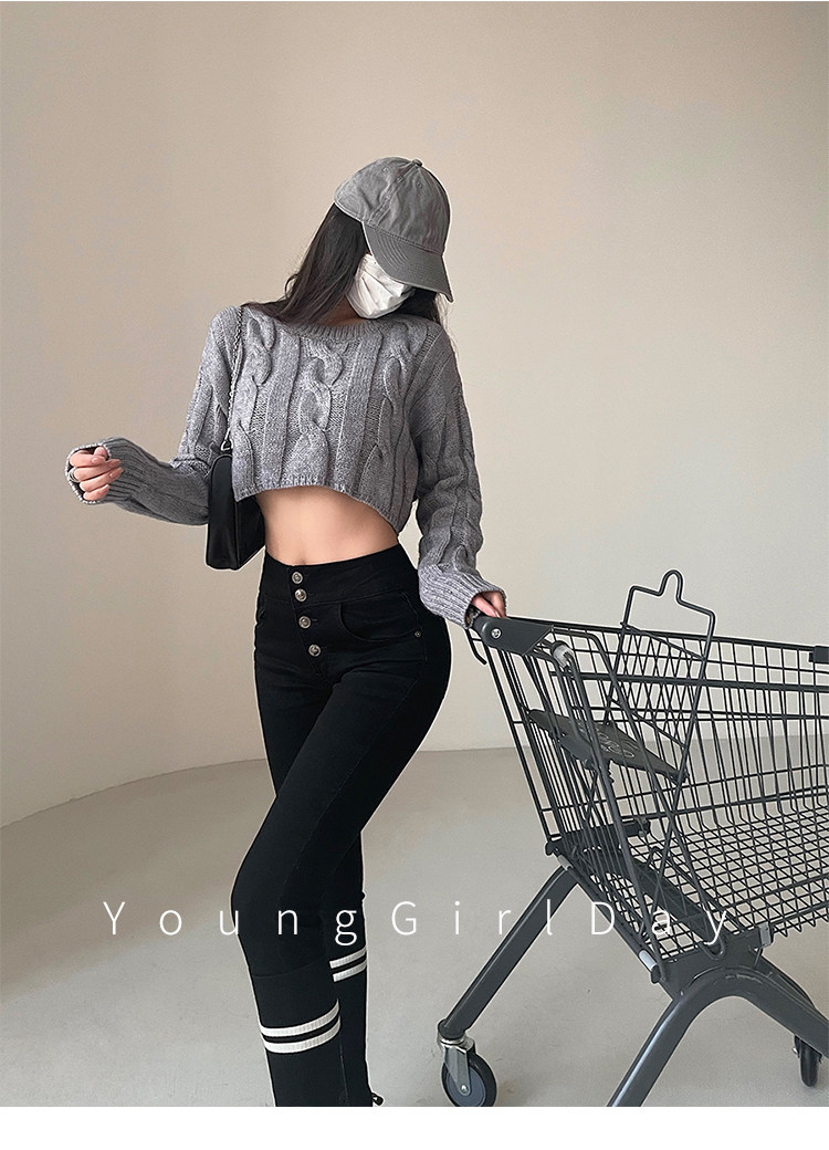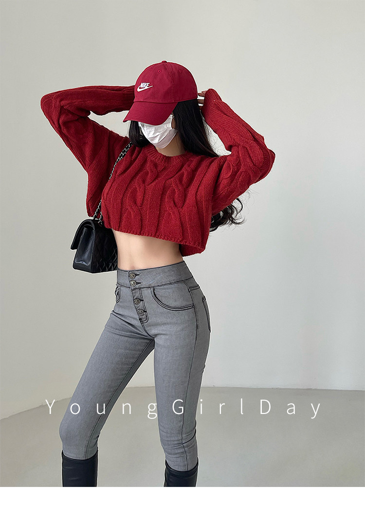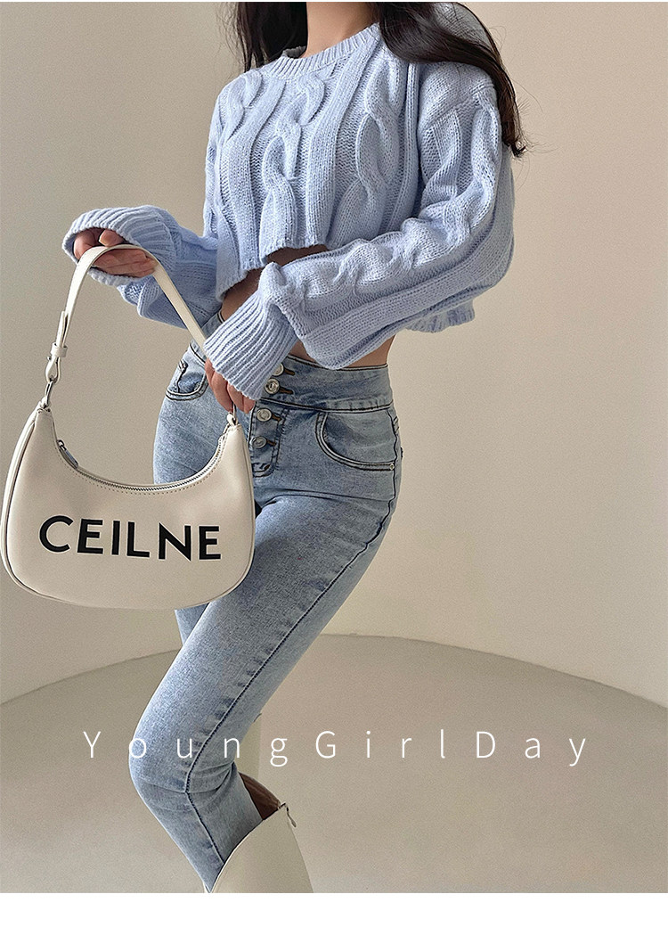 YoungGirlDay美式復古圓領寬松顯瘦短款露臍麻花針織衫長袖毛衣女