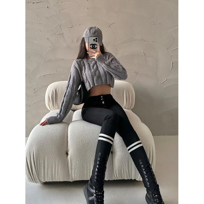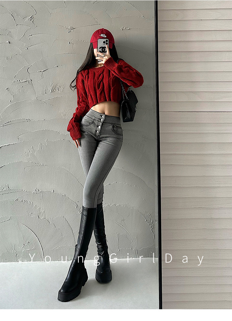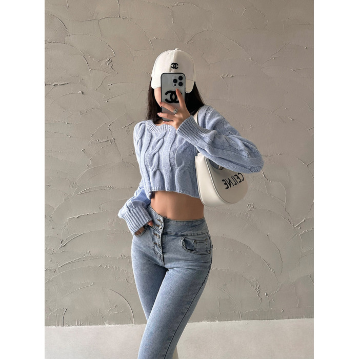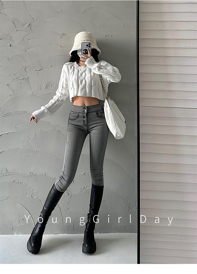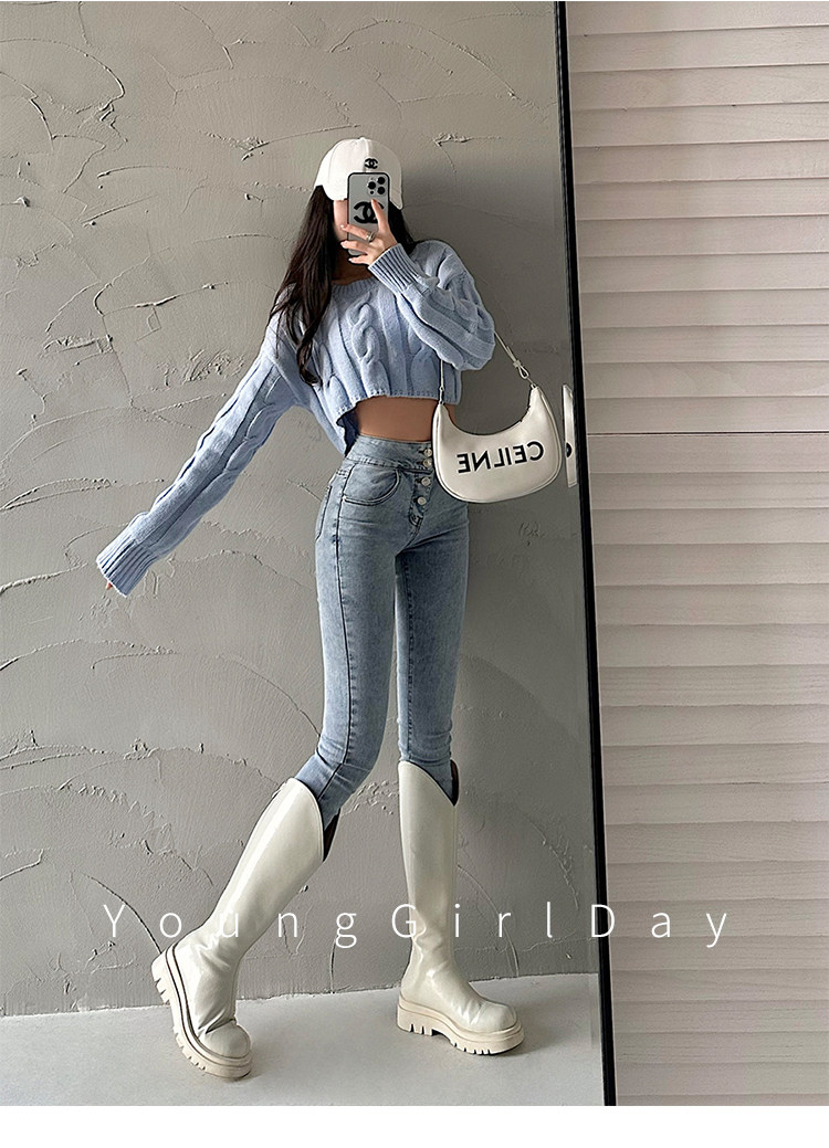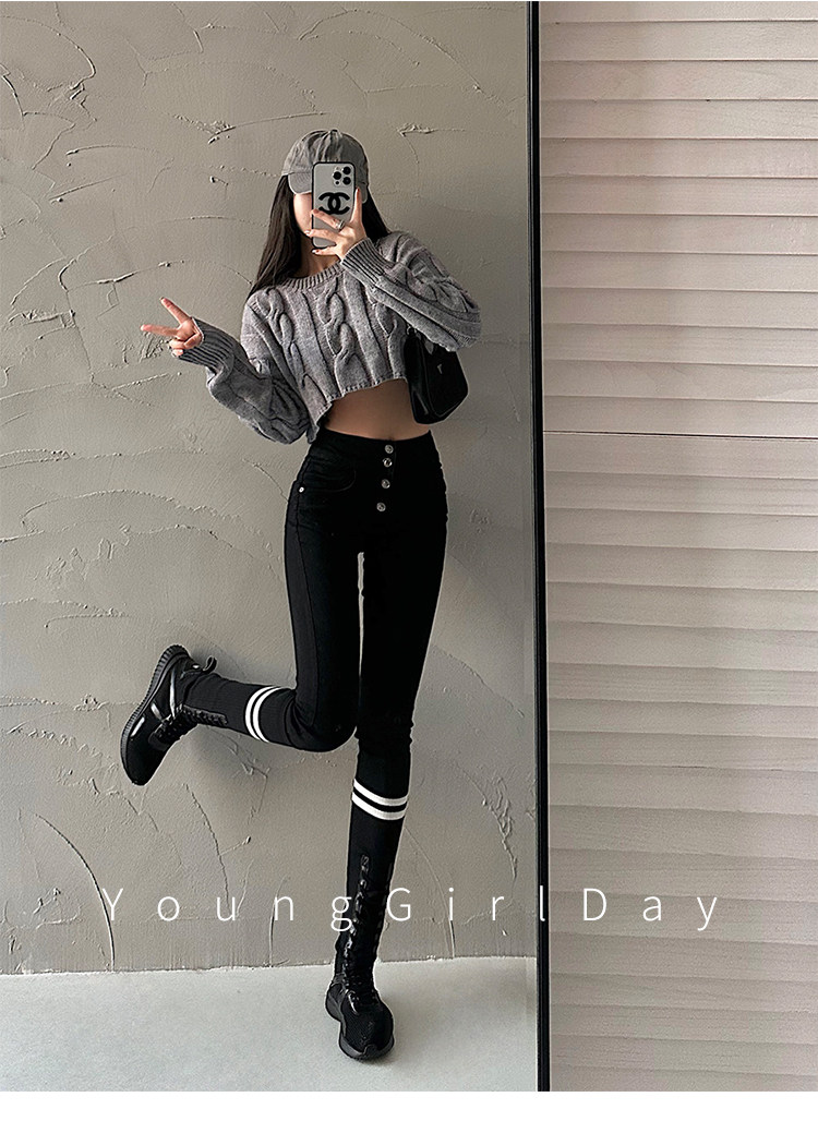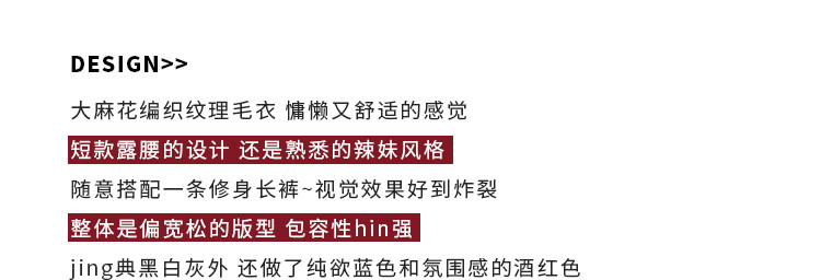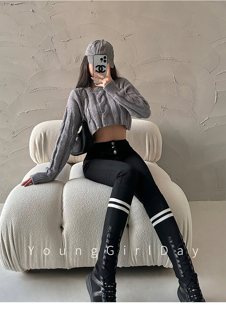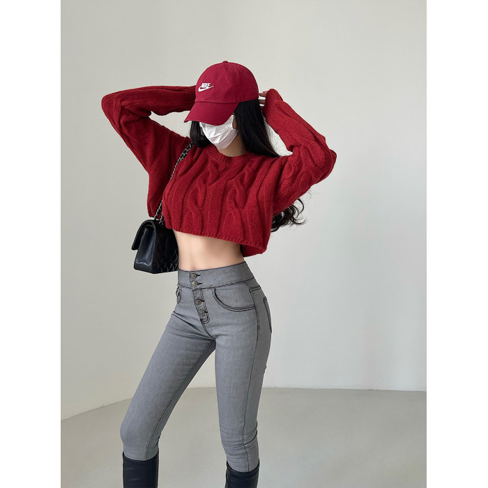 YoungGirlDay美式復古圓領寬松顯瘦短款露臍麻花針織衫長袖毛衣女