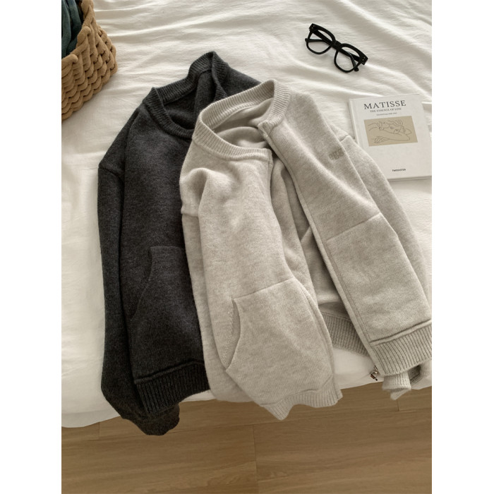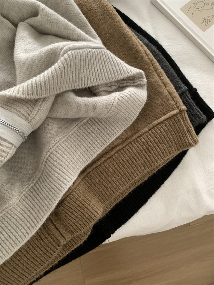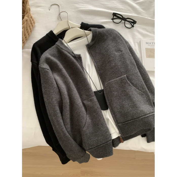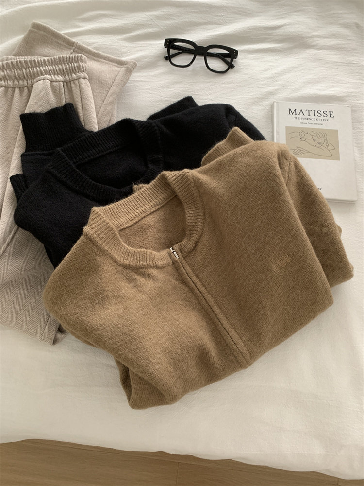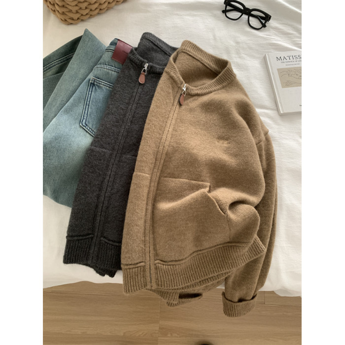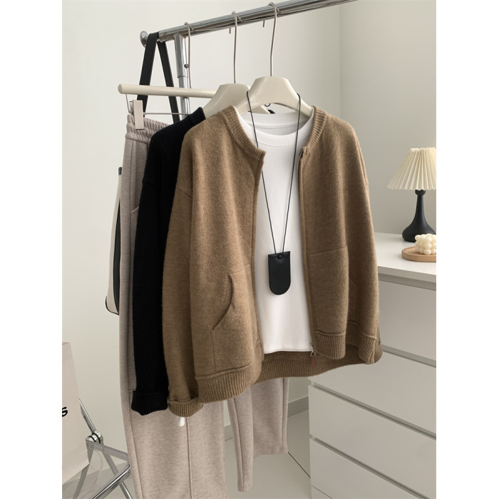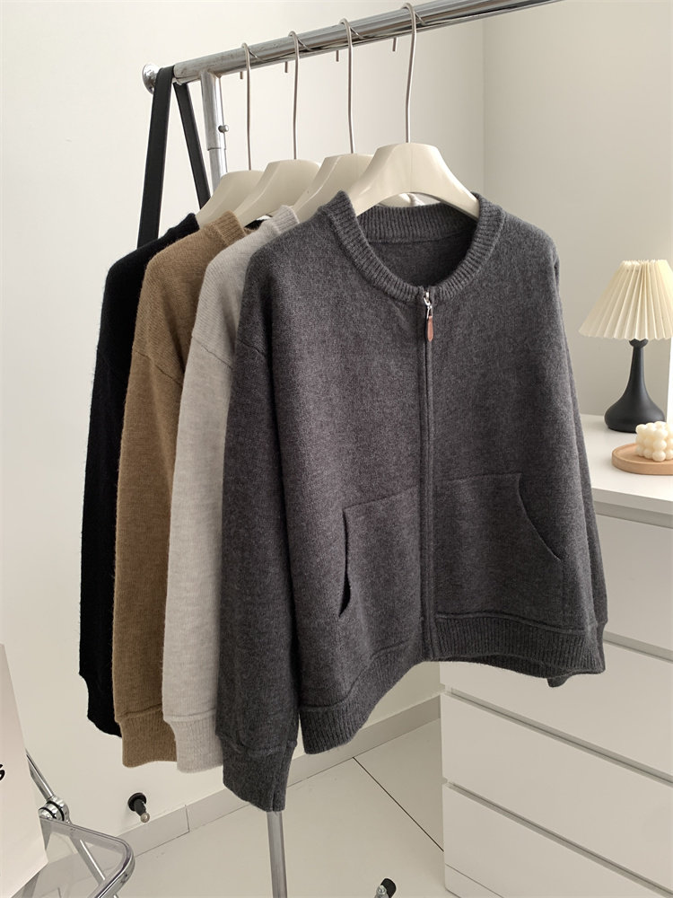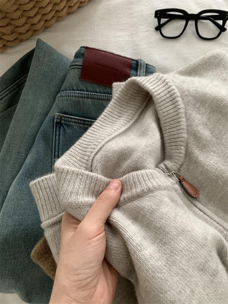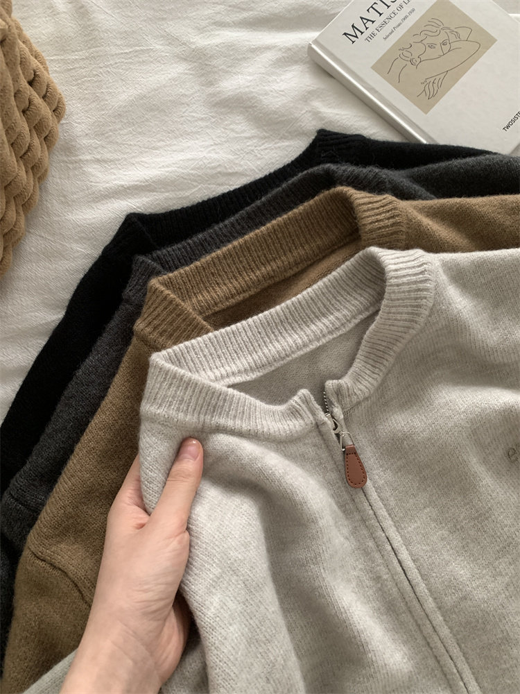 緊密厚實針織開衫女氣質通勤慵懶垂感百搭圓領拉鍊衫秋冬毛衣外套