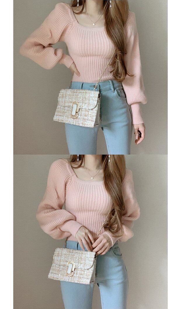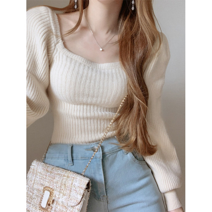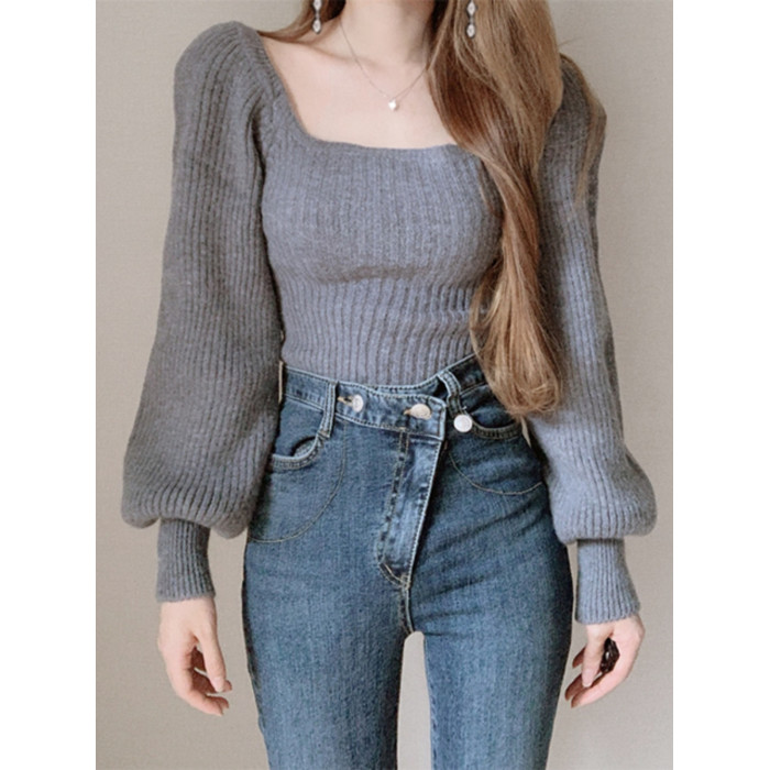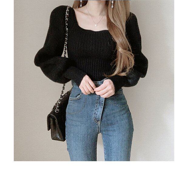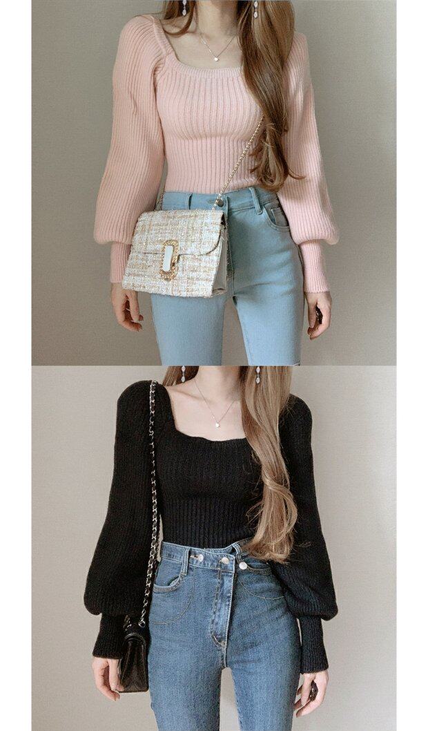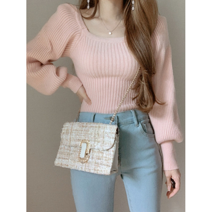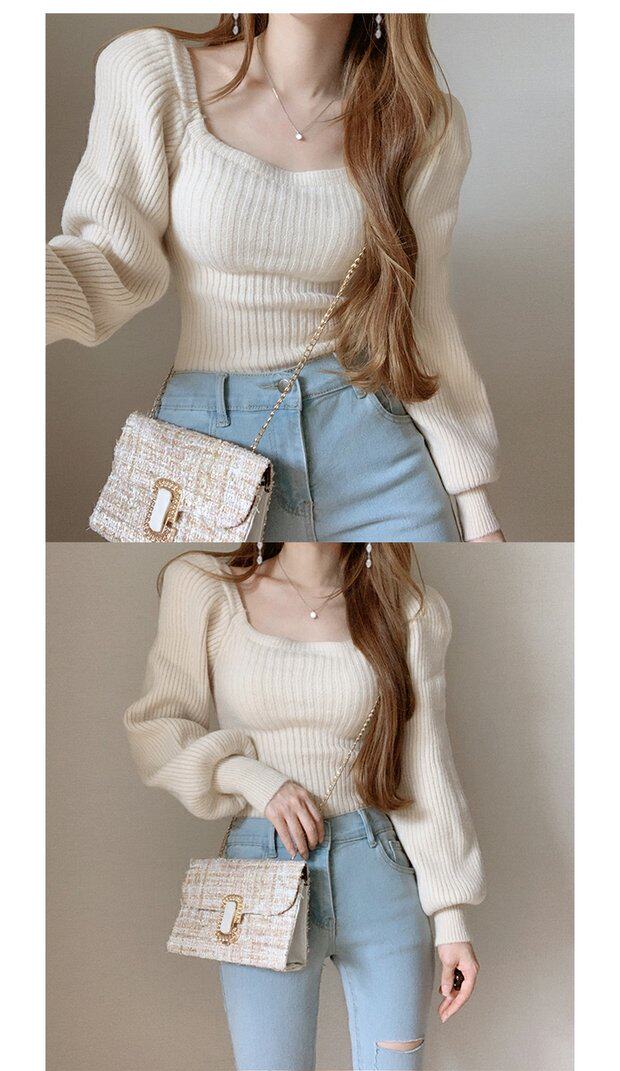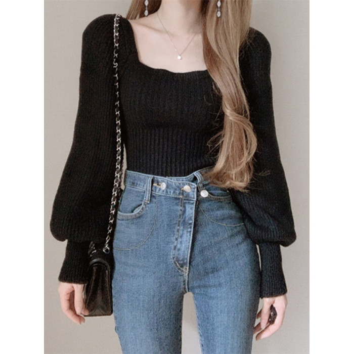 韓國chic秋冬復古設計感小衆方領泡泡袖針織衫上衣慵懶長袖毛衣女