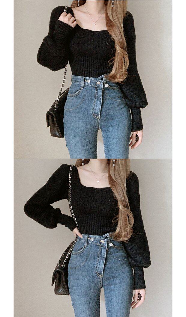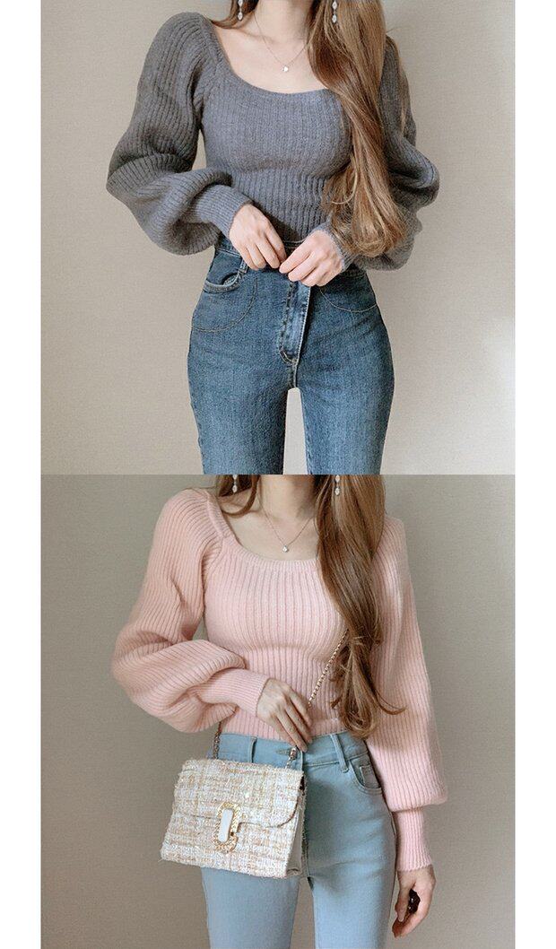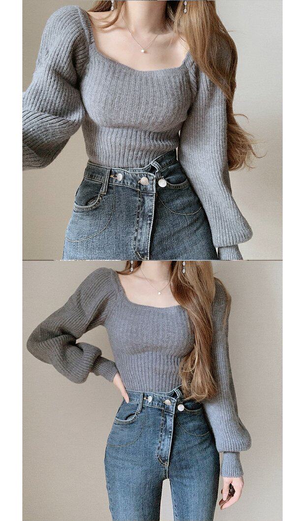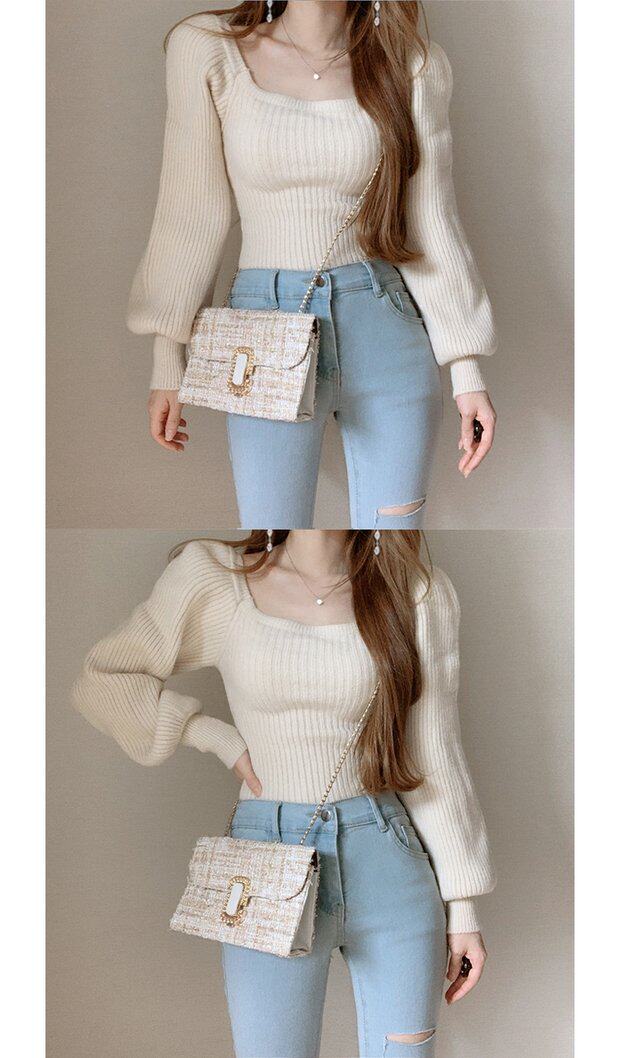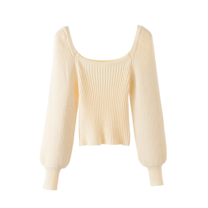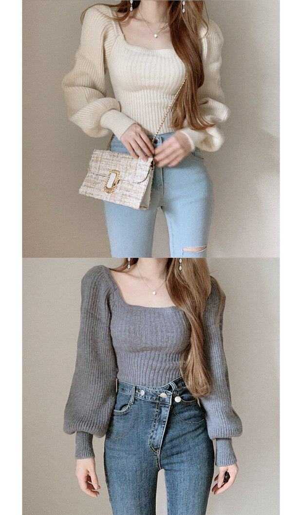韓國chic秋冬復古設計感小衆方領泡泡袖針織衫上衣慵懶長袖毛衣女