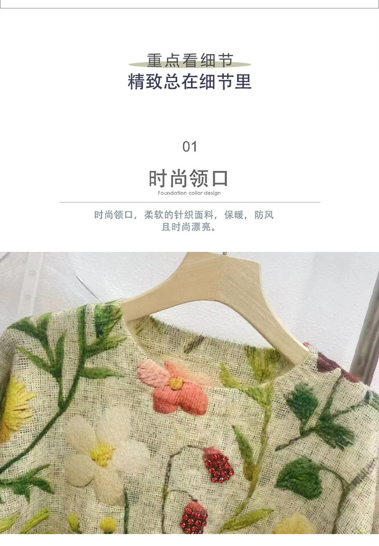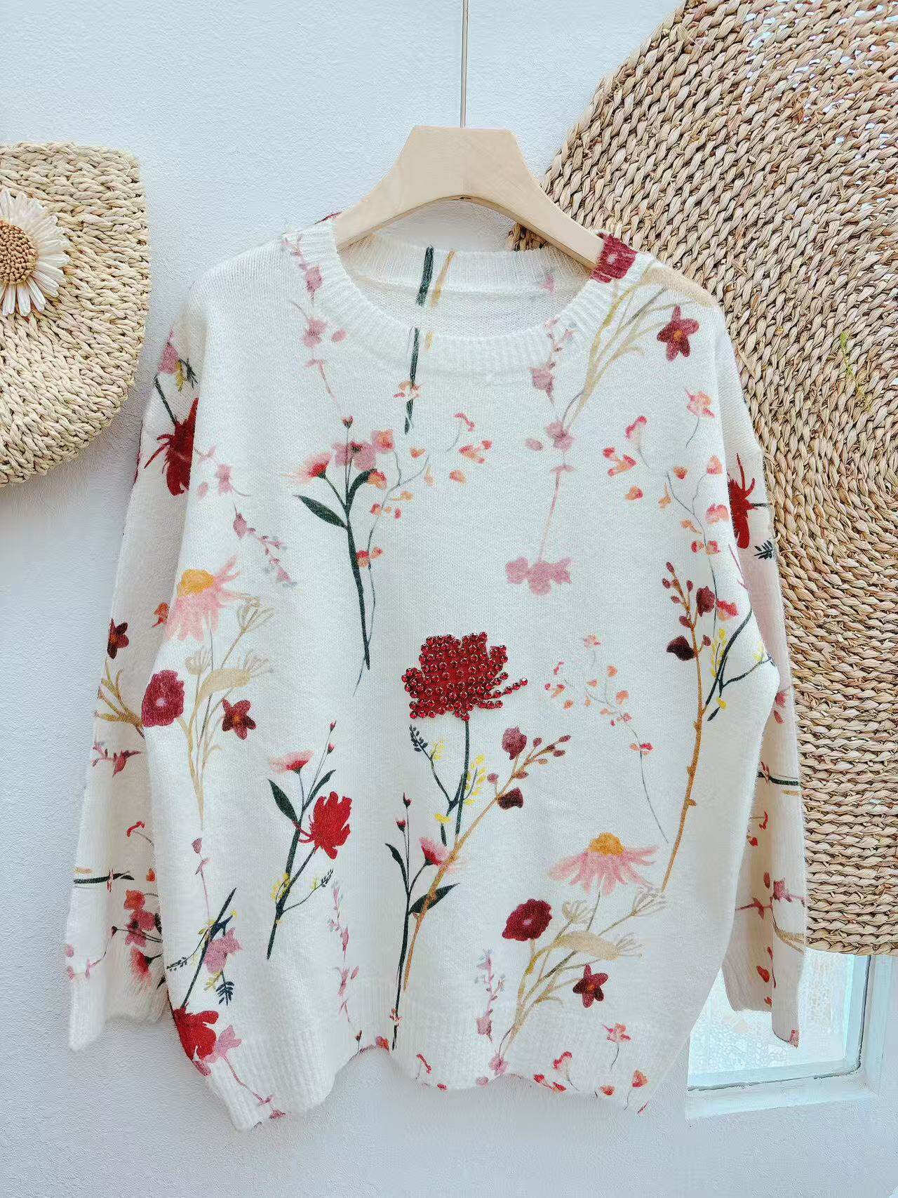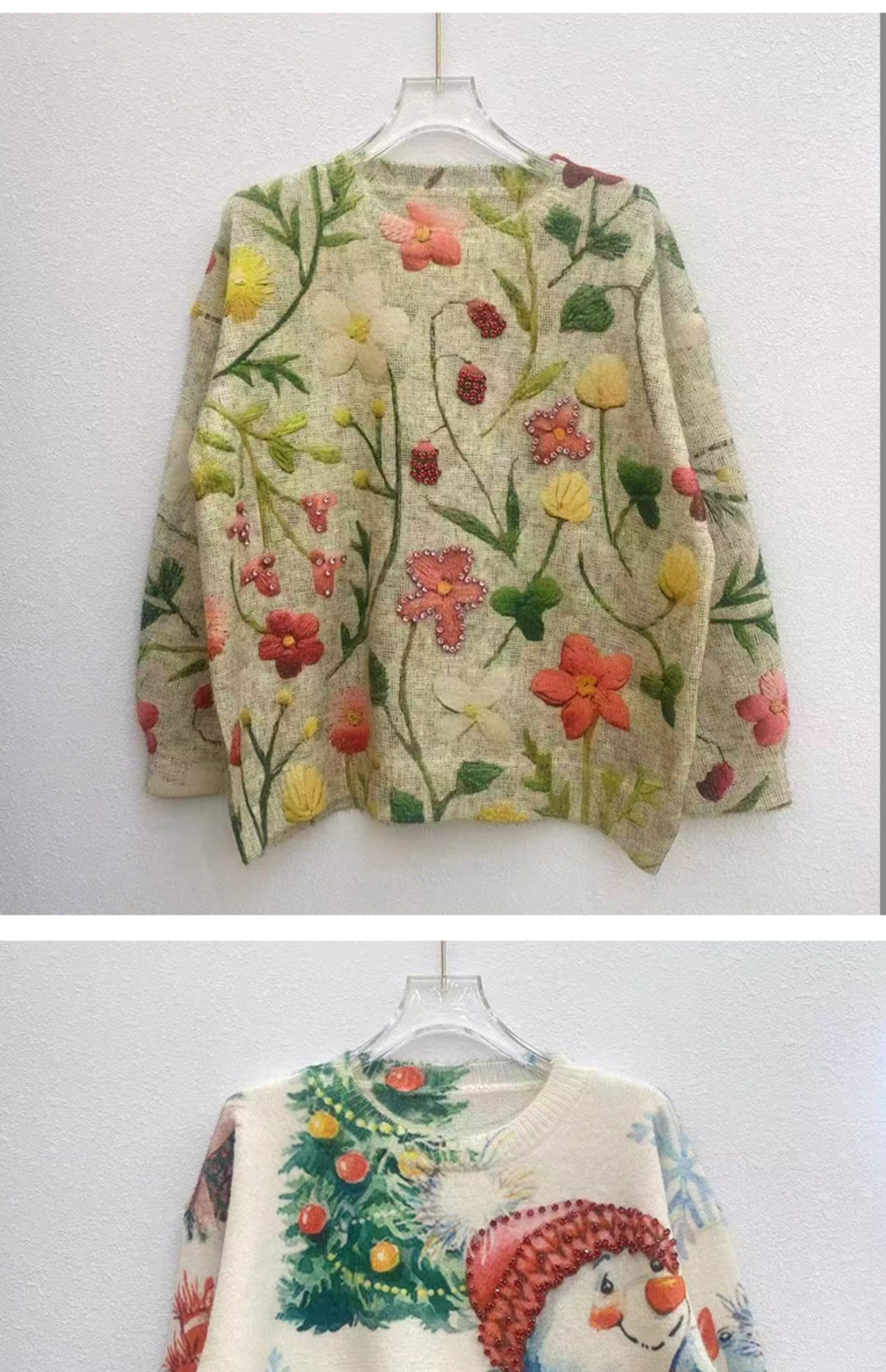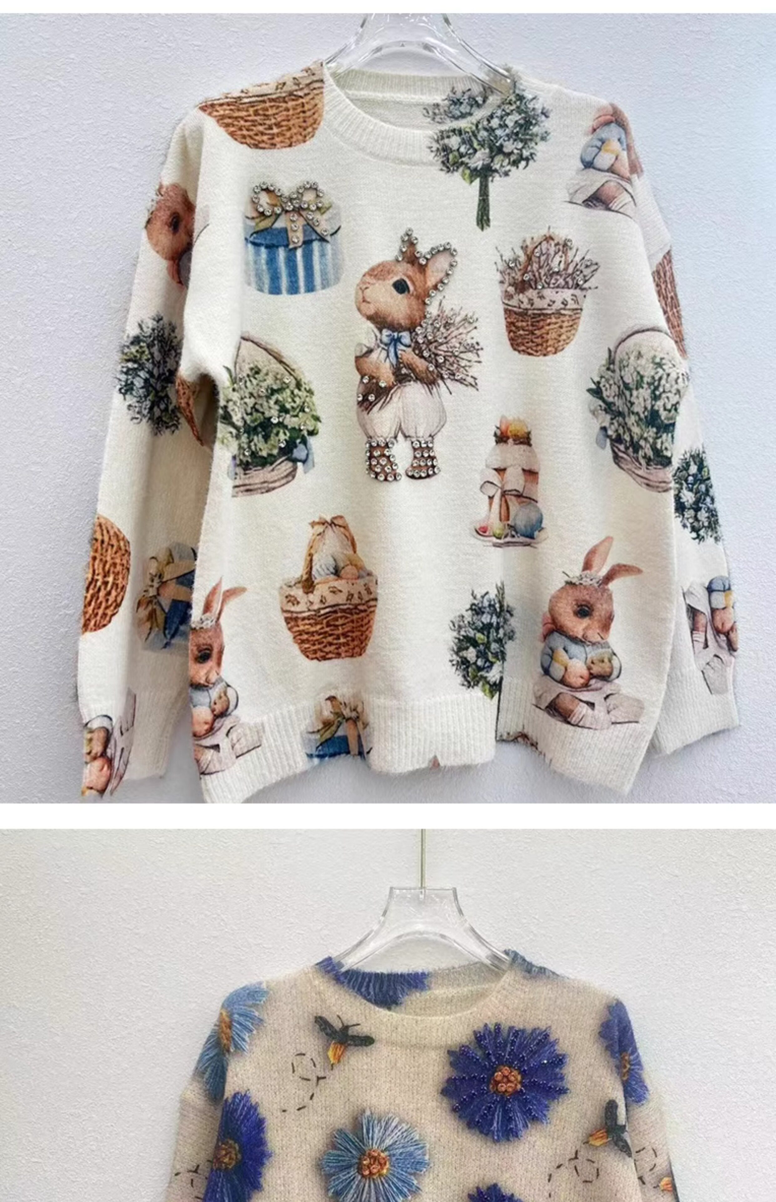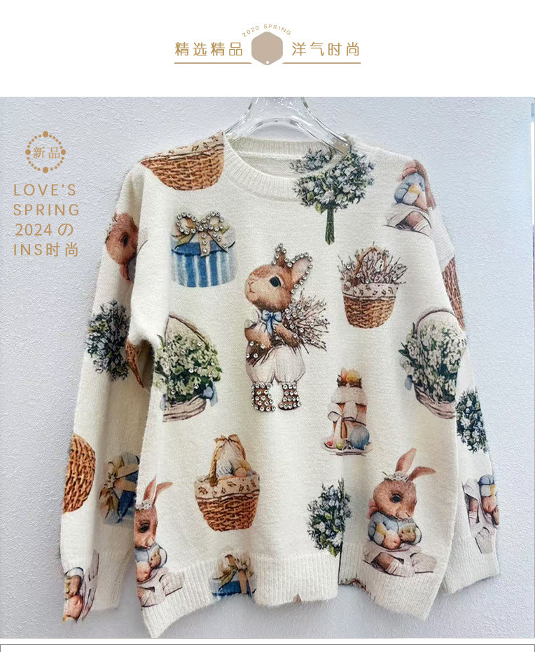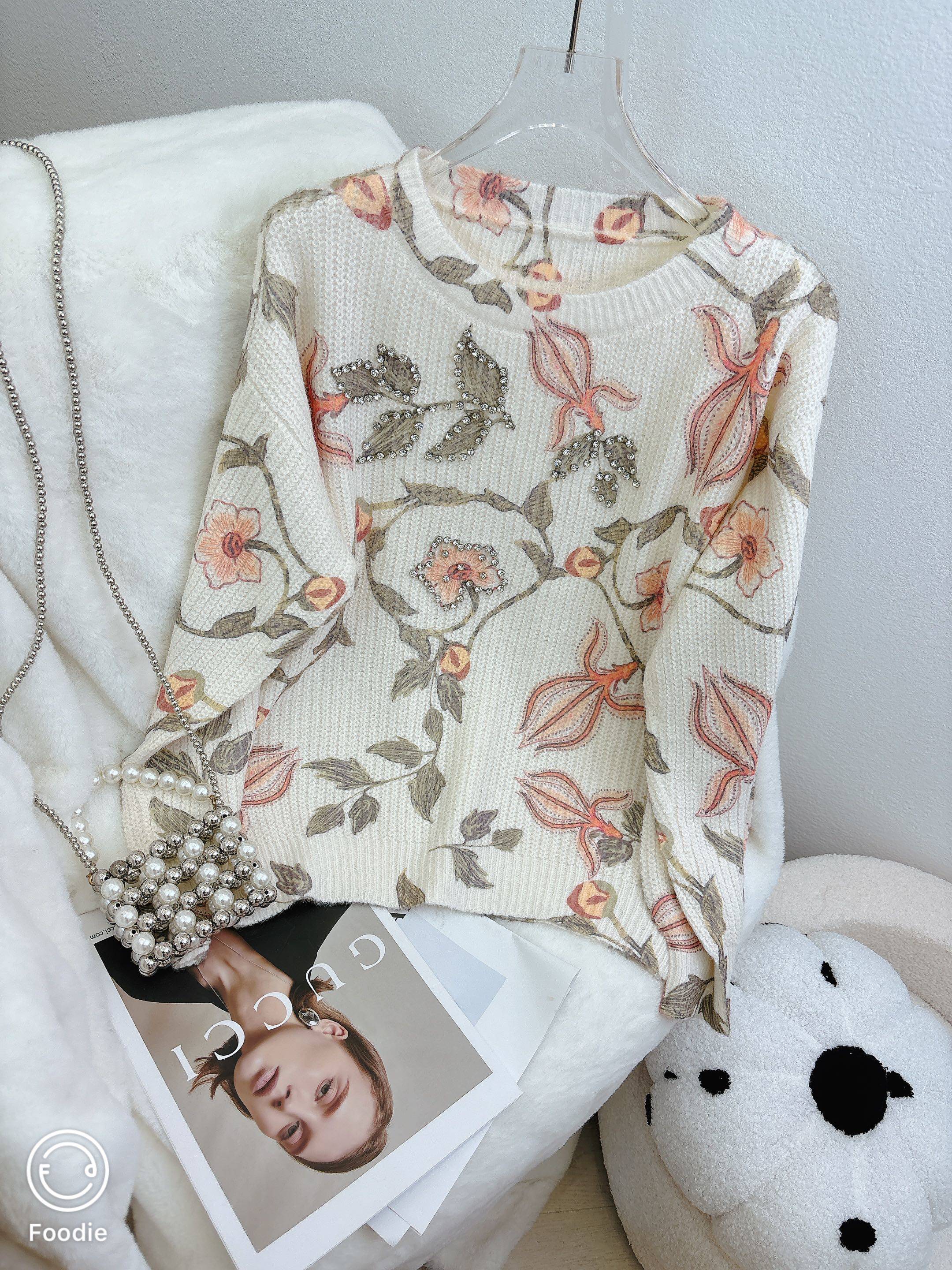 重工釘珠印花減齡毛衣女裝上衣 秋冬新款圓領慵懶風針織衫打底衫