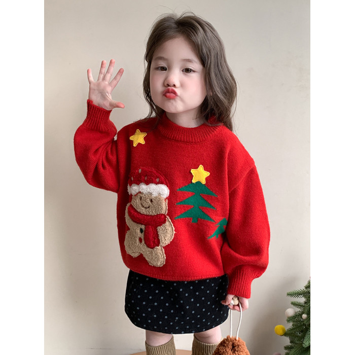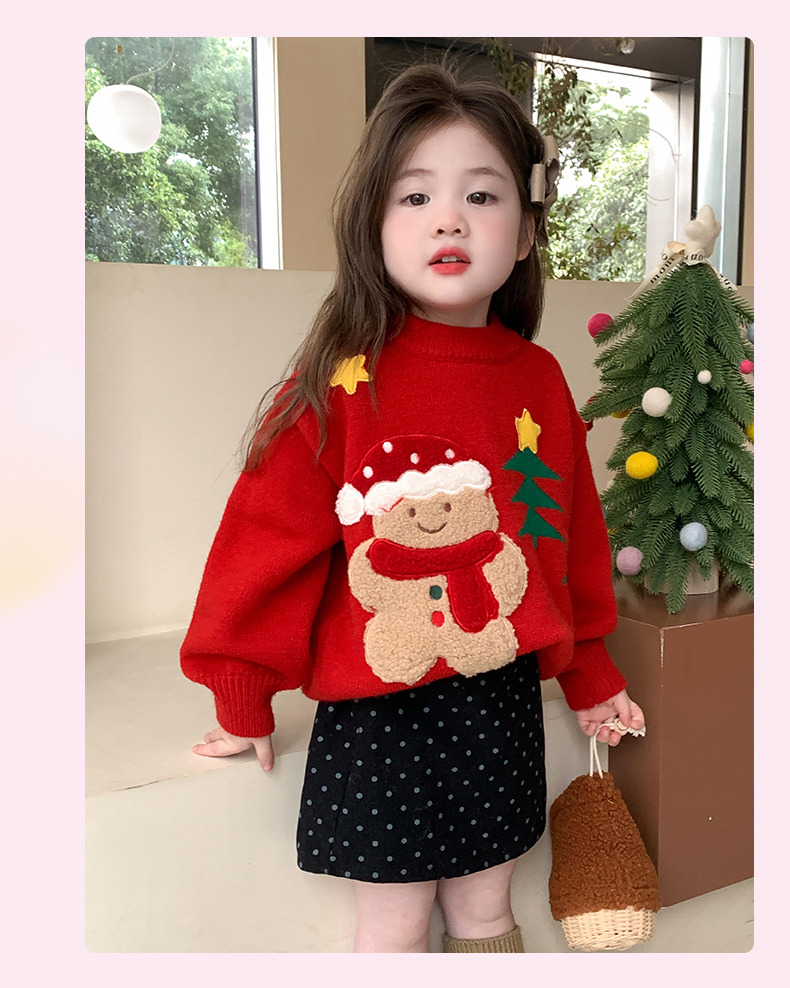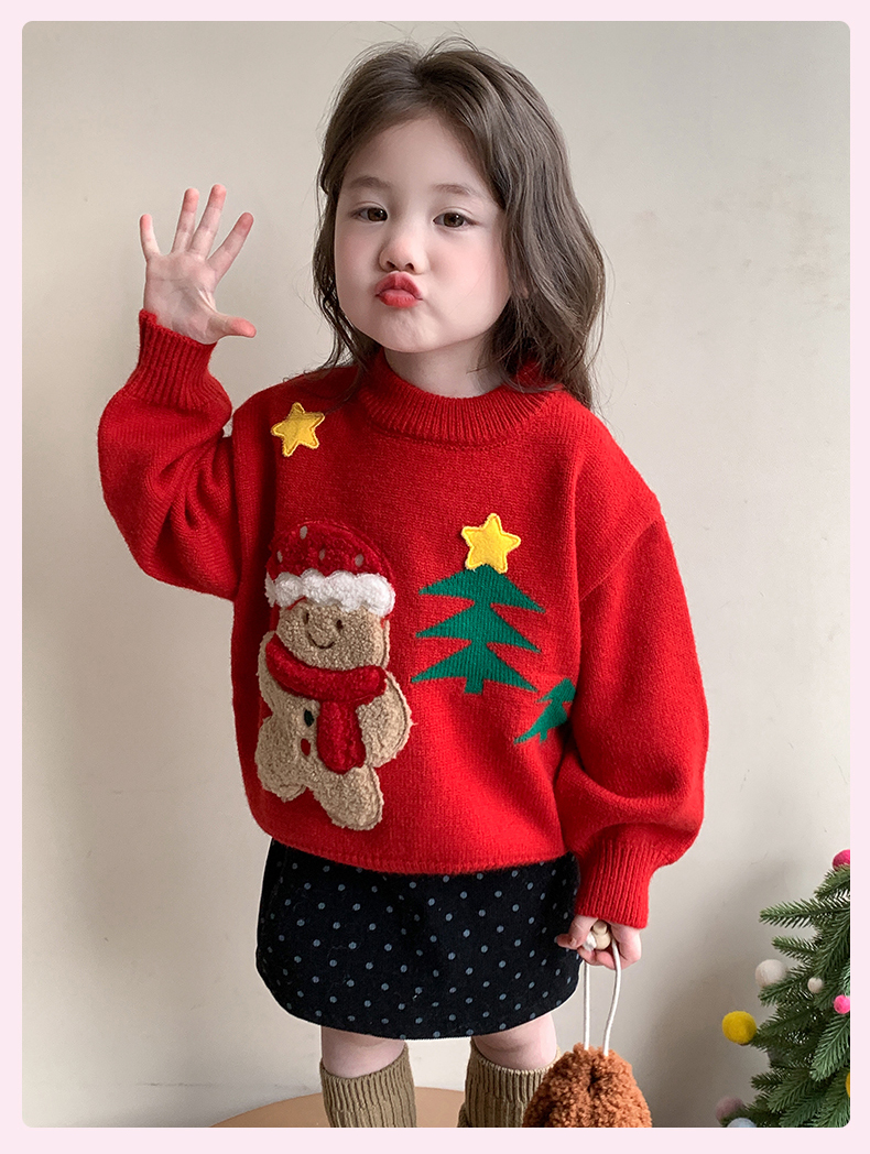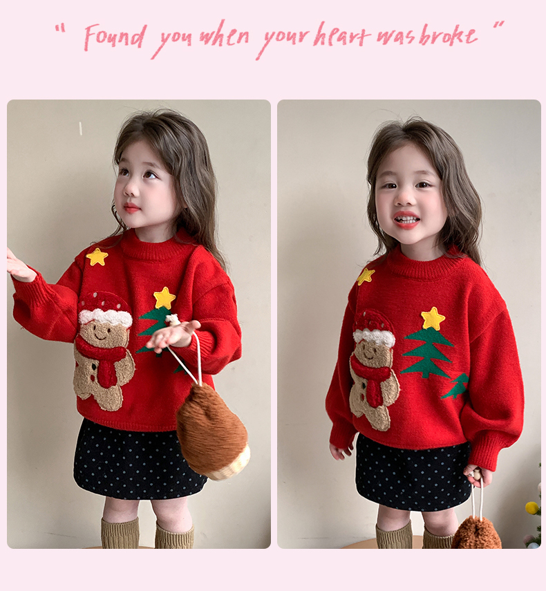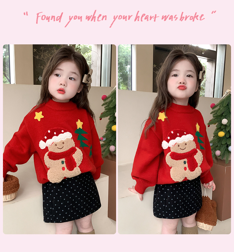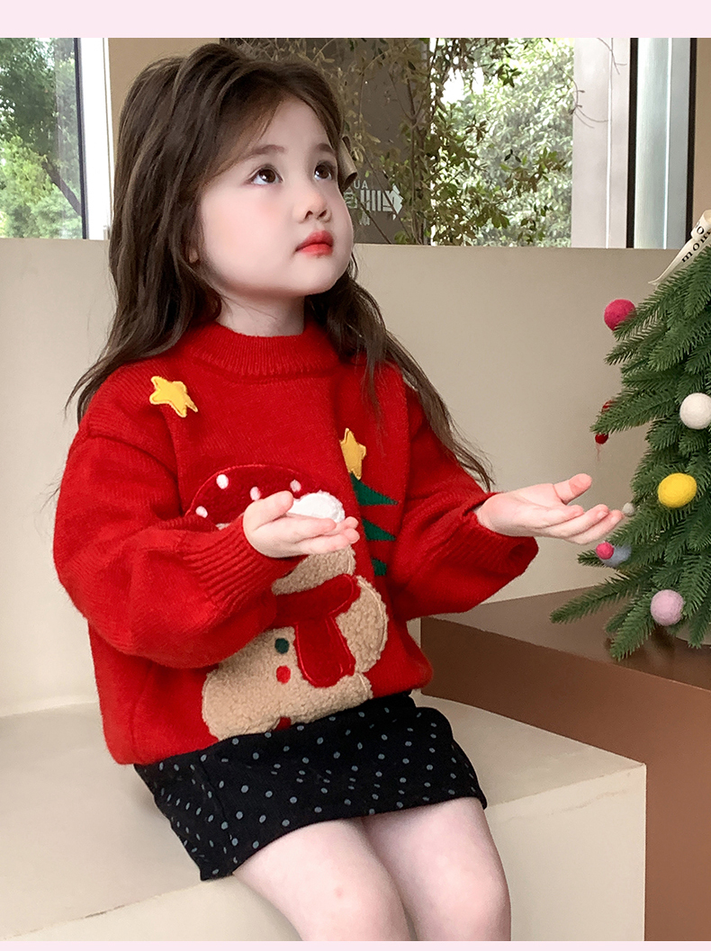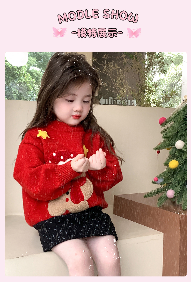 女小童聖誕加厚毛衣冬季女寶寶保暖針織上衣冬裝小女孩紅色打底衫