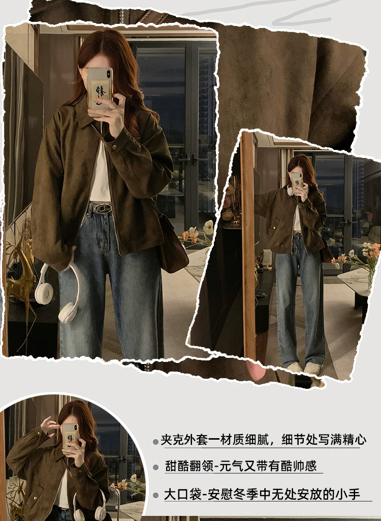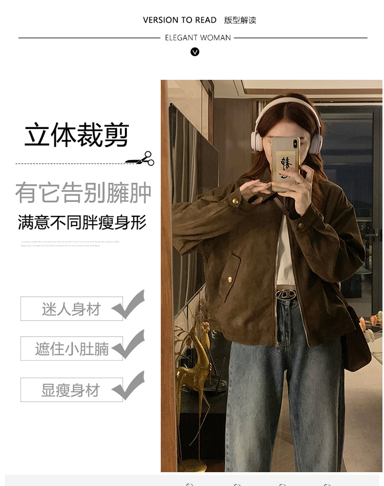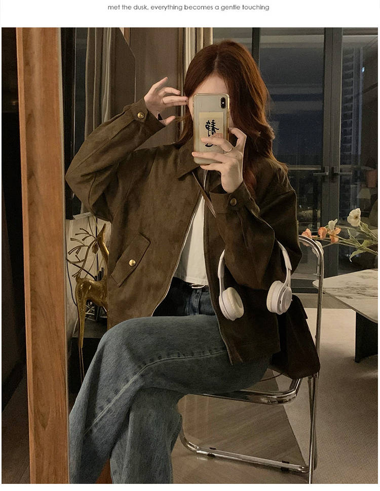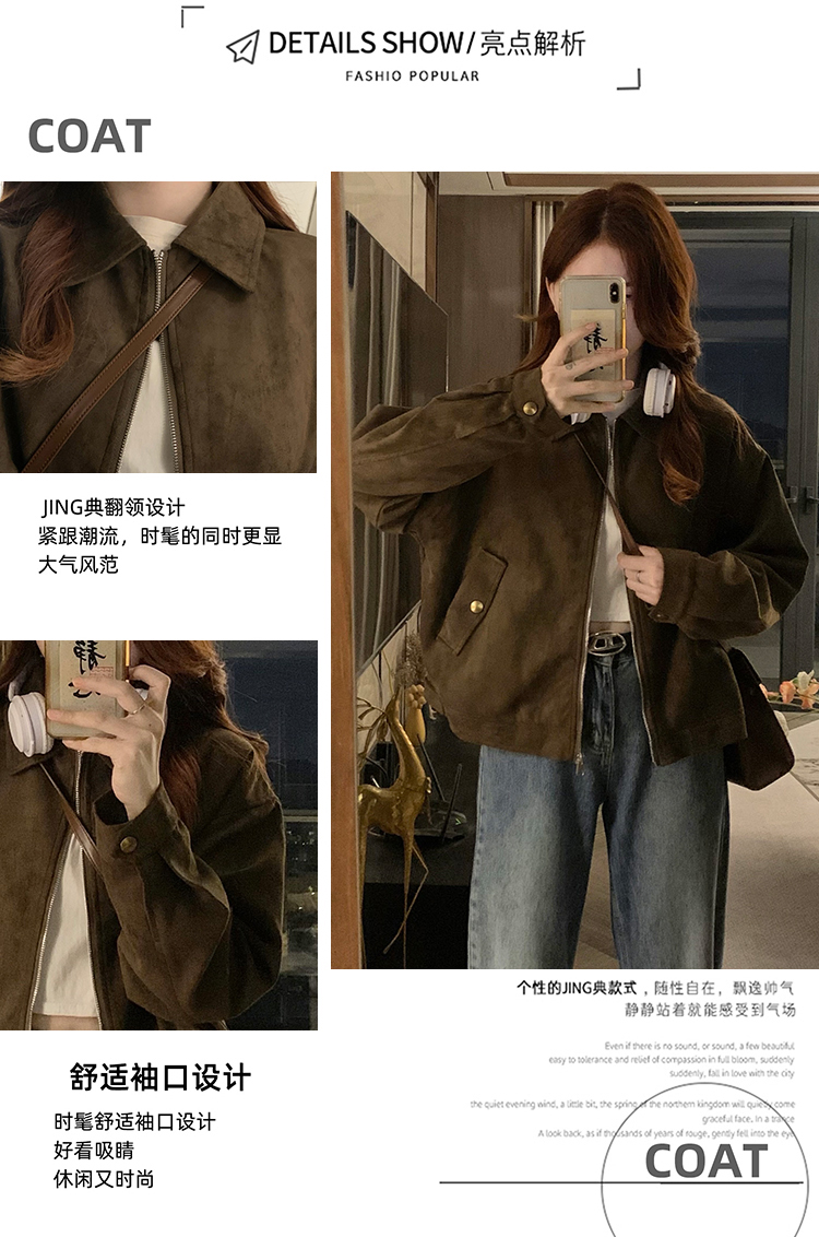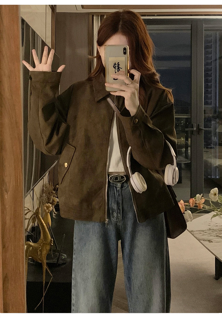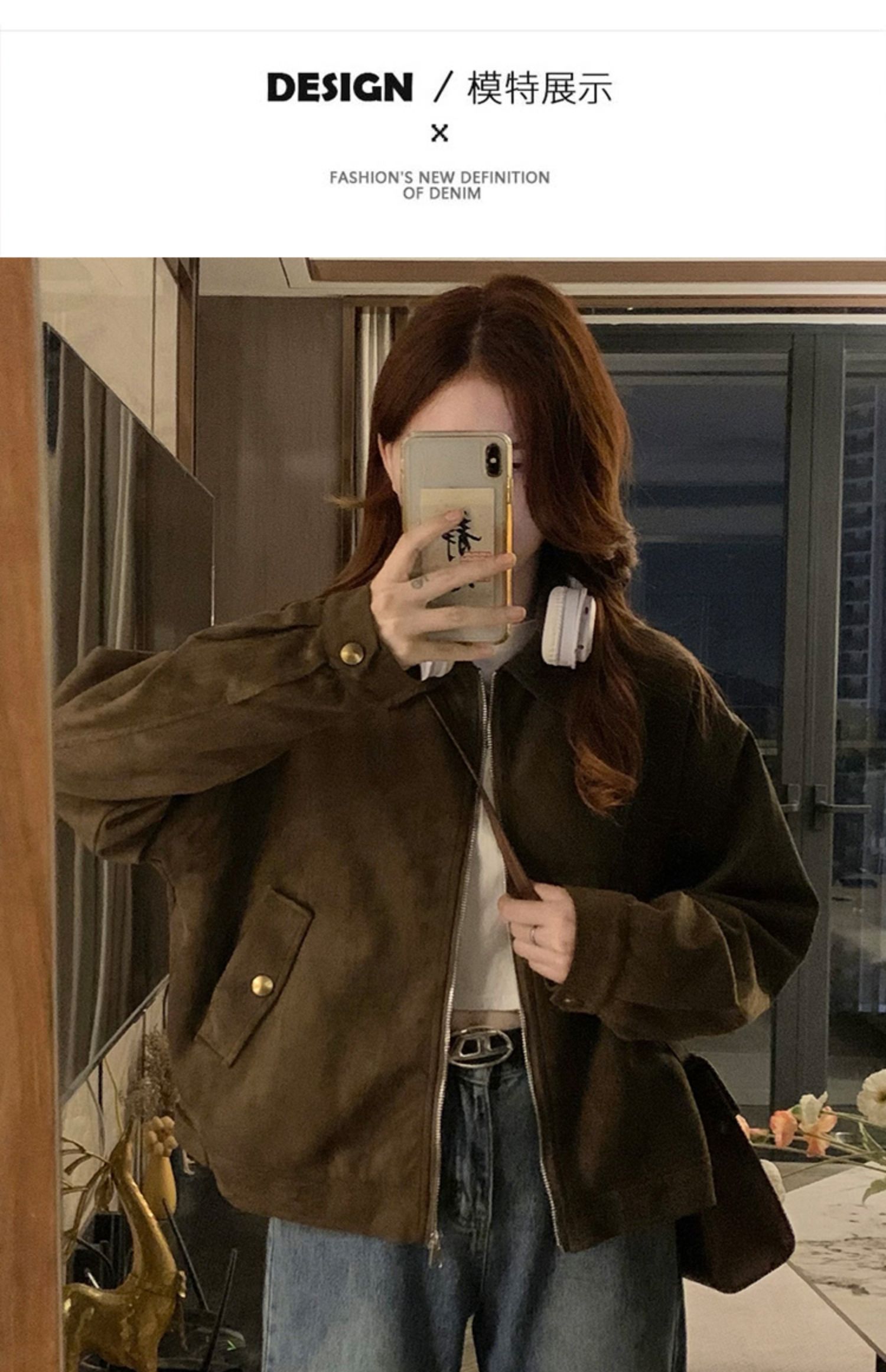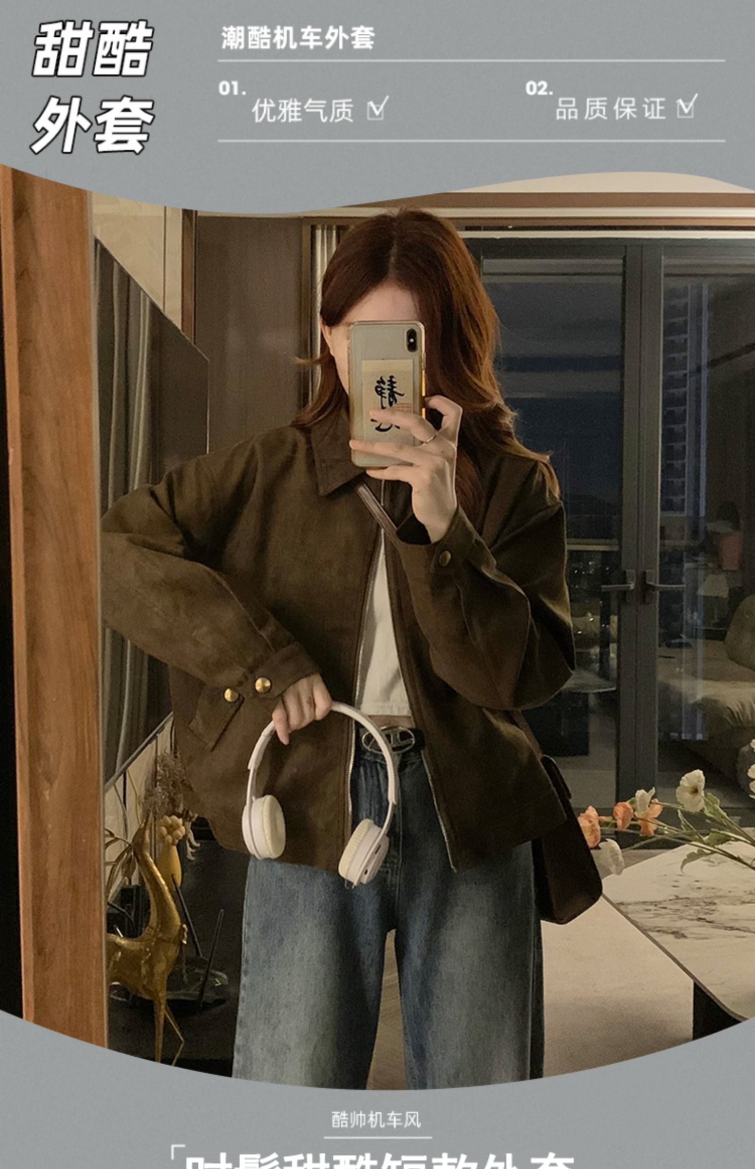 甜酷咖色麂皮絨外套女春秋新款復古小衆短款美拉德上衣夾克小個子