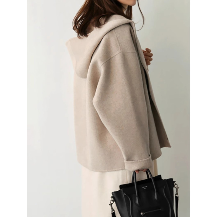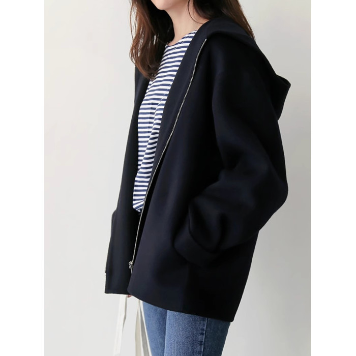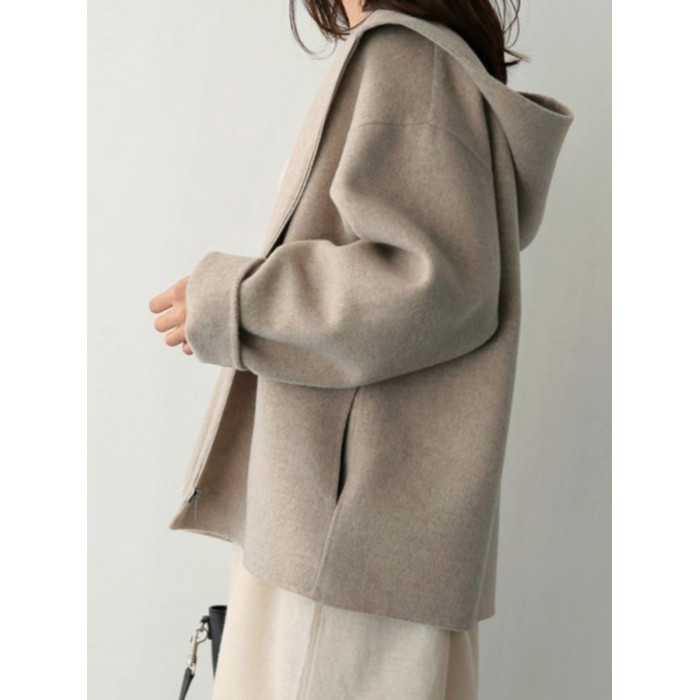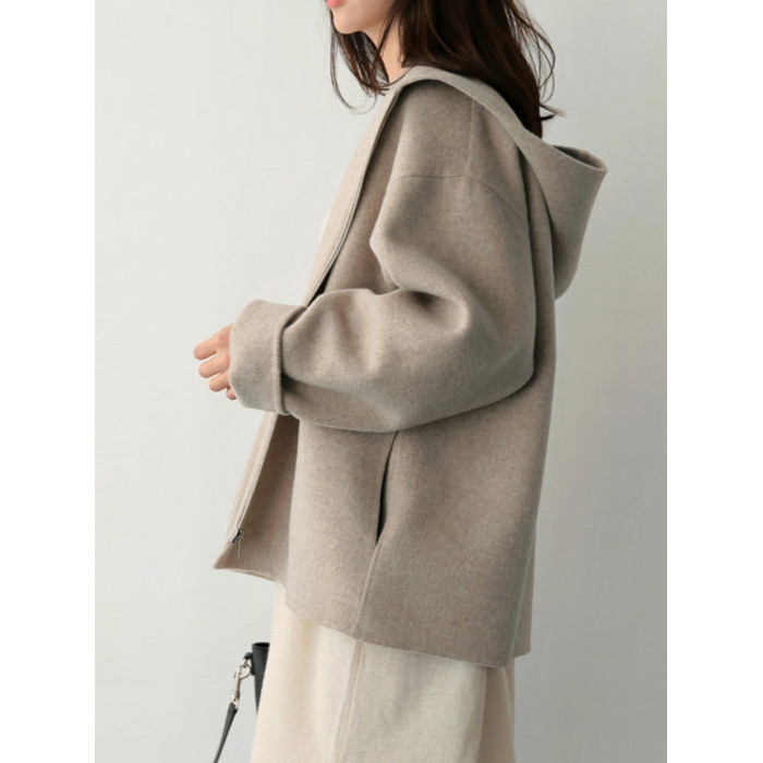 短款寬松大碼連帽毛呢外套女秋冬拉鍊純色小個子百搭呢子大衣