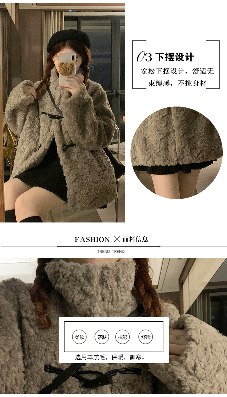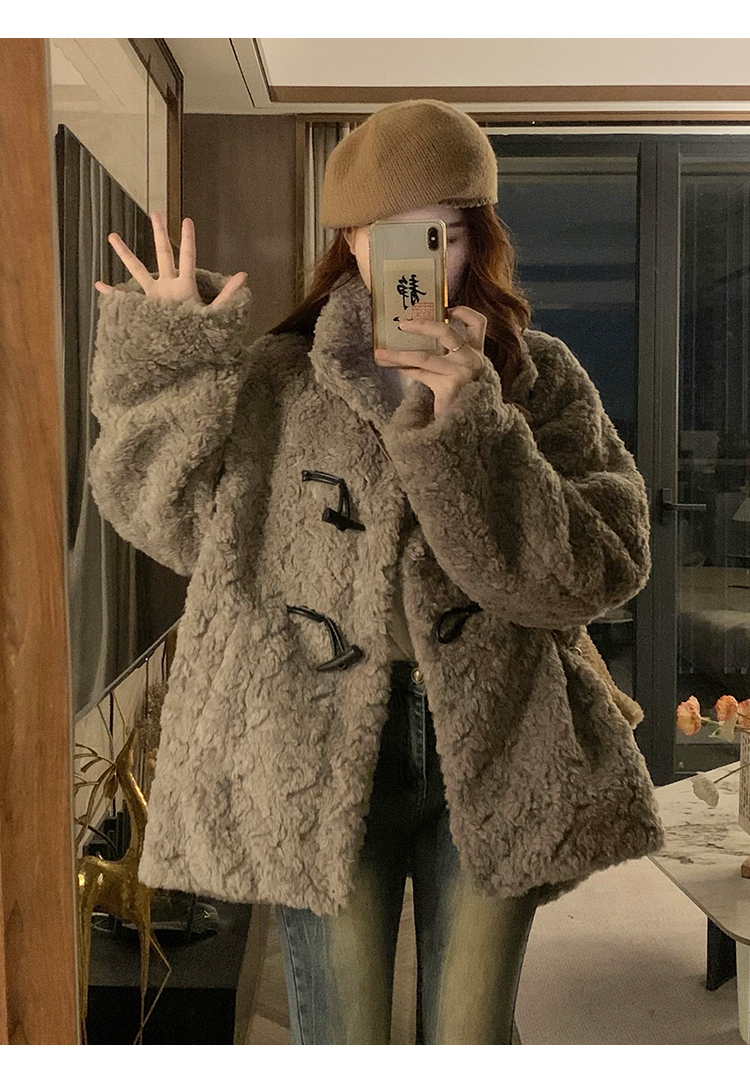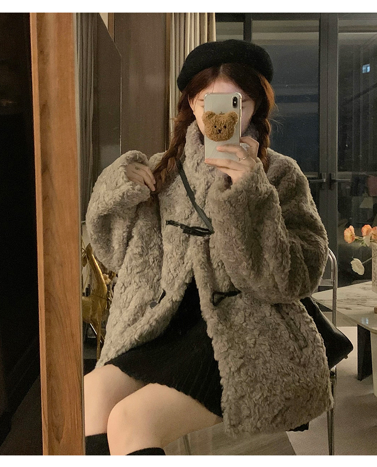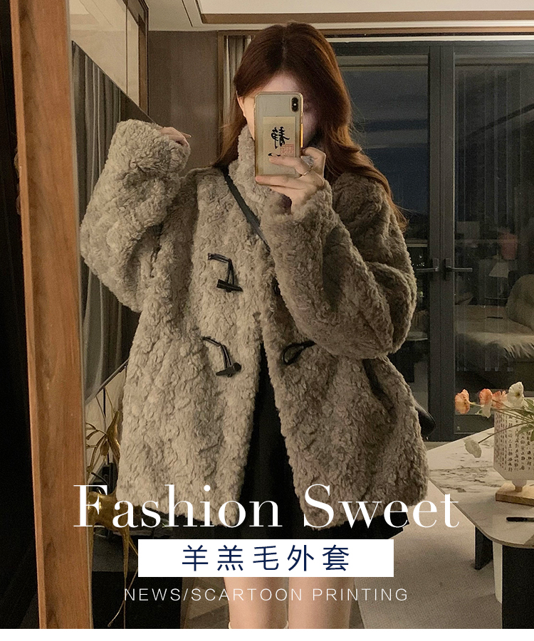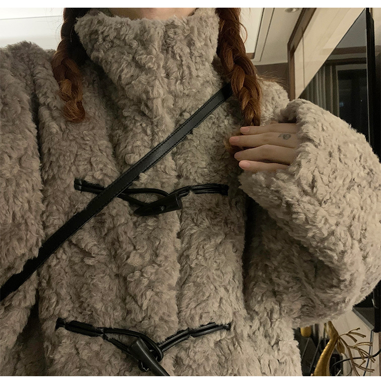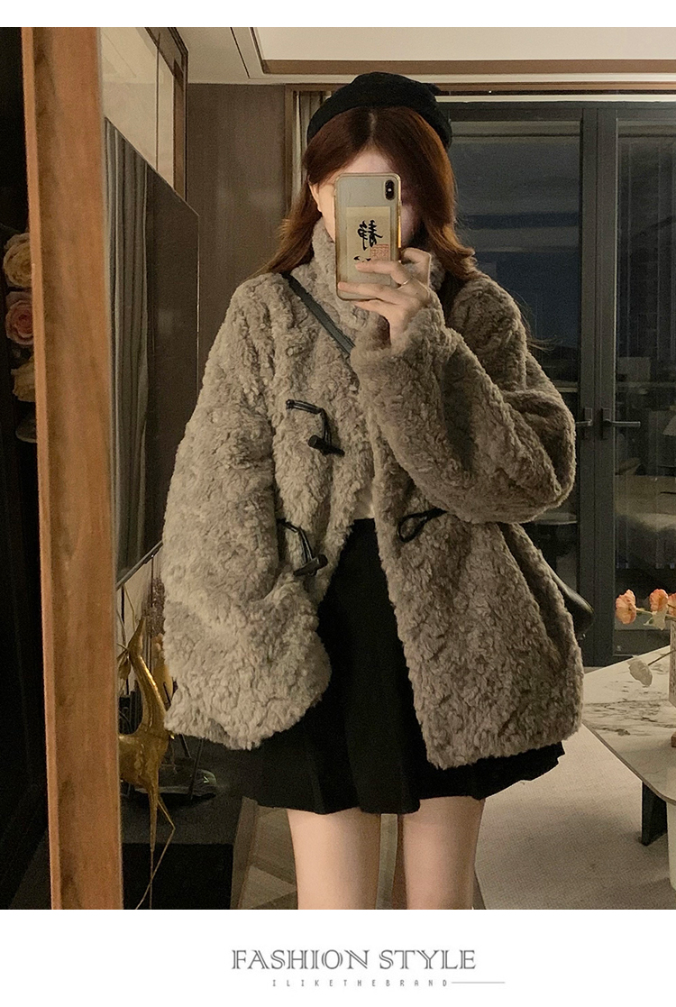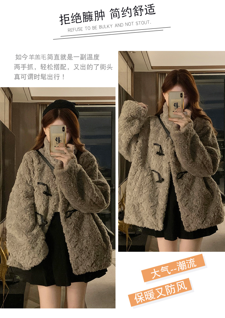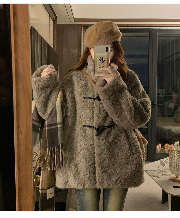 冬季立領羊羔毛外套女加厚寬松高級感毛絨茸茸皮草一體牛角釦棉服