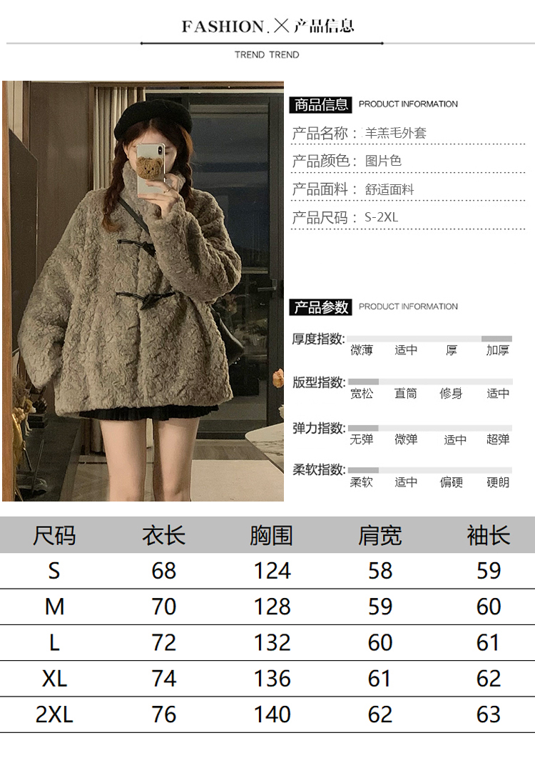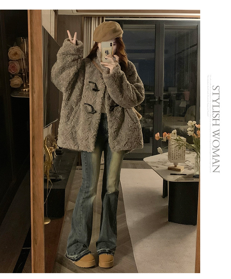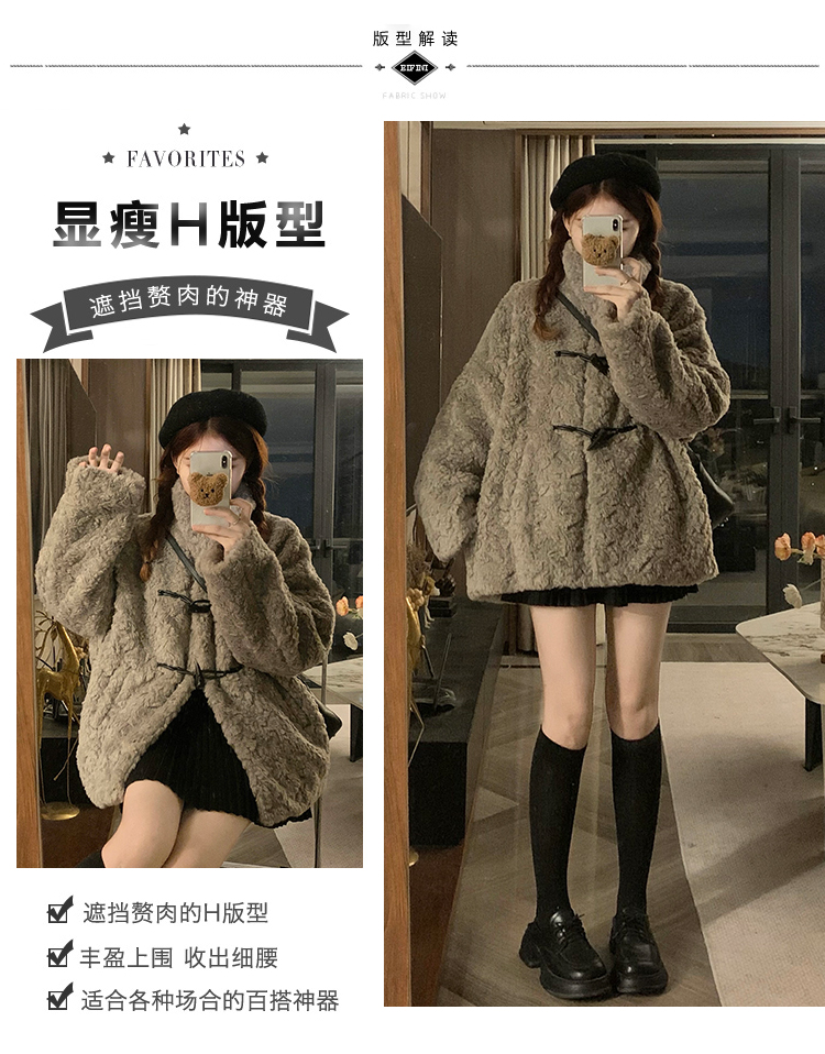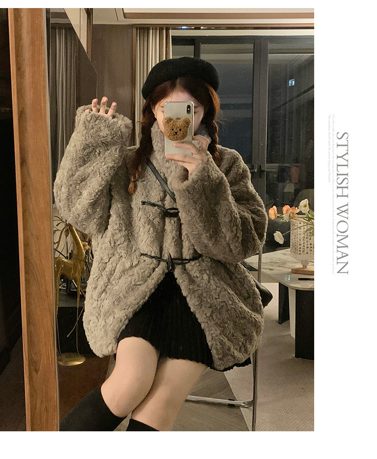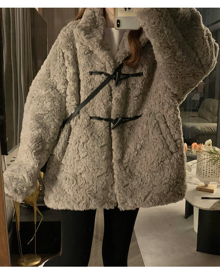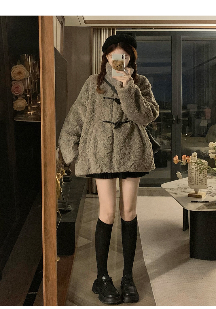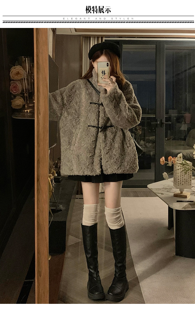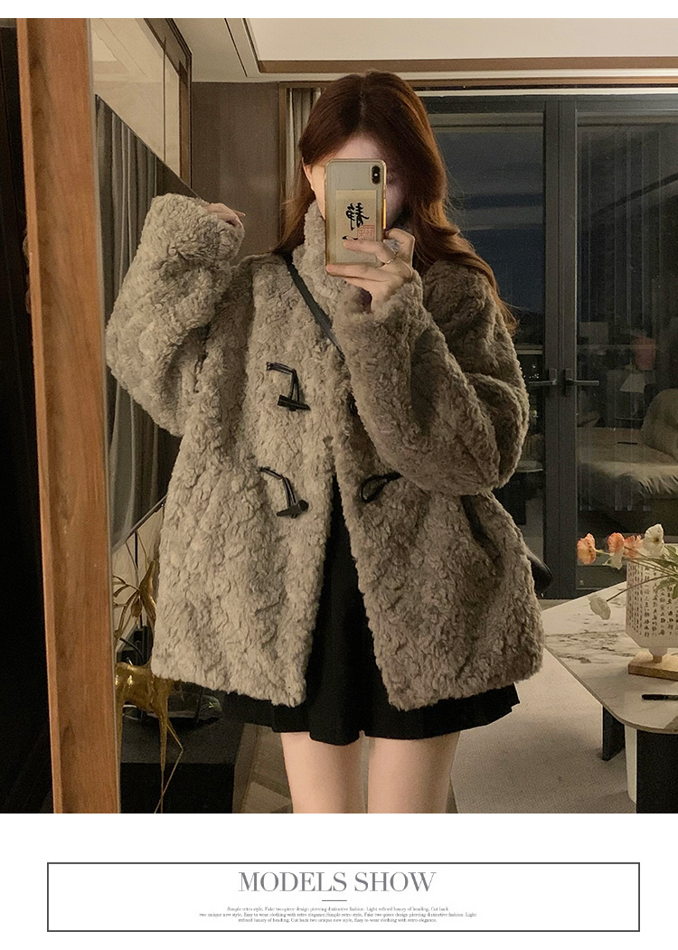 冬季立領羊羔毛外套女加厚寬松高級感毛絨茸茸皮草一體牛角釦棉服