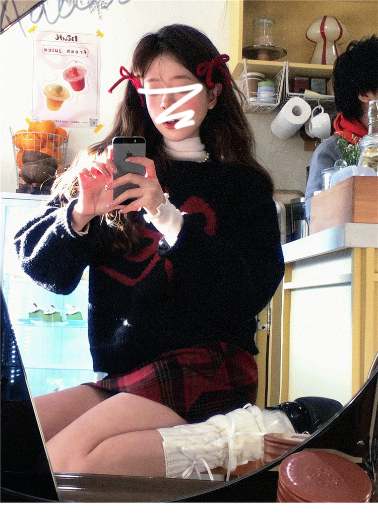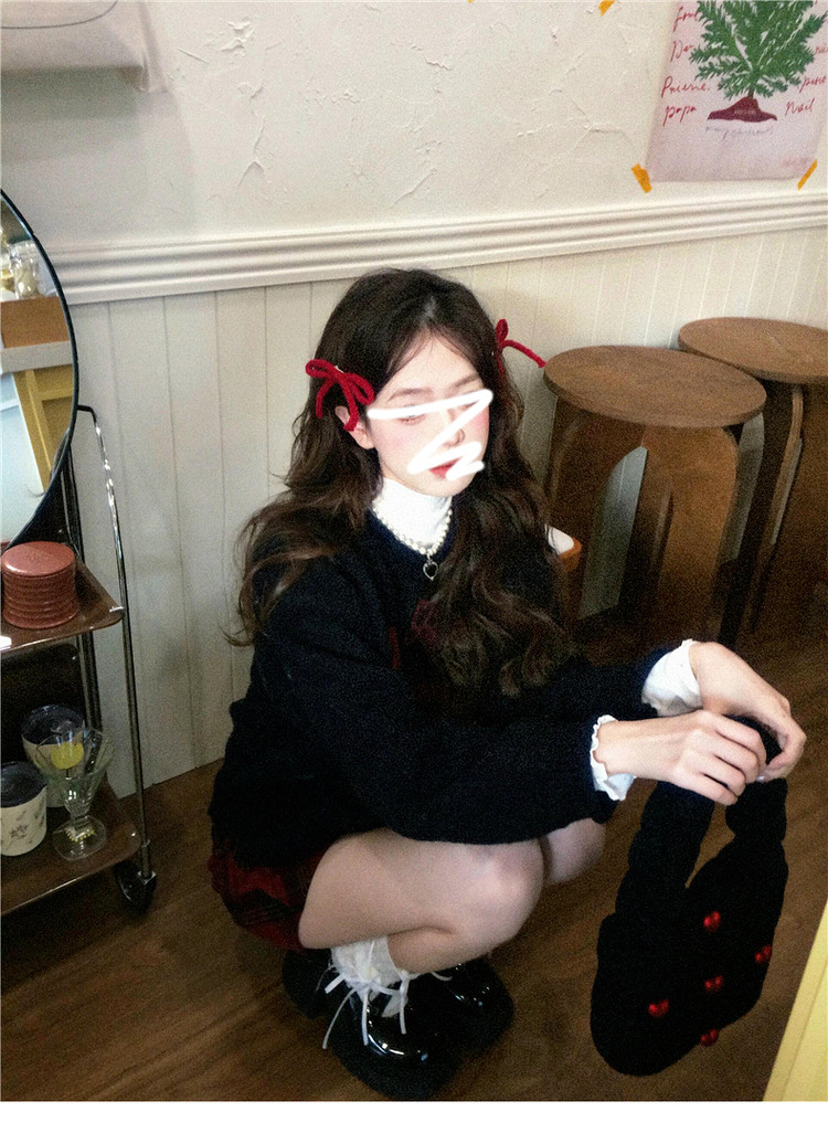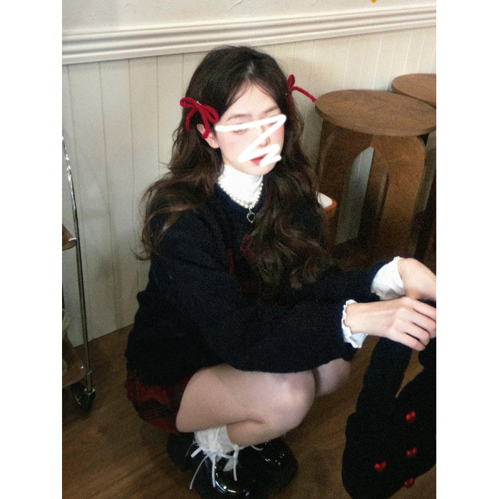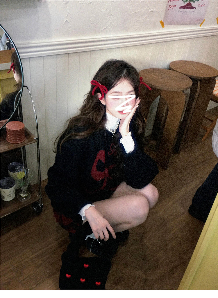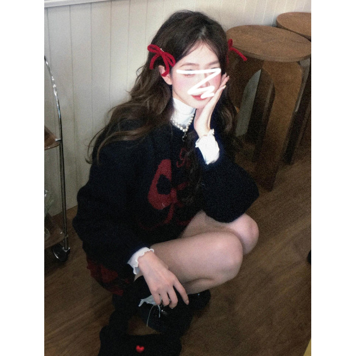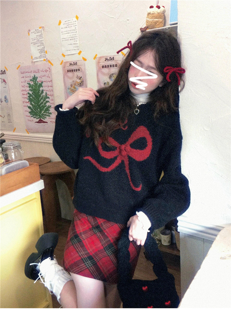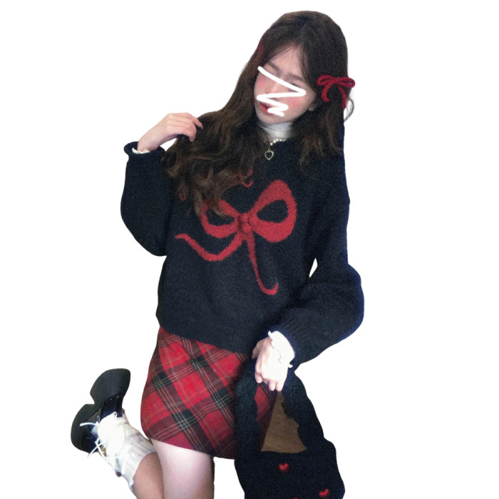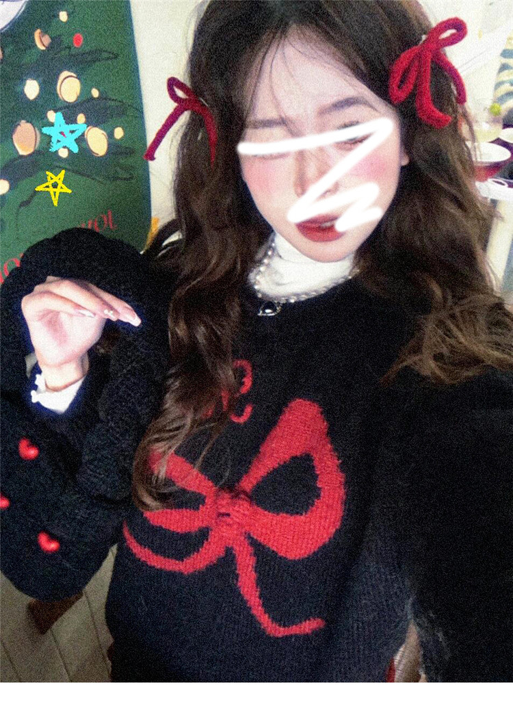 美式復古黑色蝴蝶結套頭毛衣女秋冬2026新款加厚保暖內搭針織上衣
