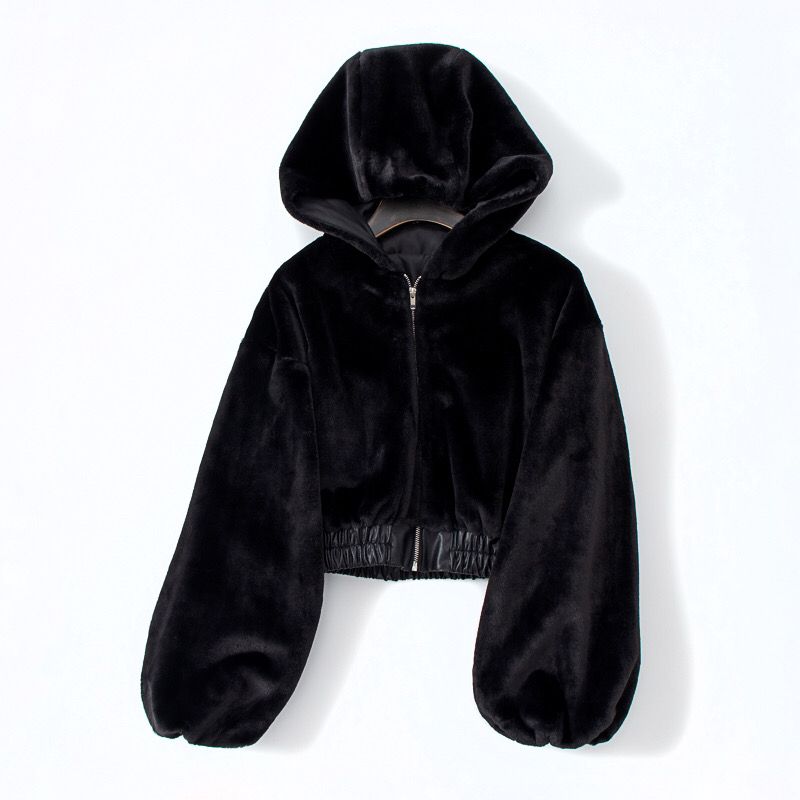 2025春秋新款可愛毛毛絨收腰高級感保暖短款加厚連帽毛茸茸外套女