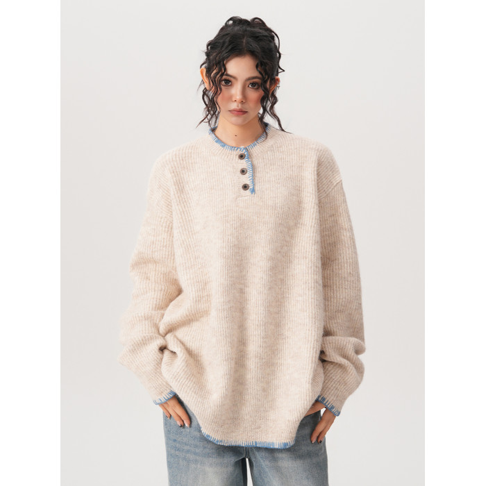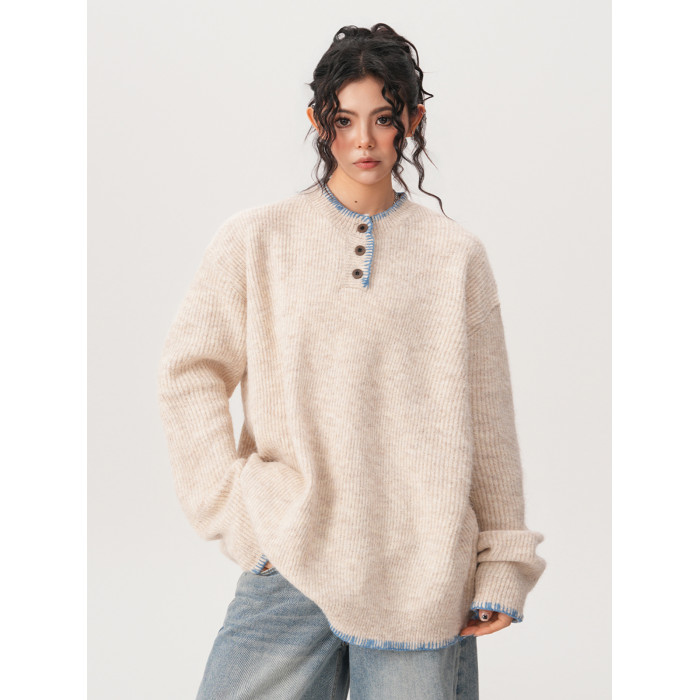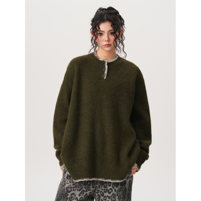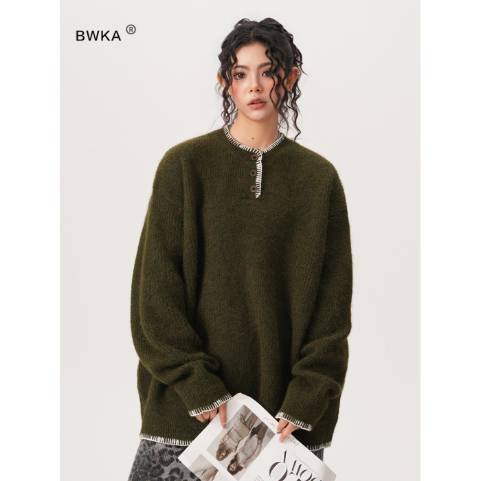 BWKA小衆設計感亨利領針織衫女男秋冬復古氛圍感寬鬆套頭毛衣情侶