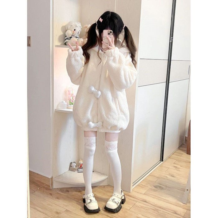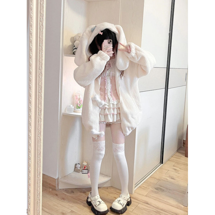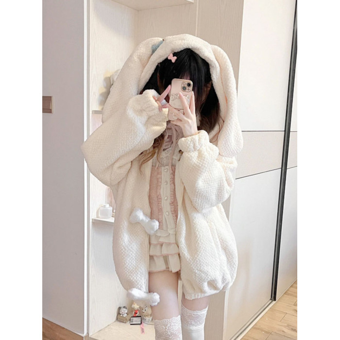 美式復古兔耳朵連帽外套女秋冬寬松高級感超好看加絨加厚開衫上衣