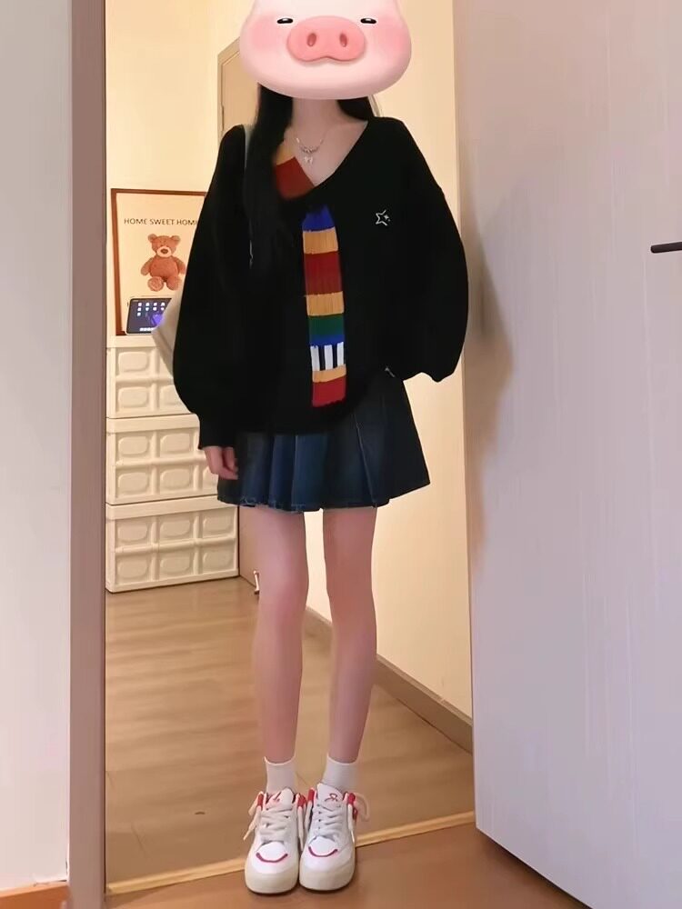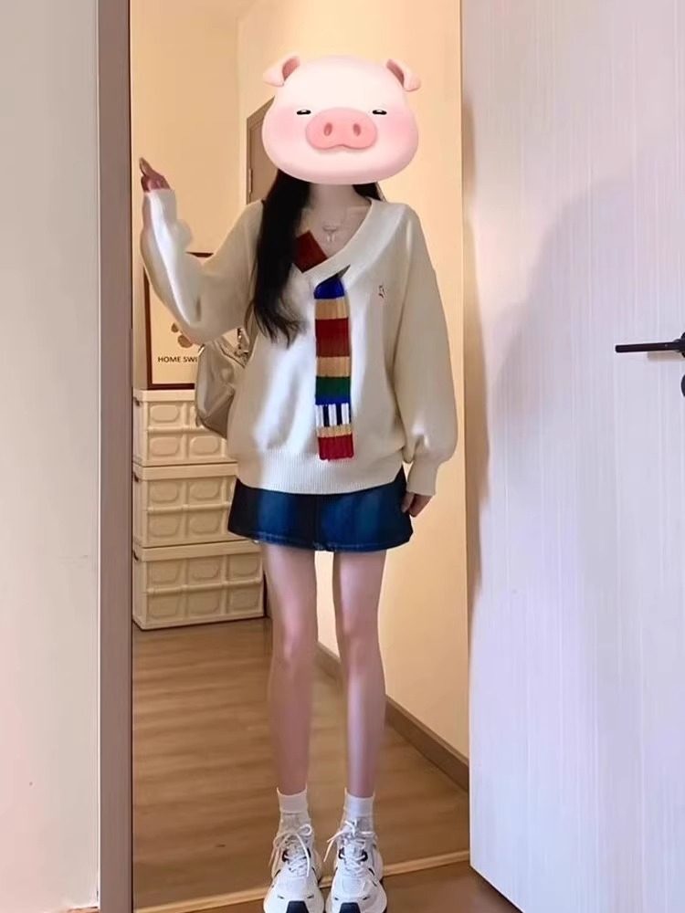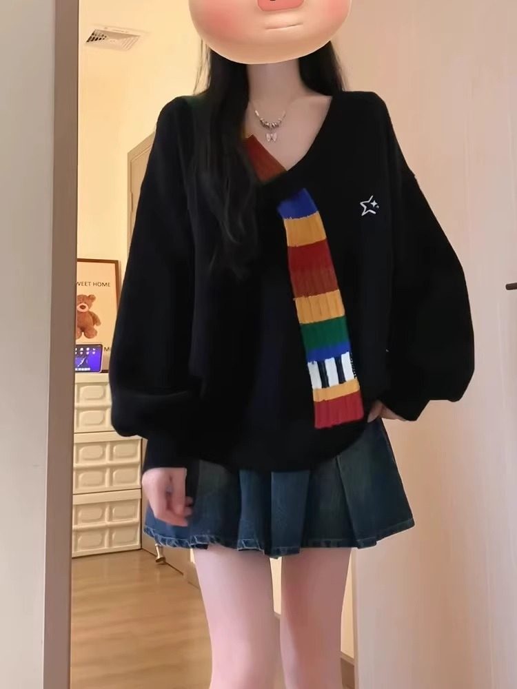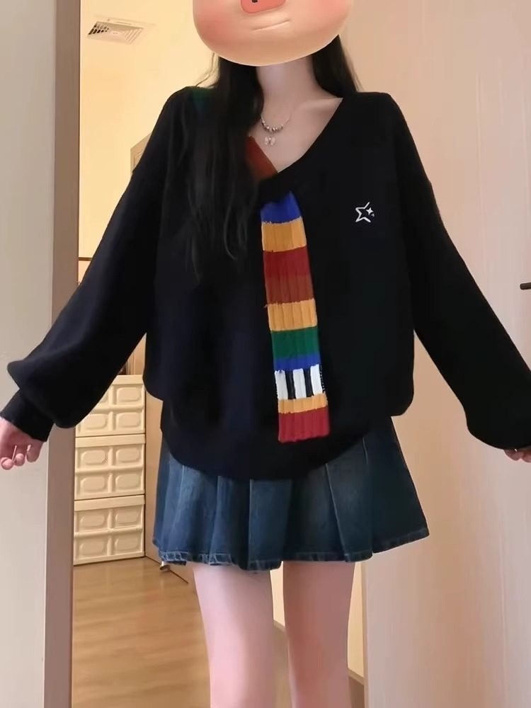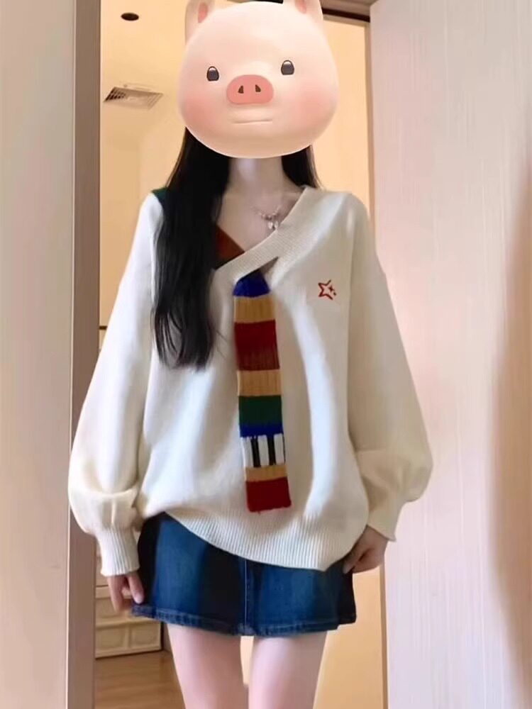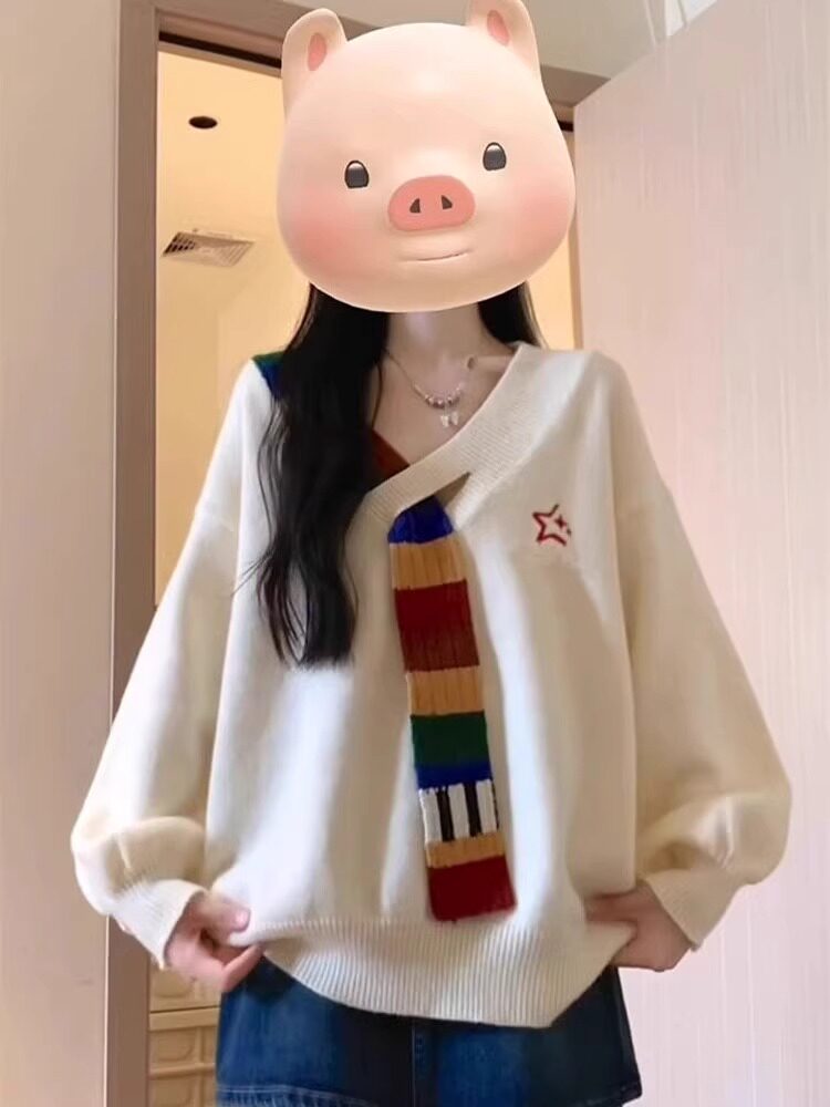 美式復古彩虹毛織拼接v領針織衫外套秋寬鬆學院風高級感女毛衣冬