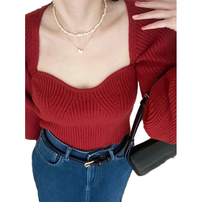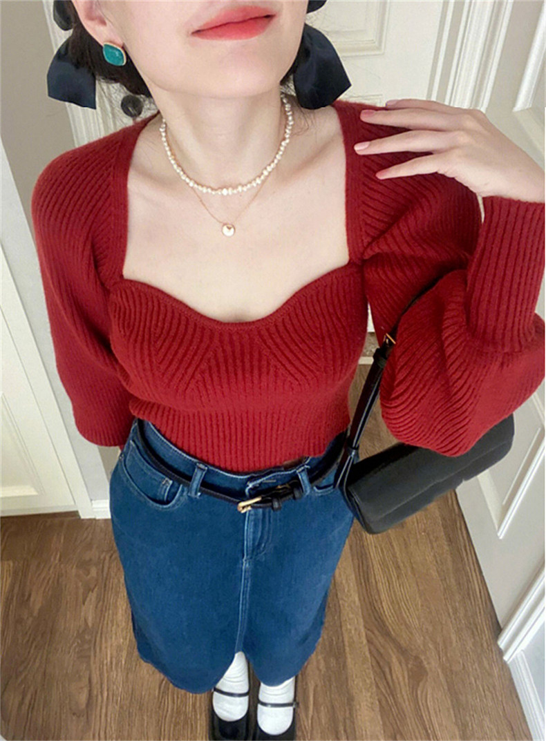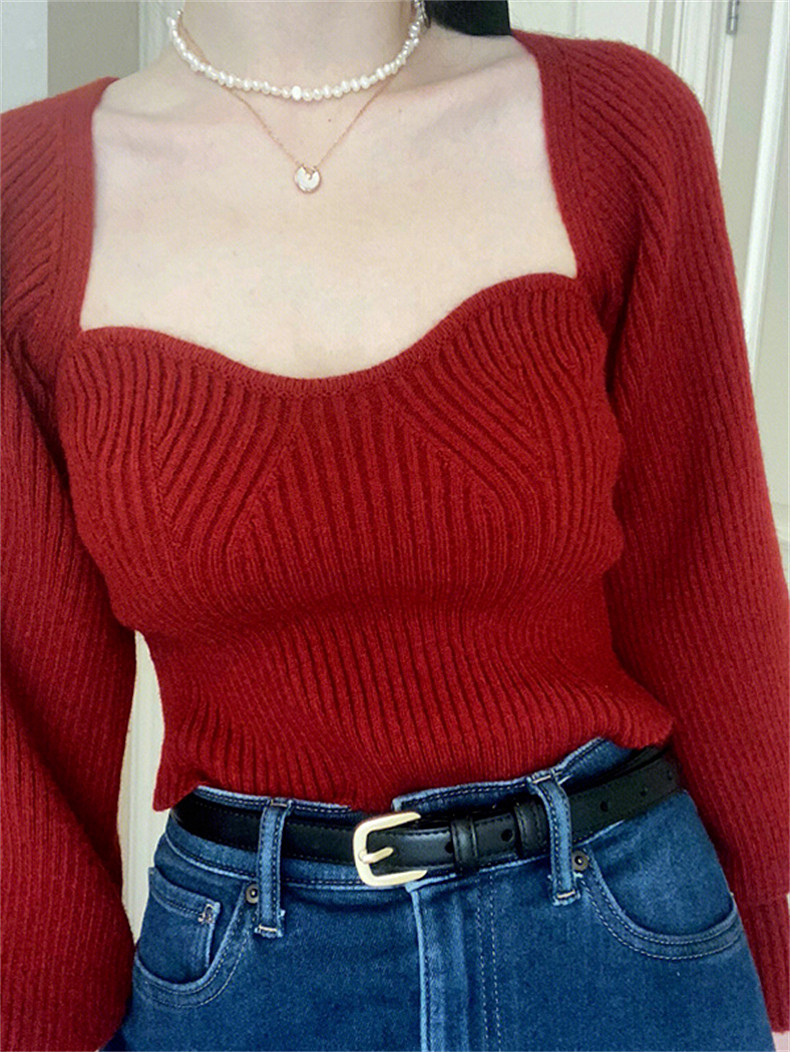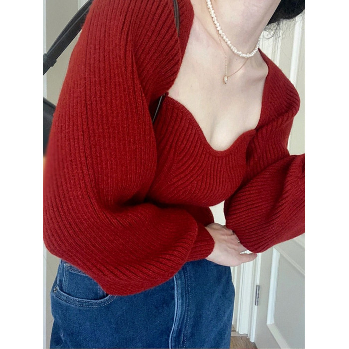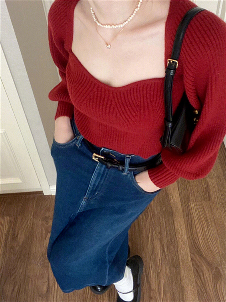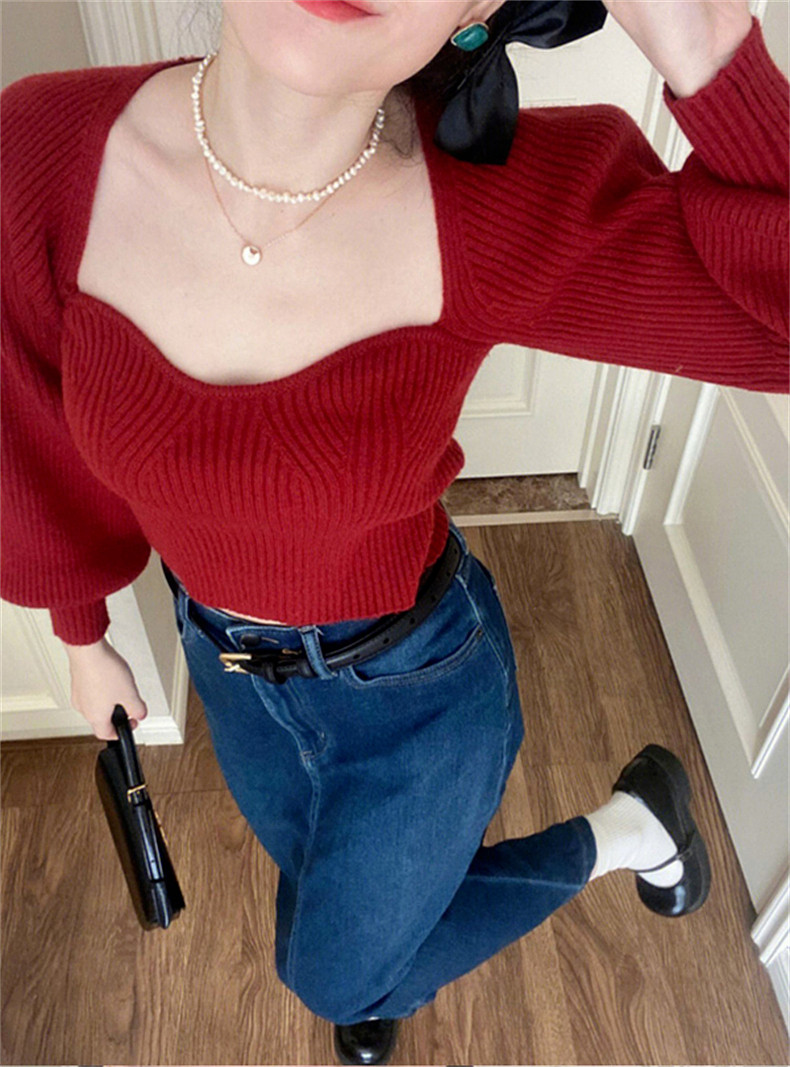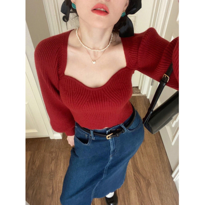 2025年新款方領短款紅色毛衣秋冬季打底內搭針織衫上衣設計感小衆