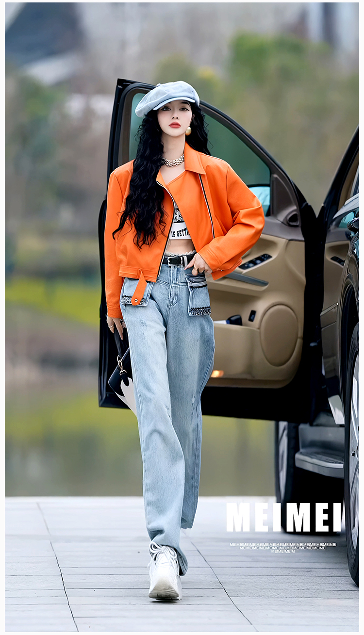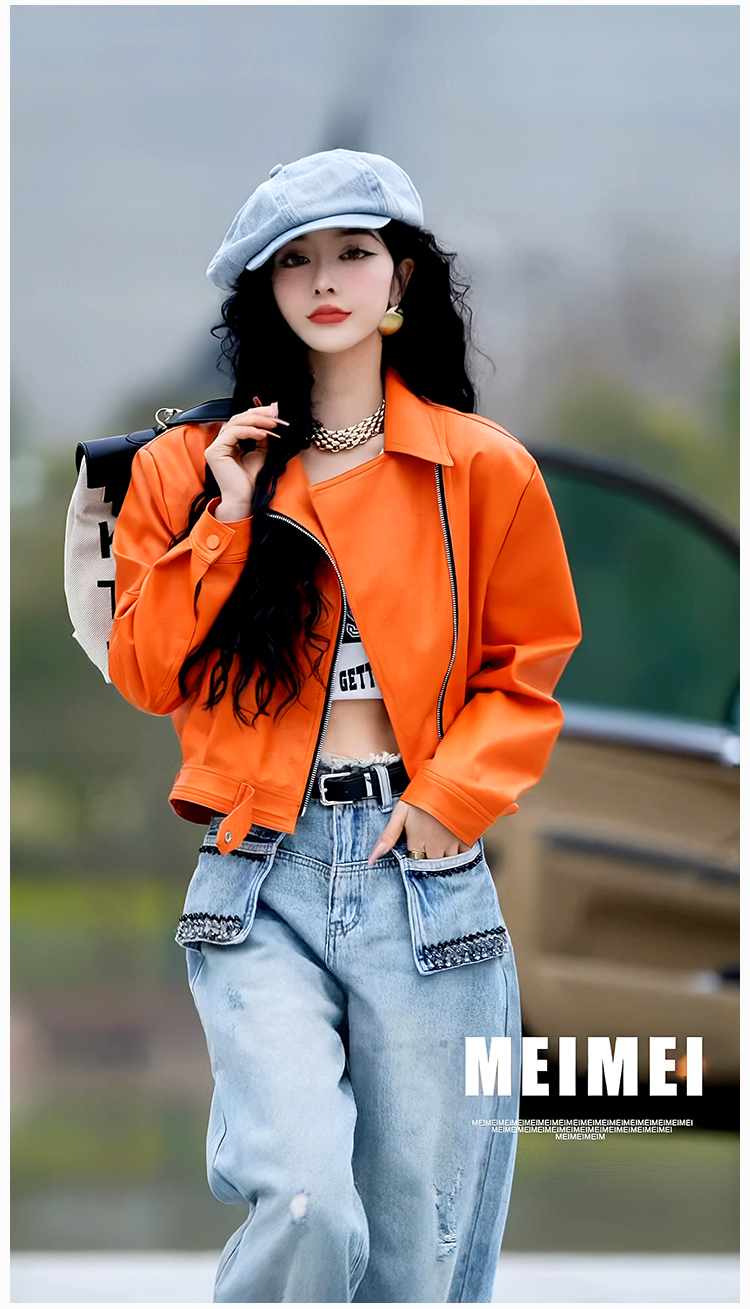 美式復古高級感超好看又a又颯炸街橘色翻領短款甜酷風皮衣外套女