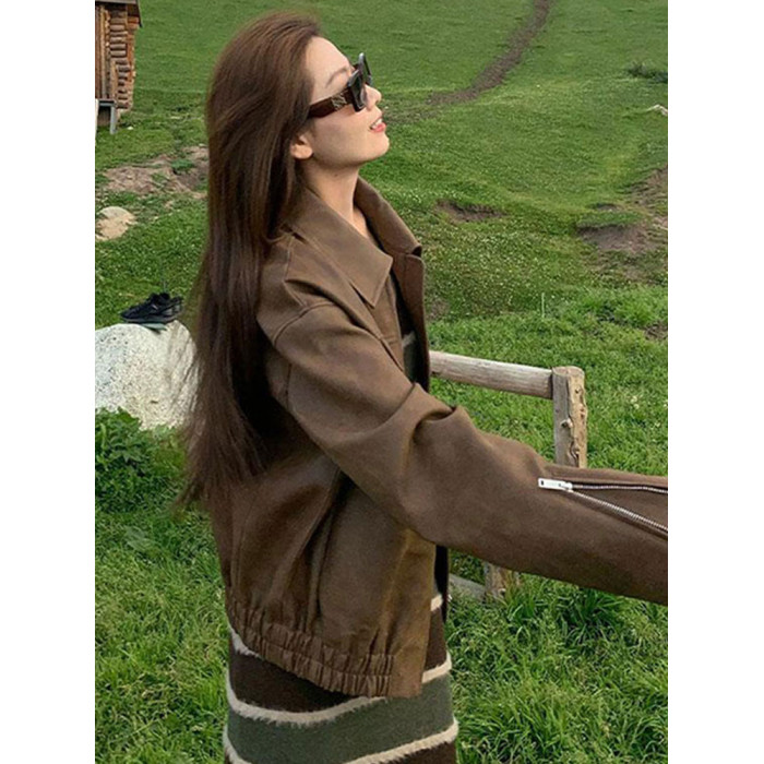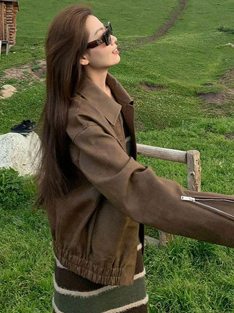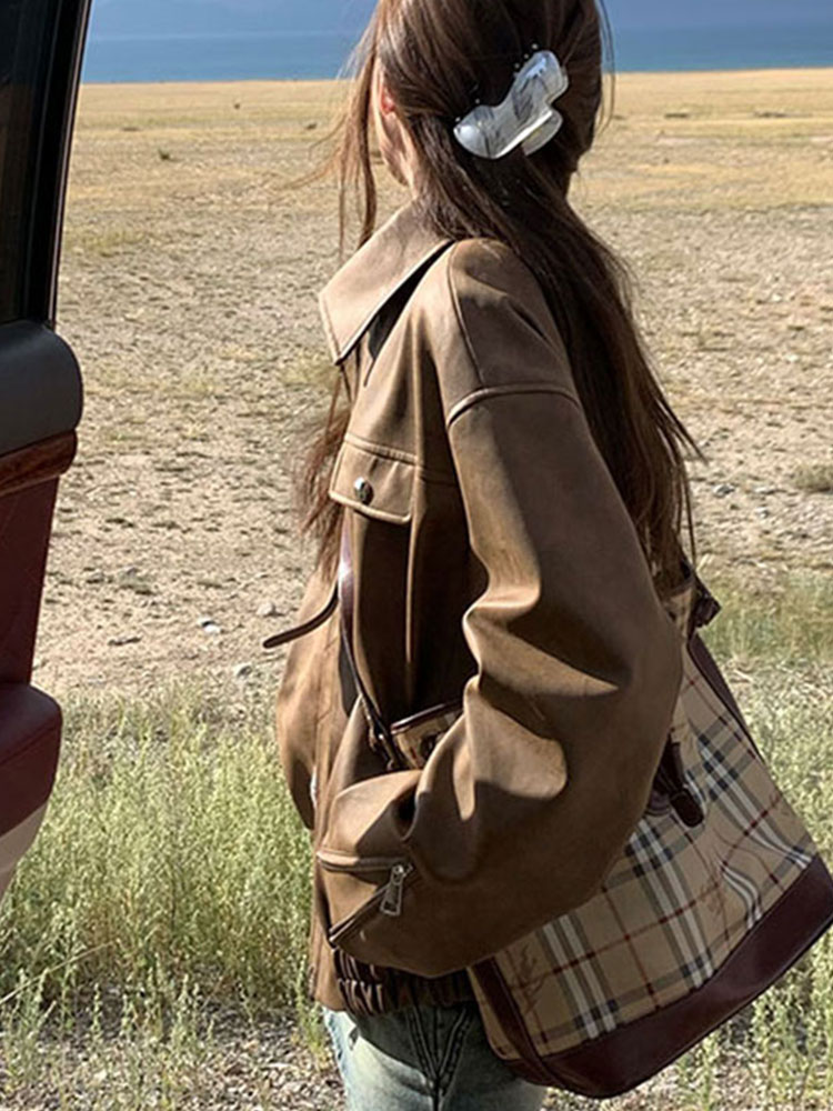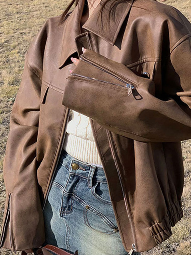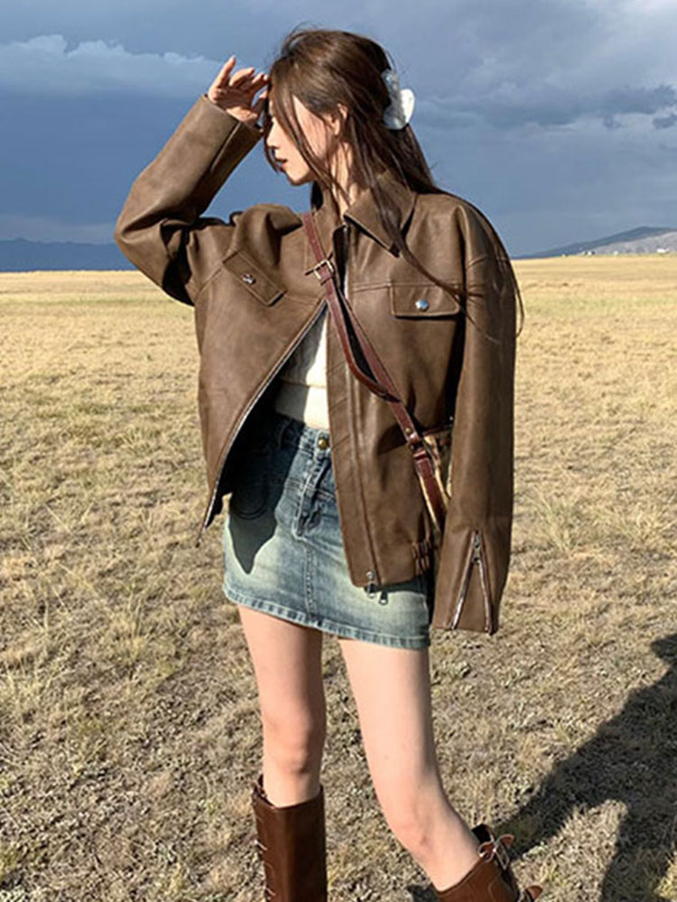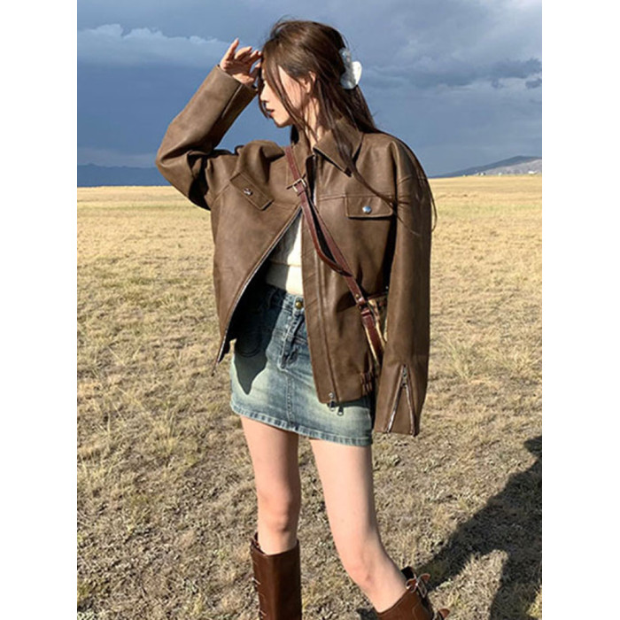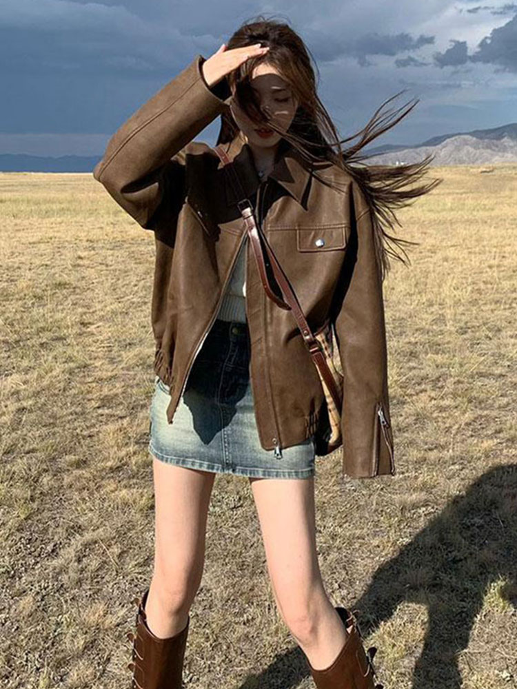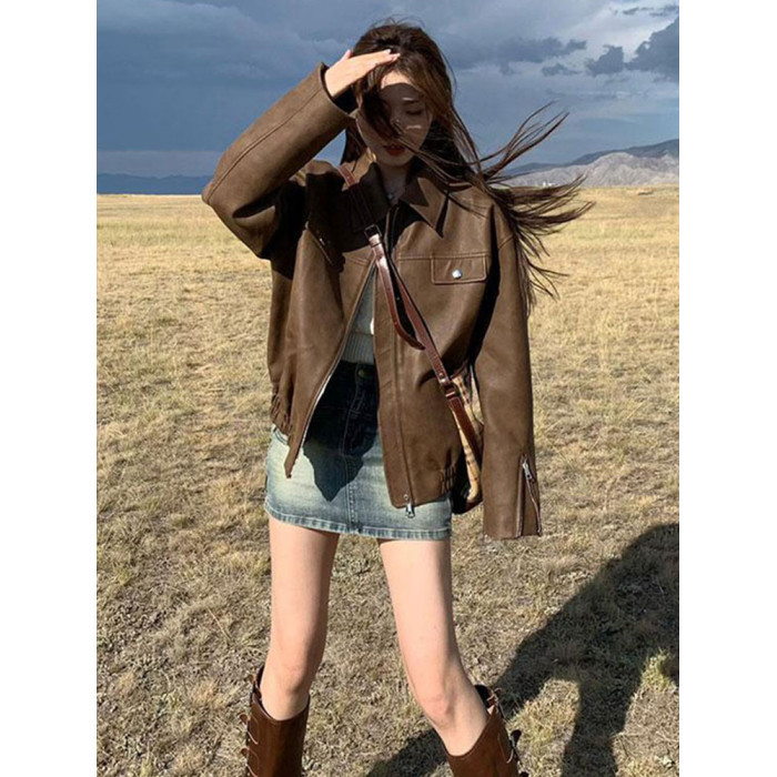美式復古咖色機車pu皮夾克女秋冬季寬松高級感超好看皮衣開衫外套