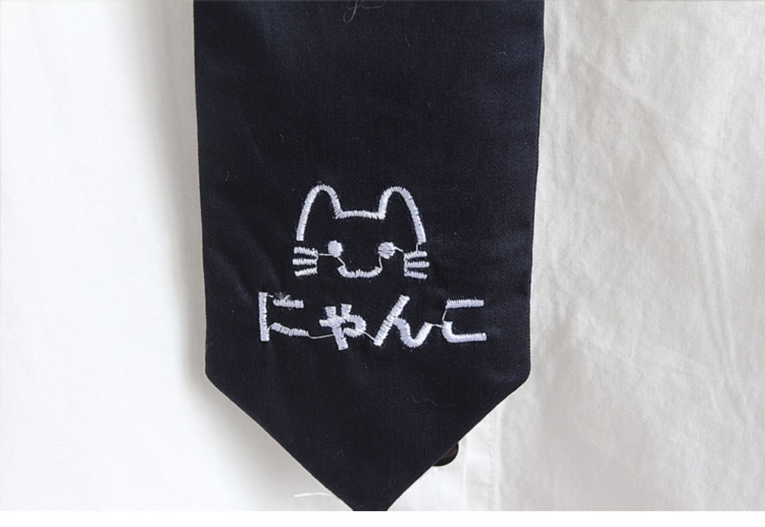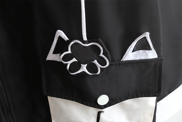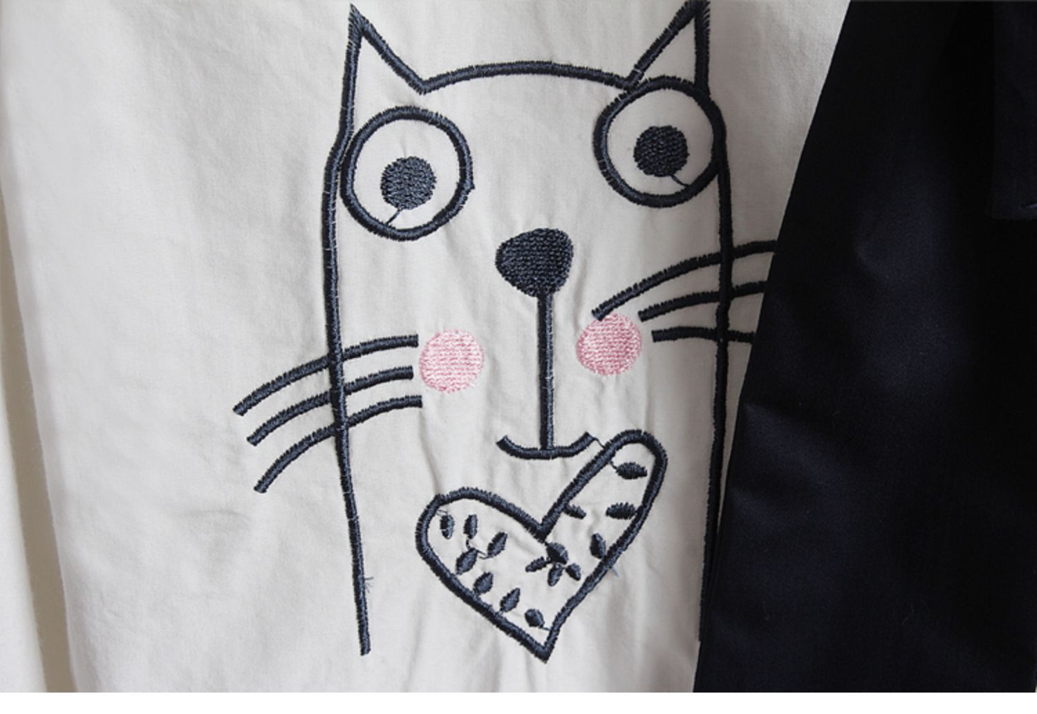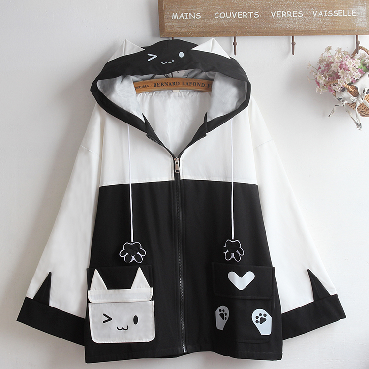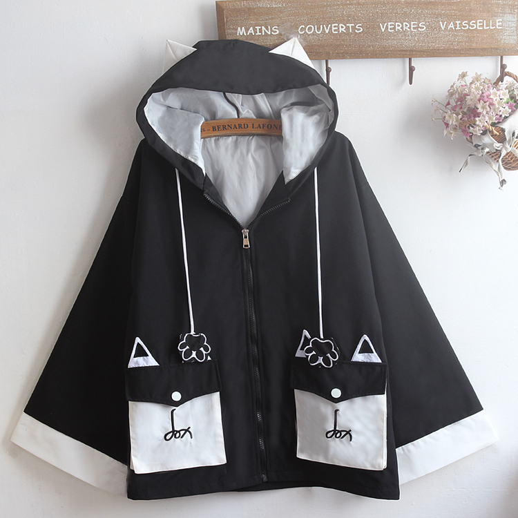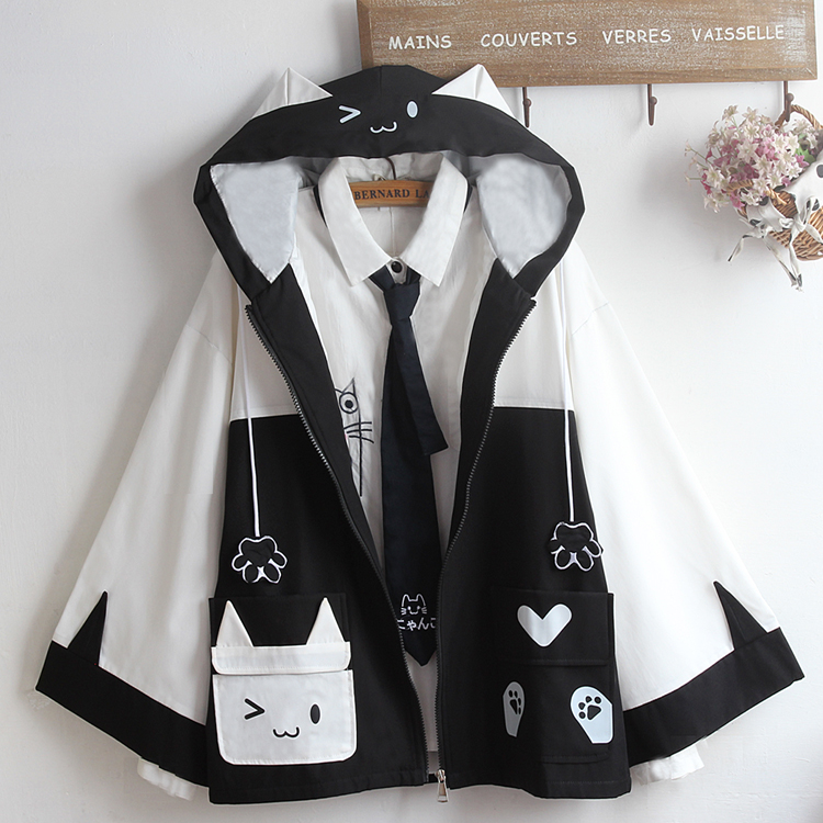男女同款可愛拼色喇叭袖鬭篷春秋外套表情貓口袋印花寬松減齡開衫