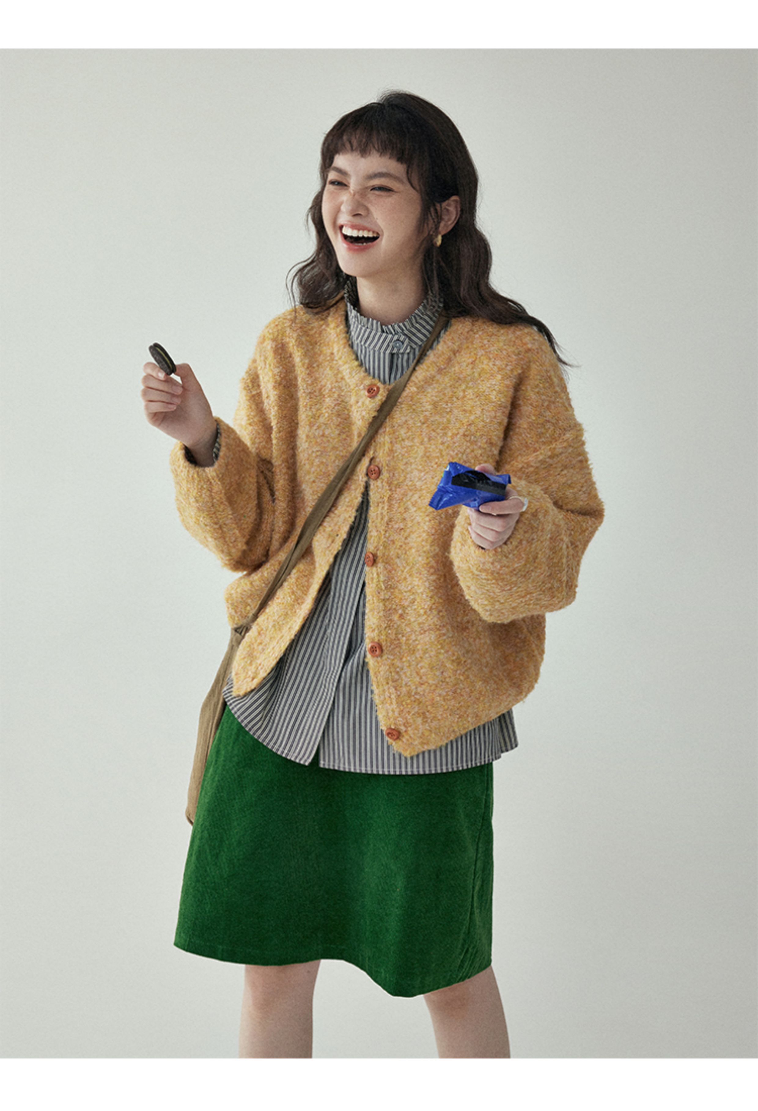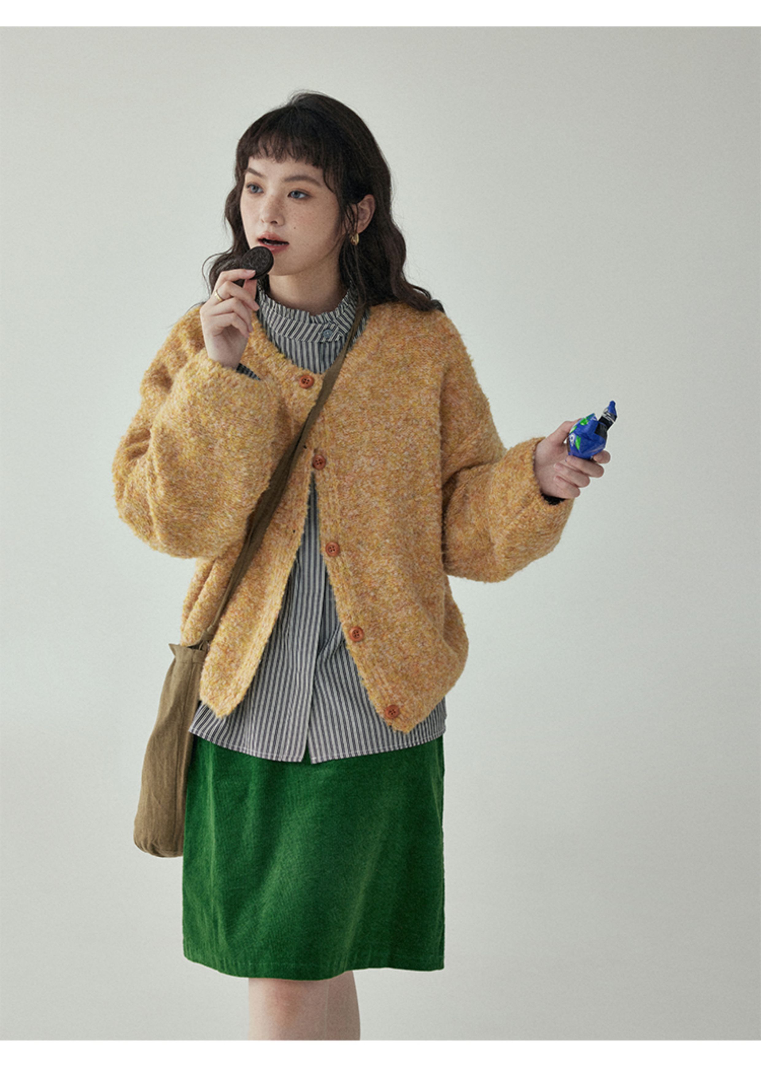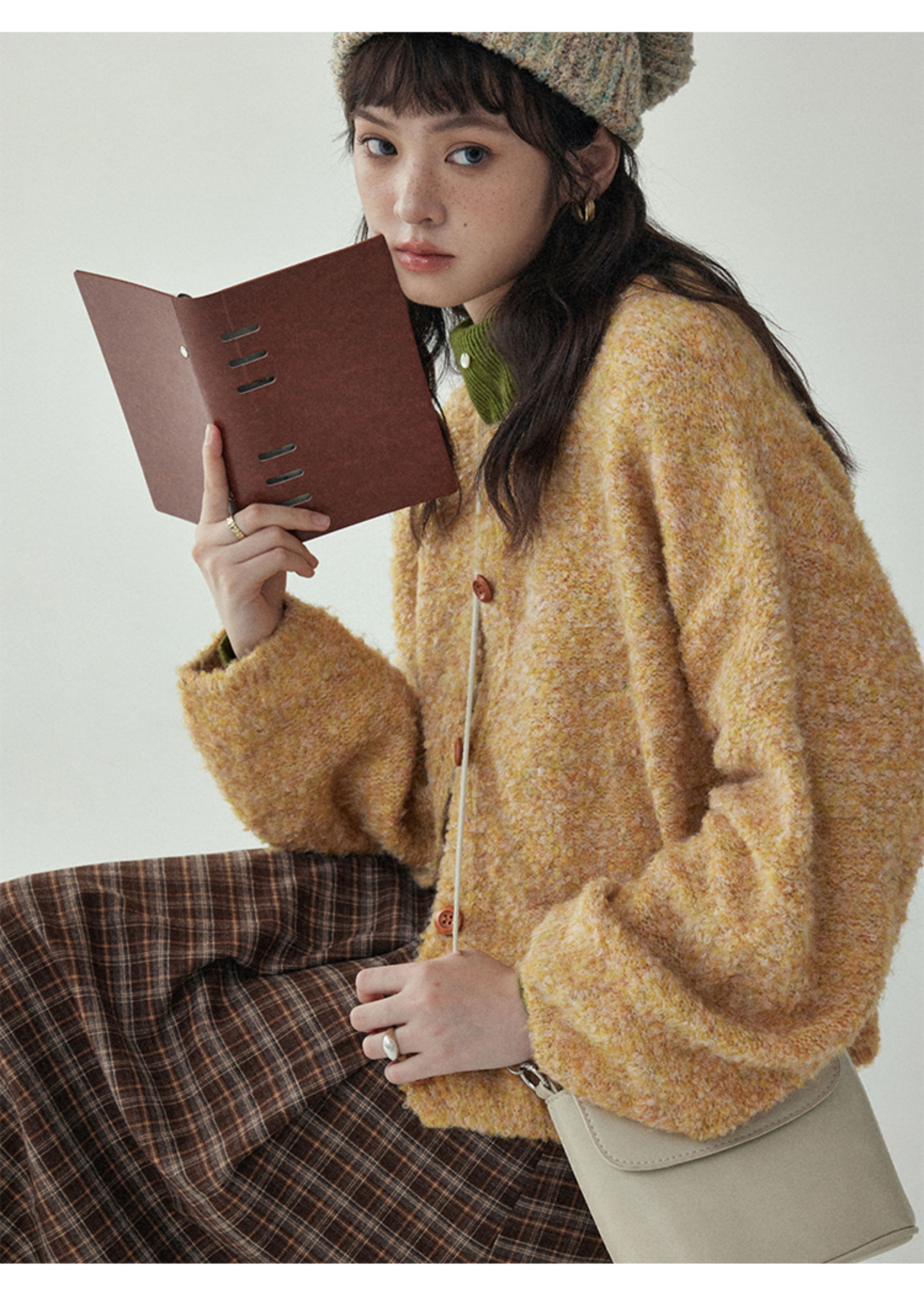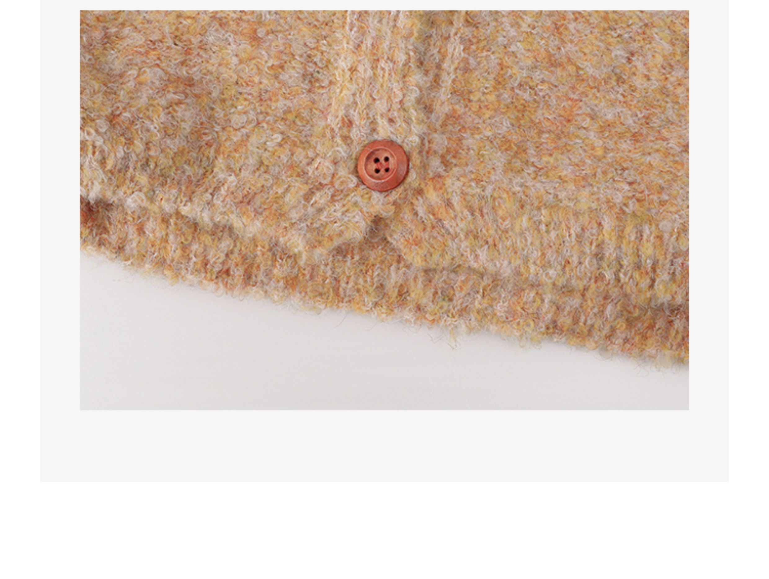 「北島AMUU」黃色短款花雜圈圈針織開衫女秋冬羊毛毛衣外套上衣