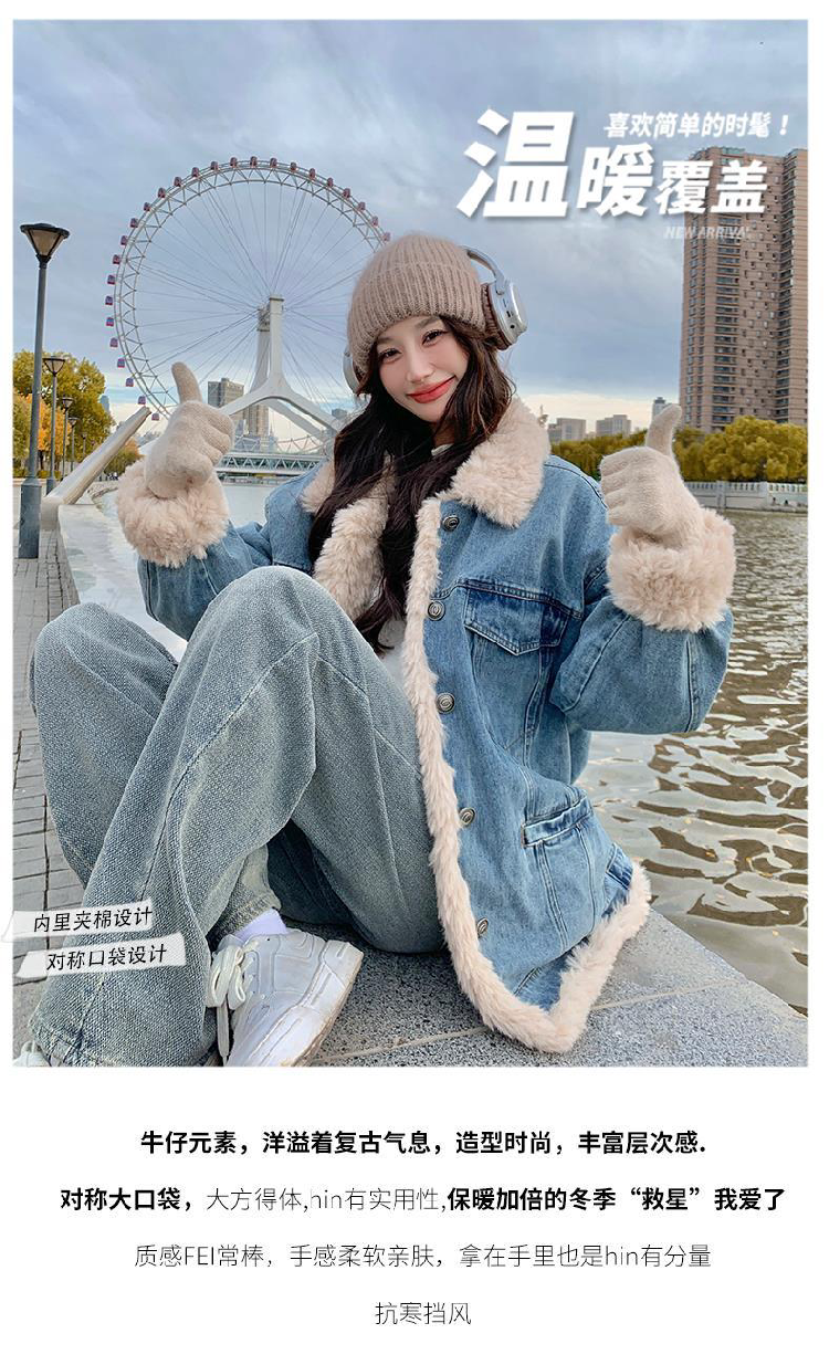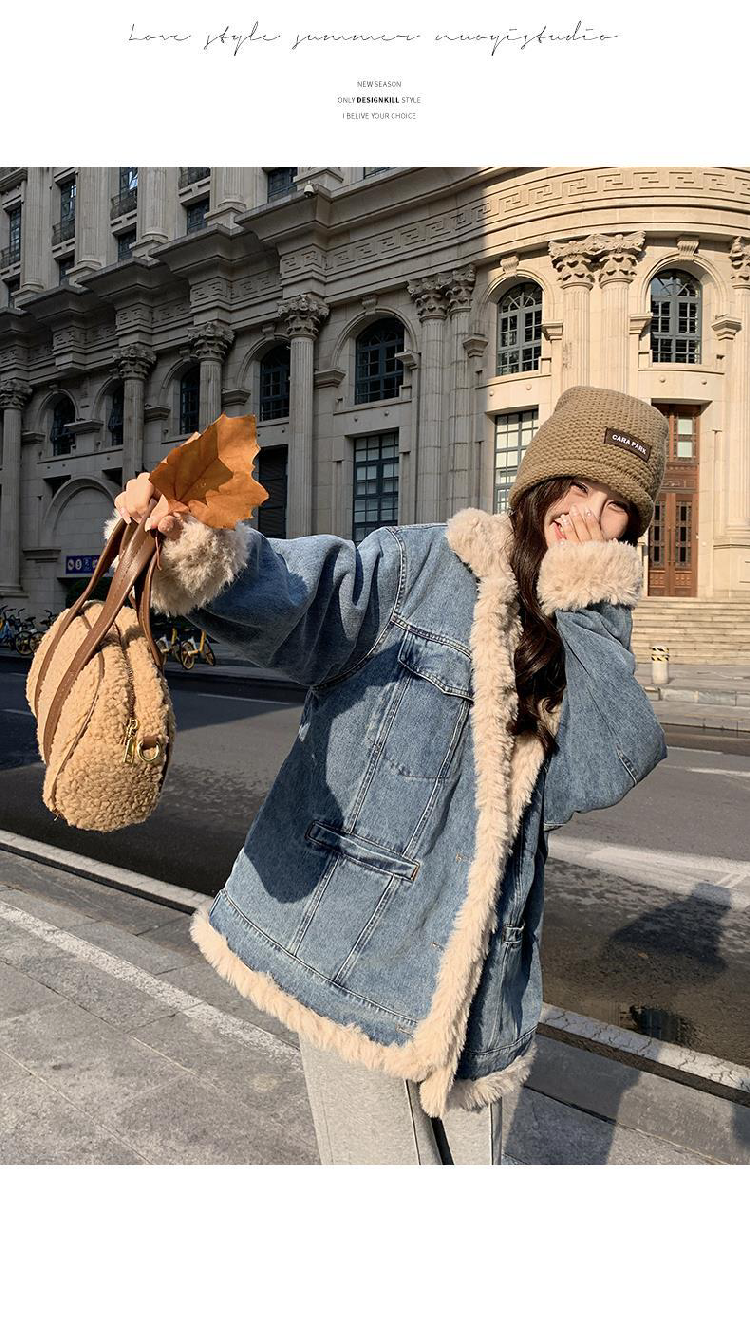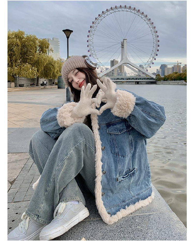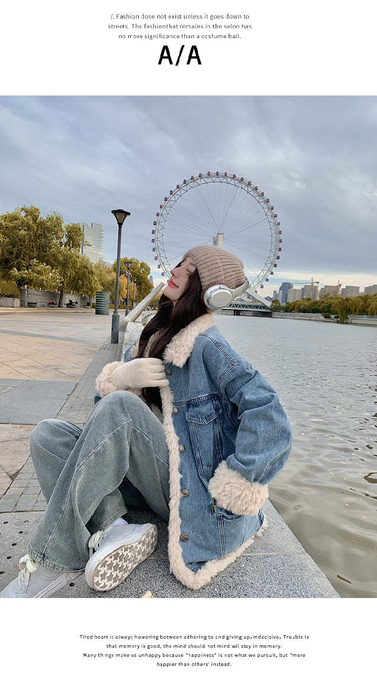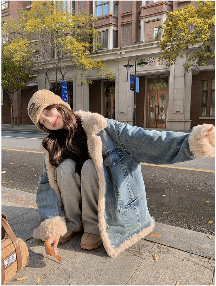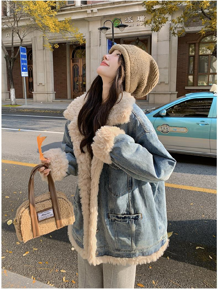 日系復古羊羔毛牛仔外套女冬季爆款寬松加絨棉衣服小個子加厚棉襖
