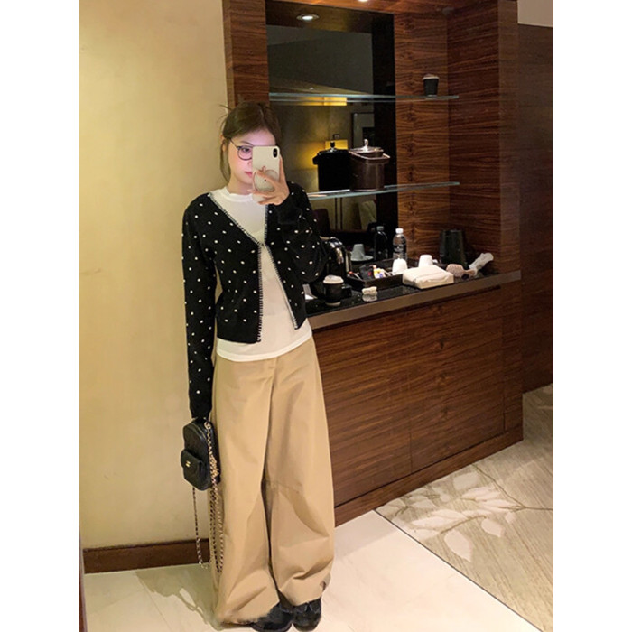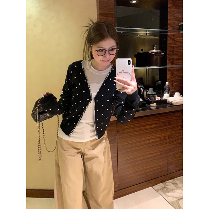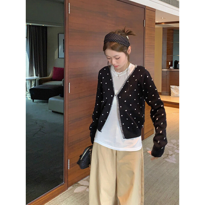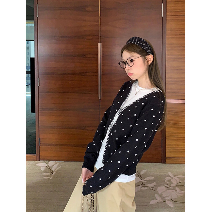 黑色V領波點開衫2025年新款曡穿設計感百搭顯瘦長袖上衣慵嬾外套
