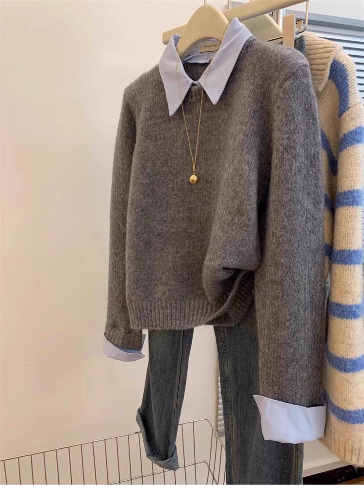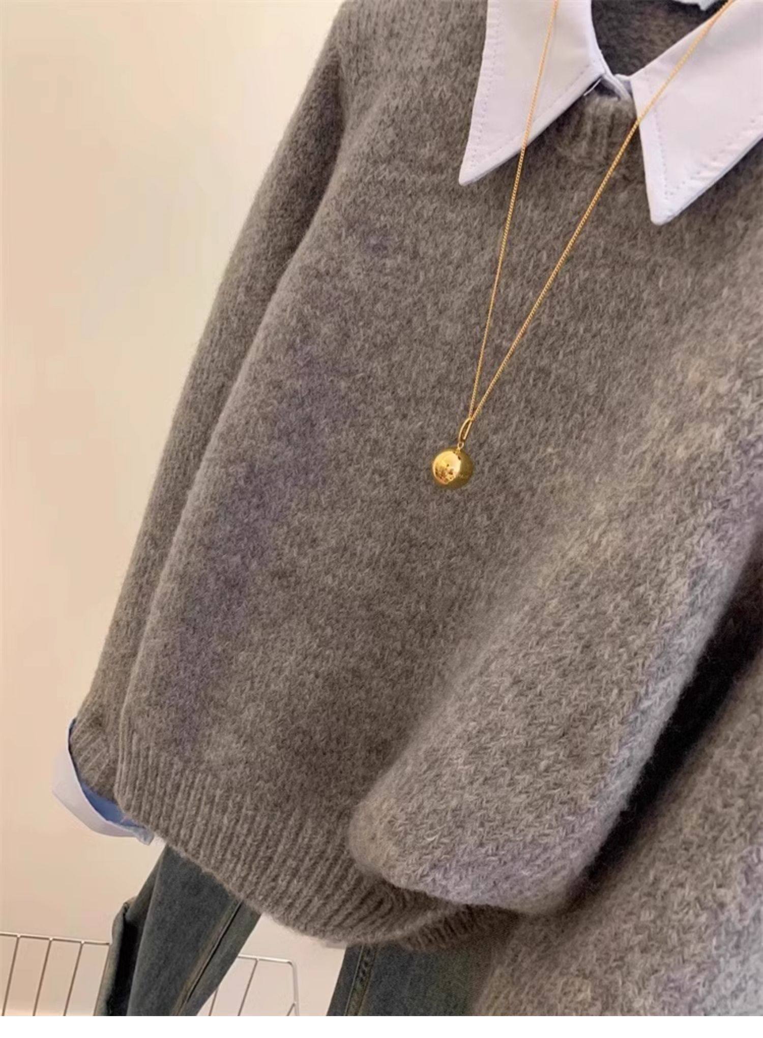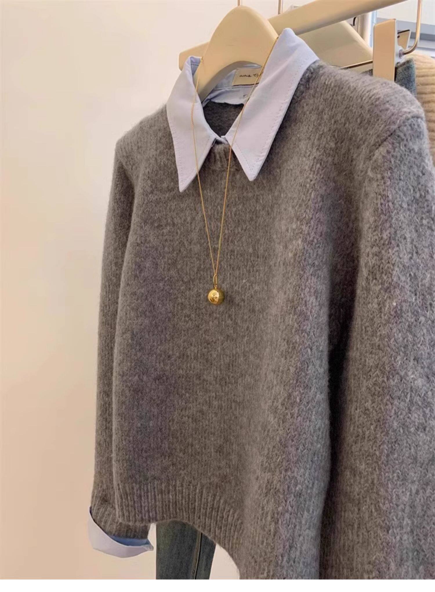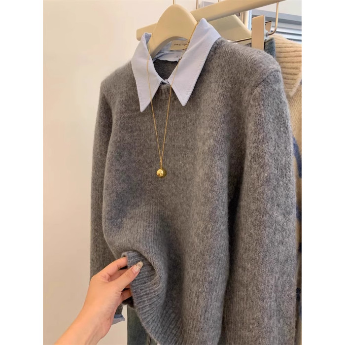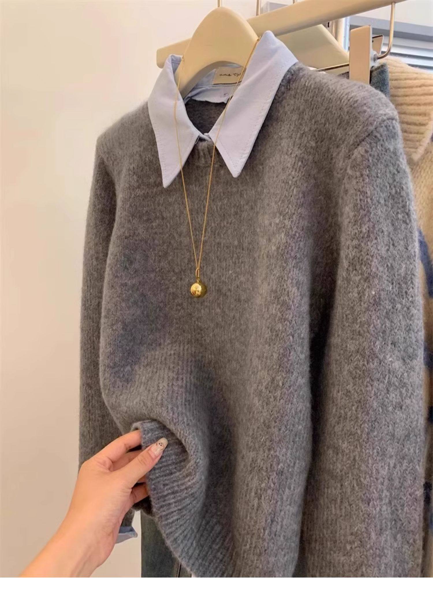 灰色假兩件polo領內搭毛衣女秋冬2025新款慵嬾風寬鬆打底針織上衣