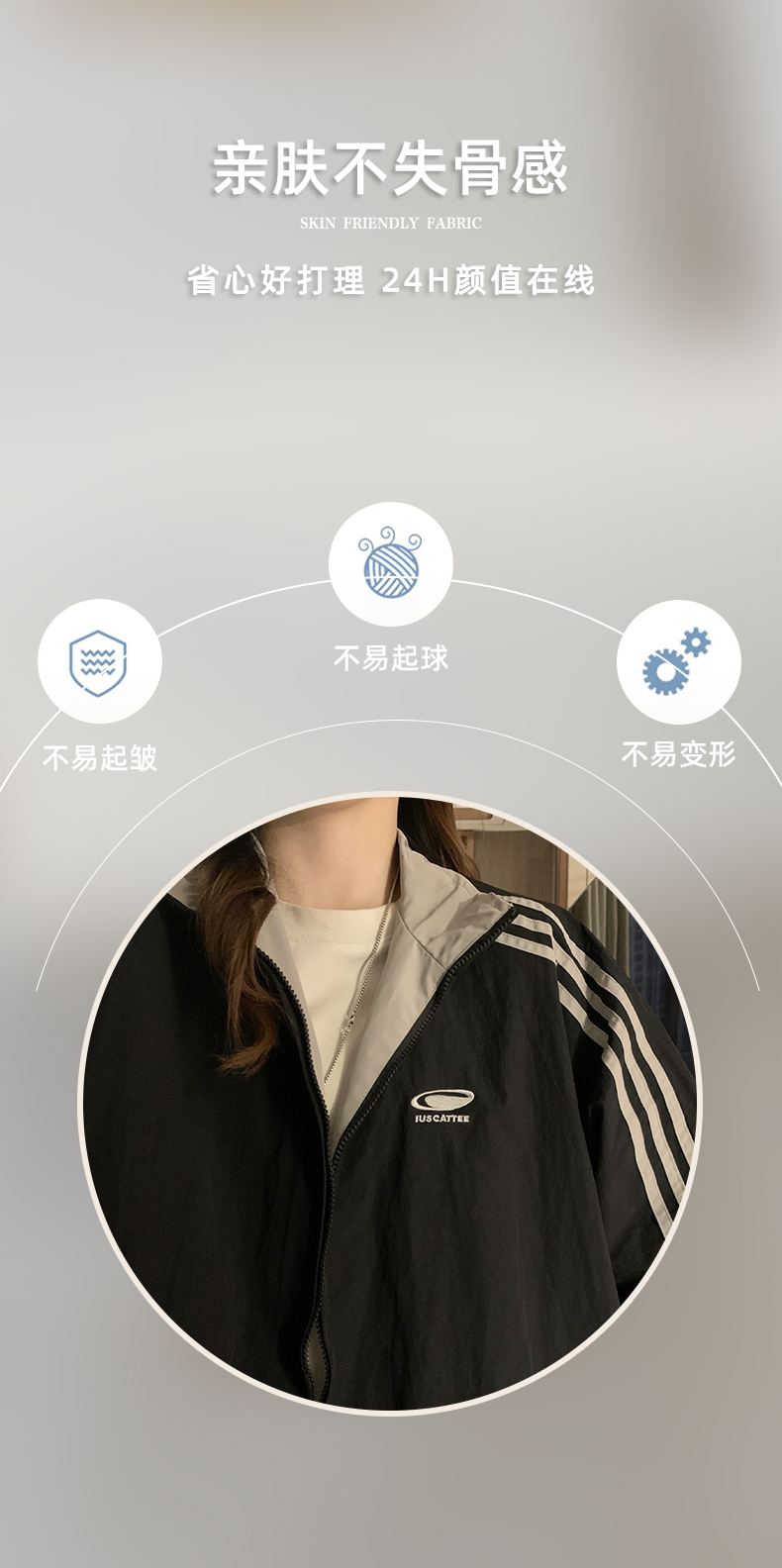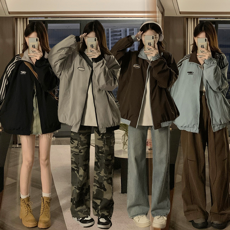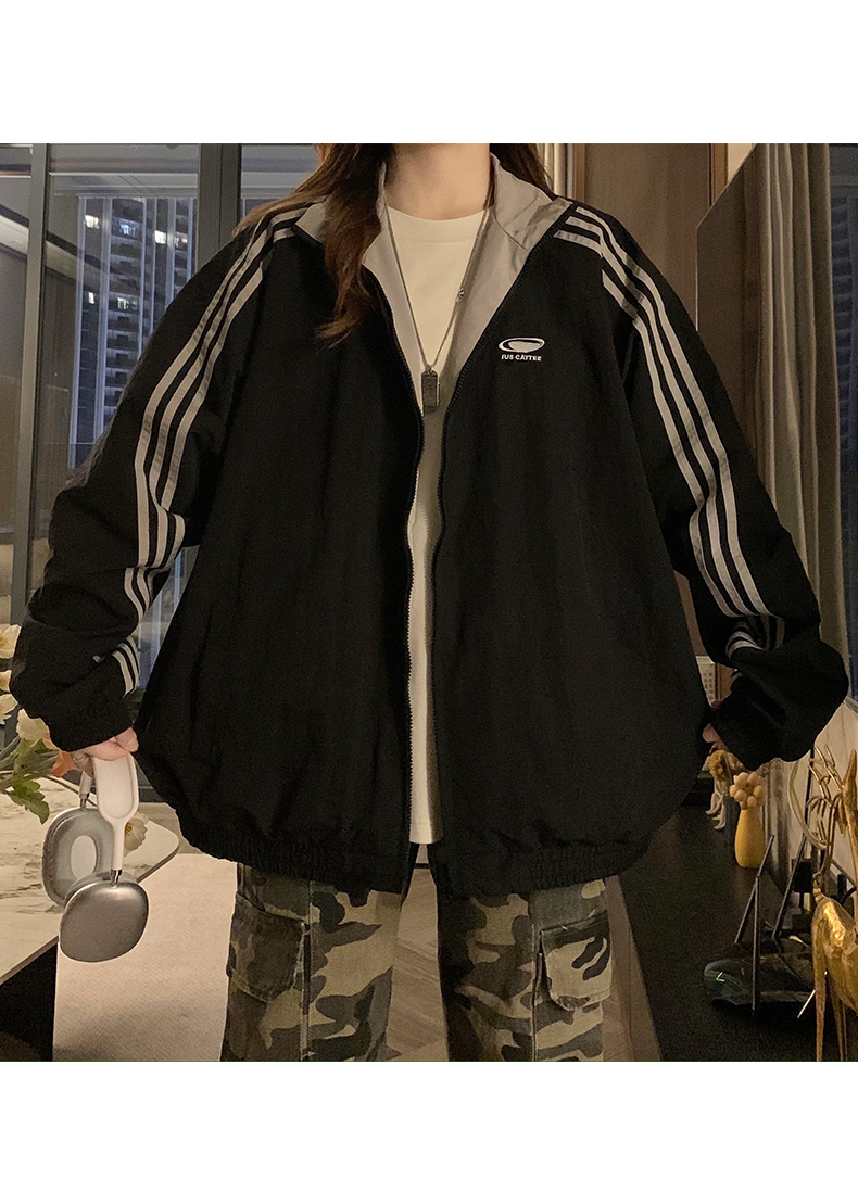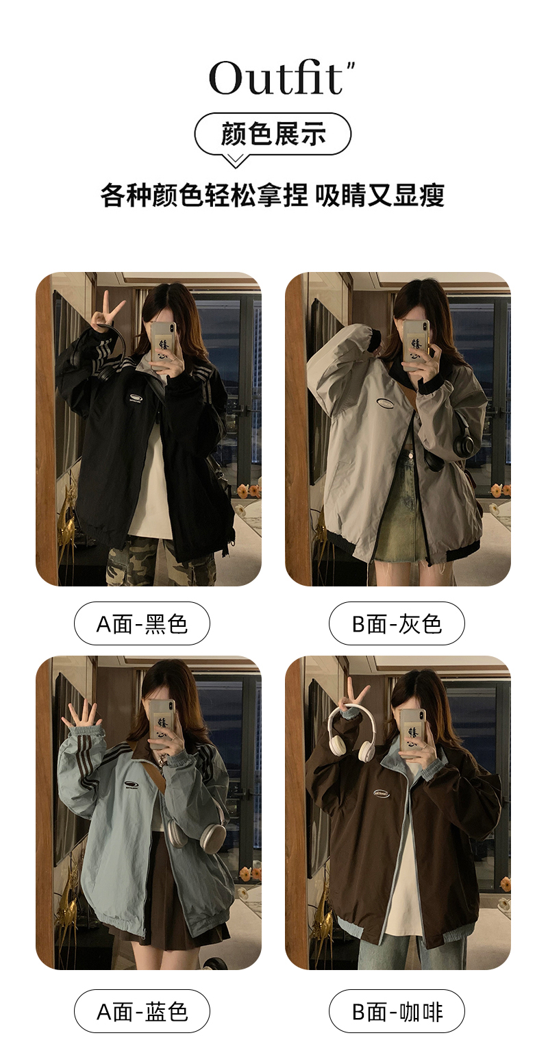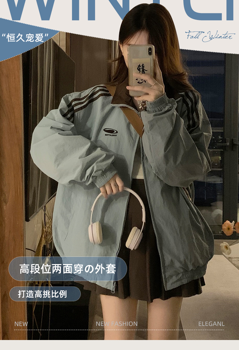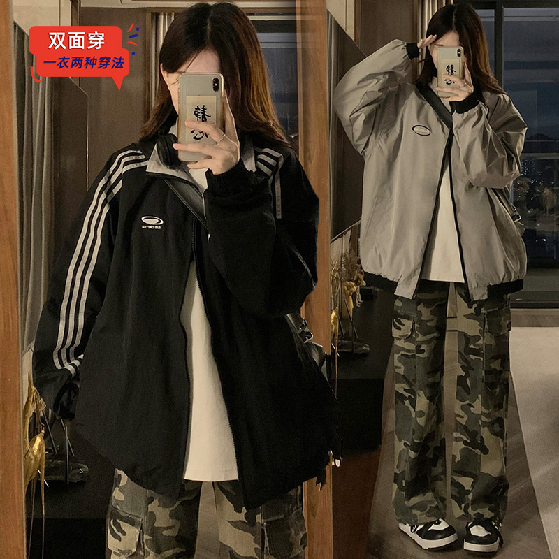 2025春秋新款正反兩面穿三條杠外套男女美式復古寬松情侶運動夾克