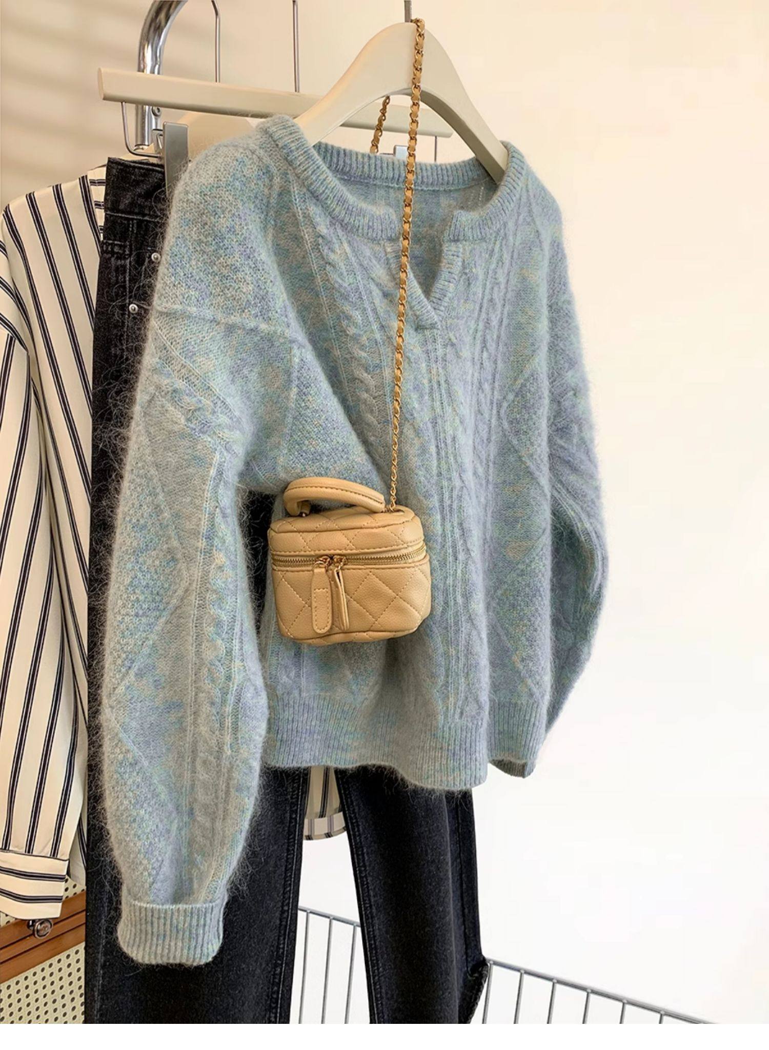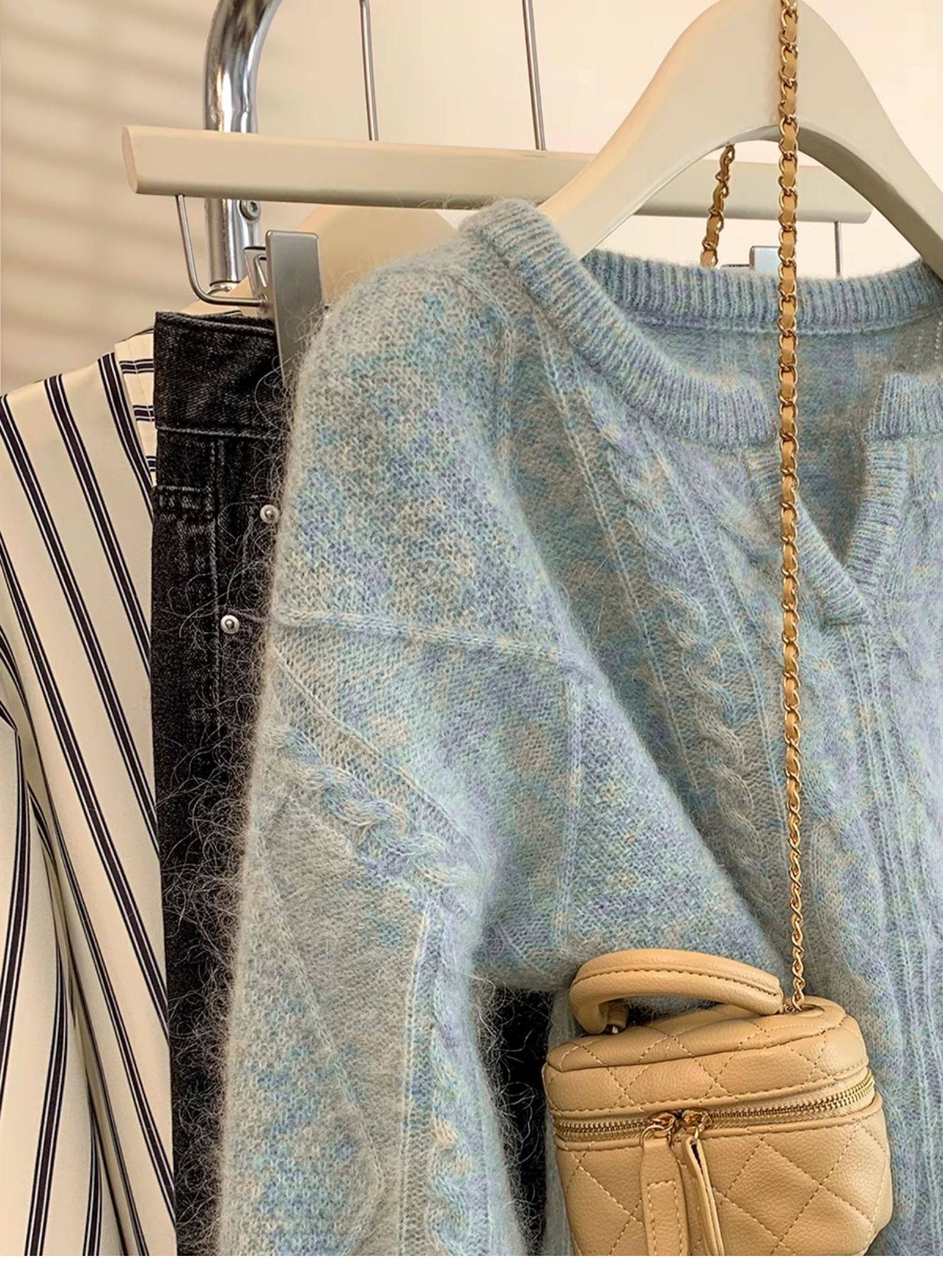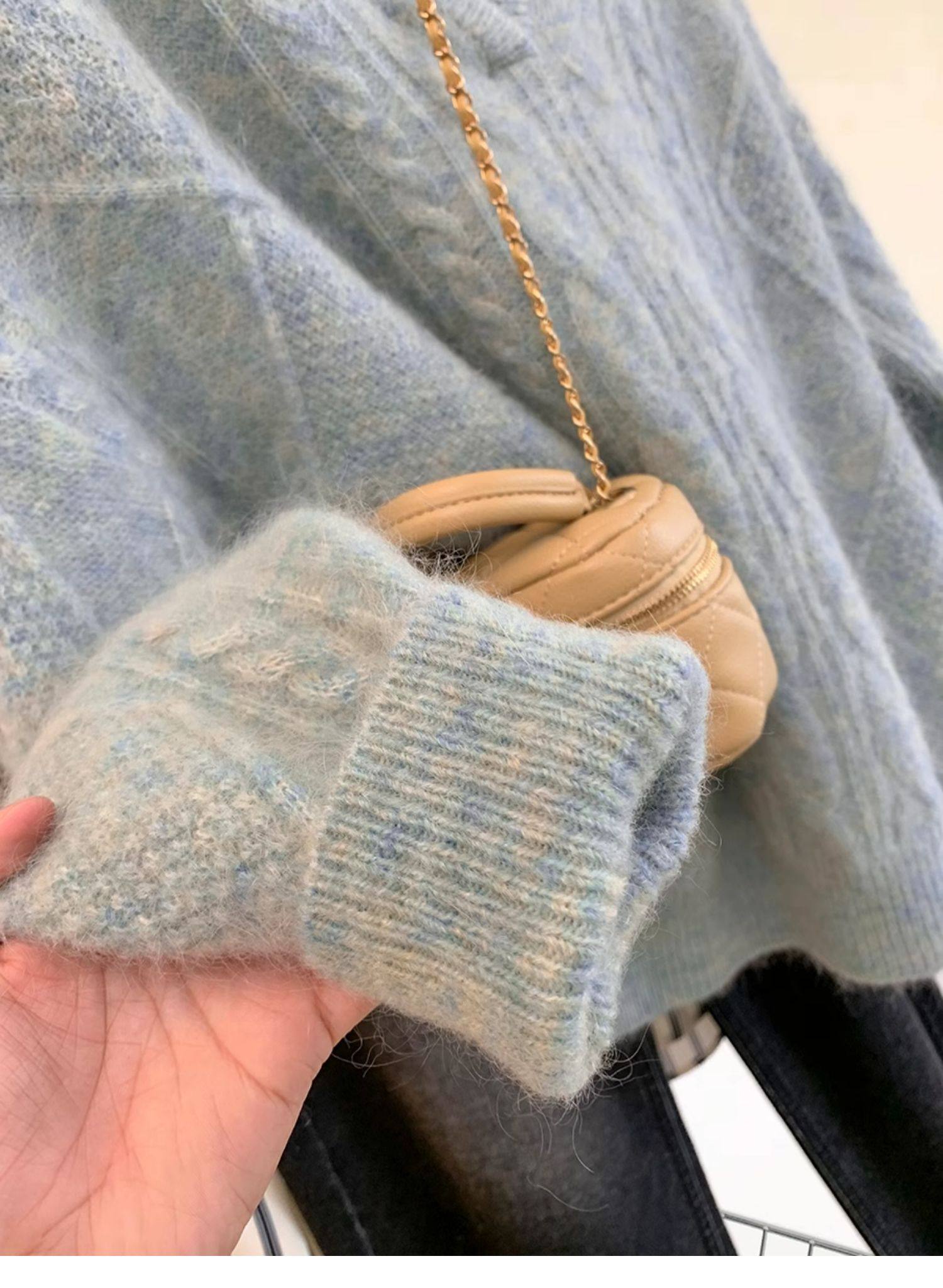 藍色麻花v領套頭毛衣女裝秋冬2025新款慵嬾風軟糯加厚羊毛針織衫